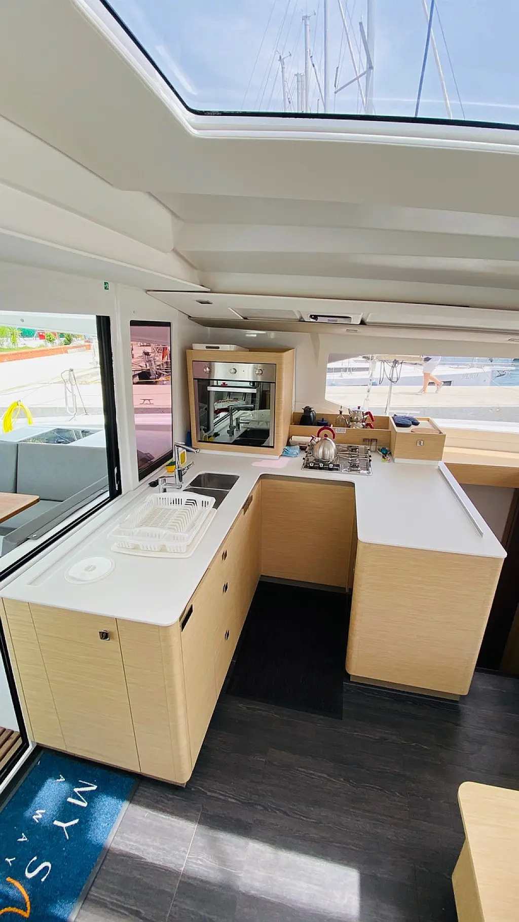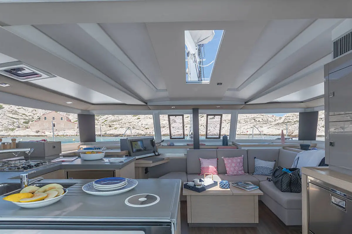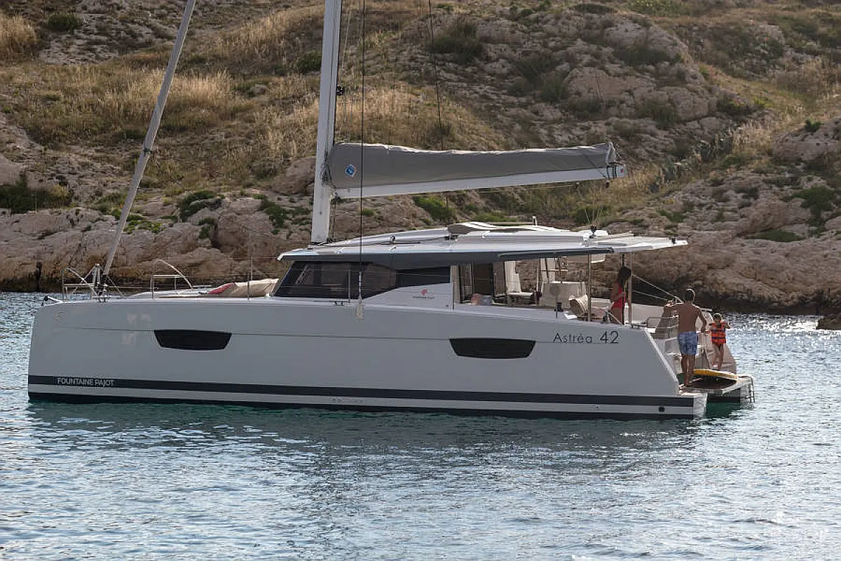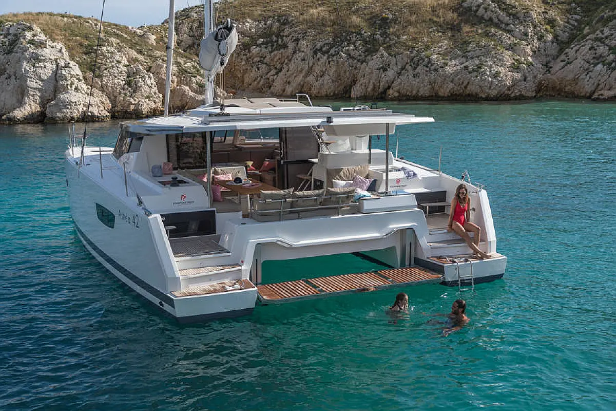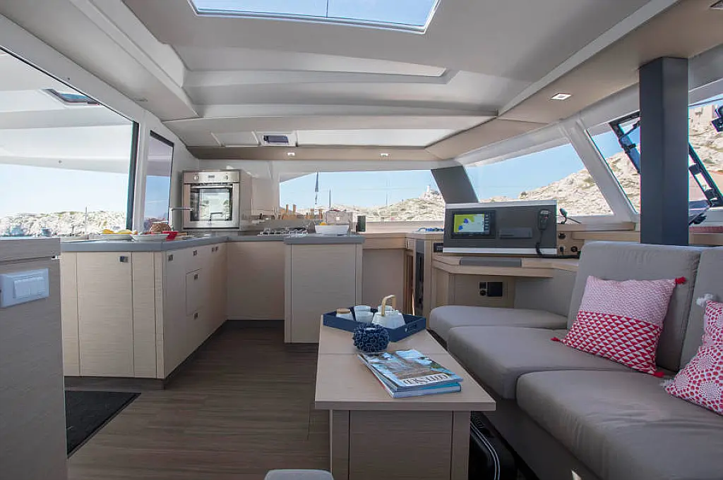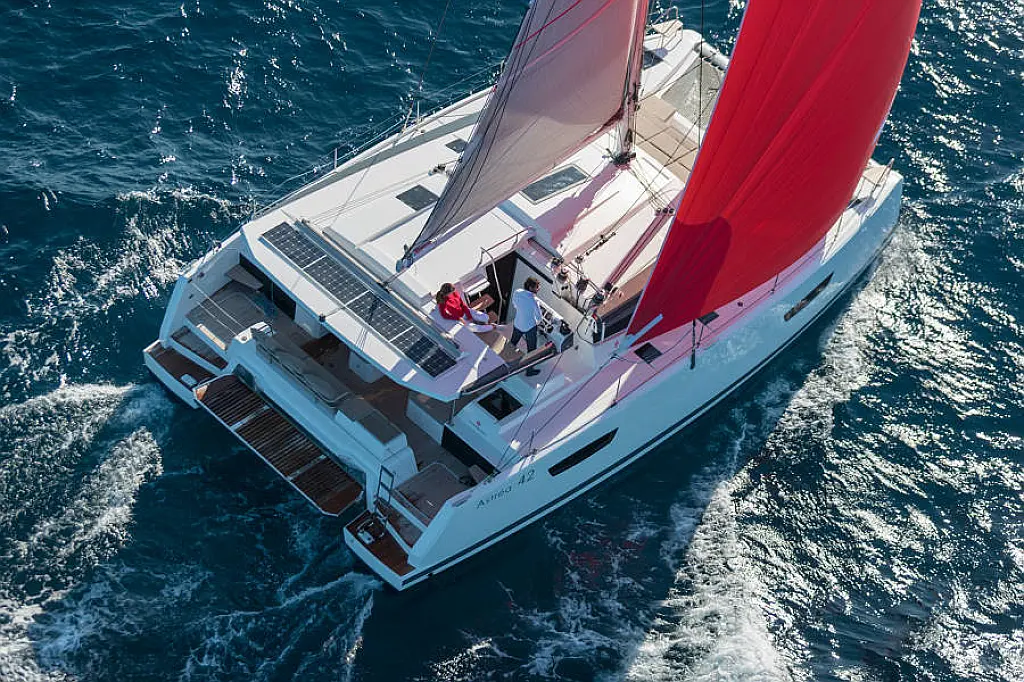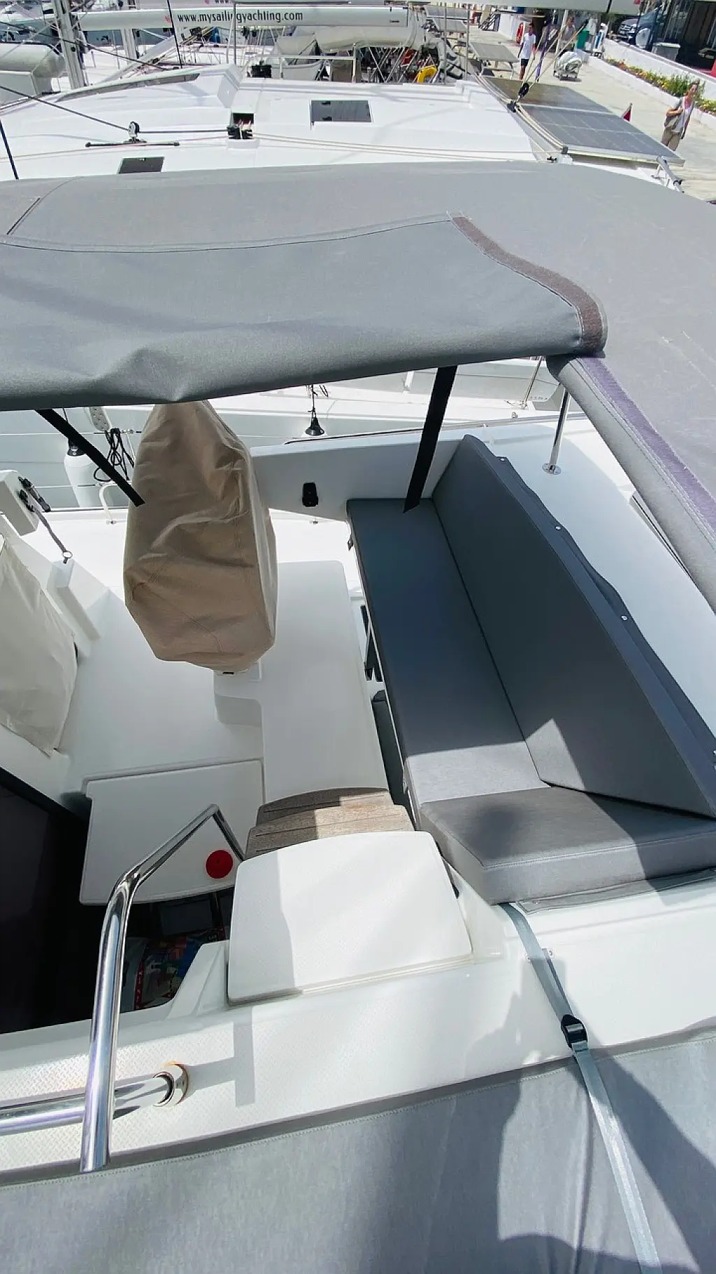 Solar-Panele, Klimaanlage, Inverter, Kühlschrank, Beiboot, Cockpit-Kissen, Außenbordmotor, Elektrische Winch (Segel), Generator, Wassermacher