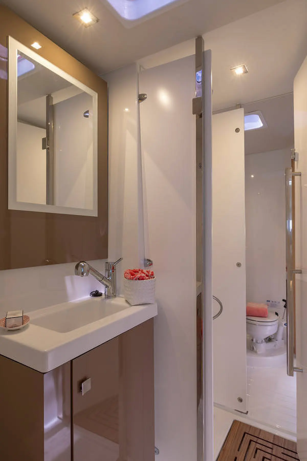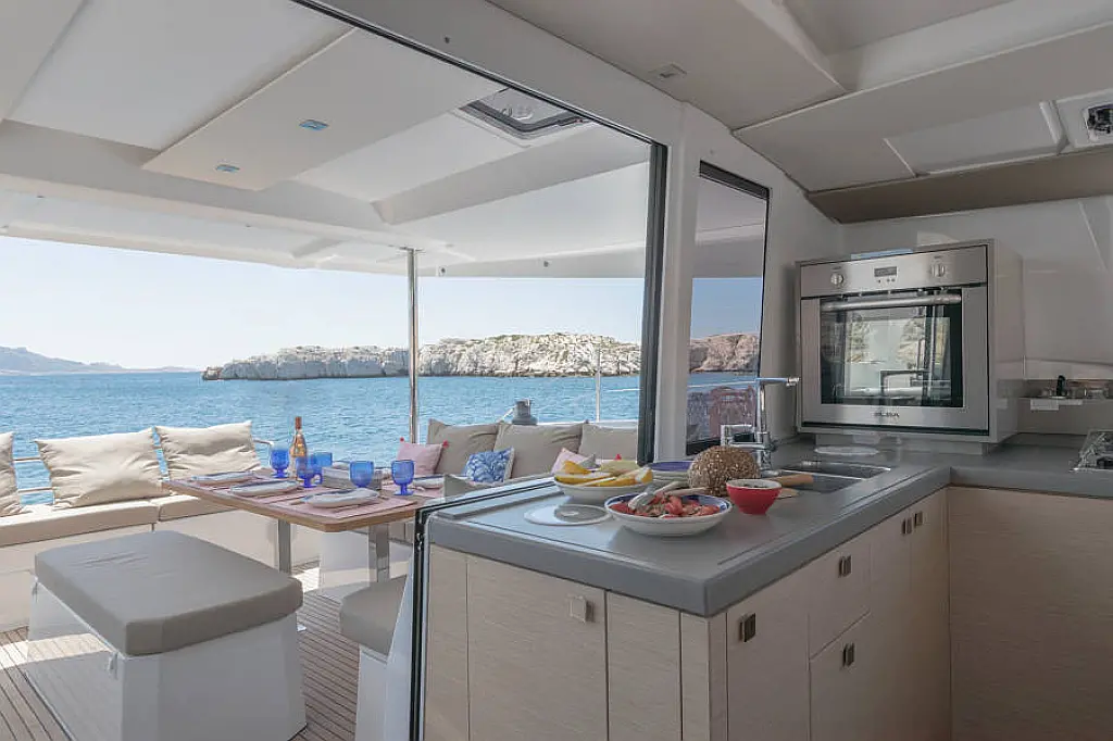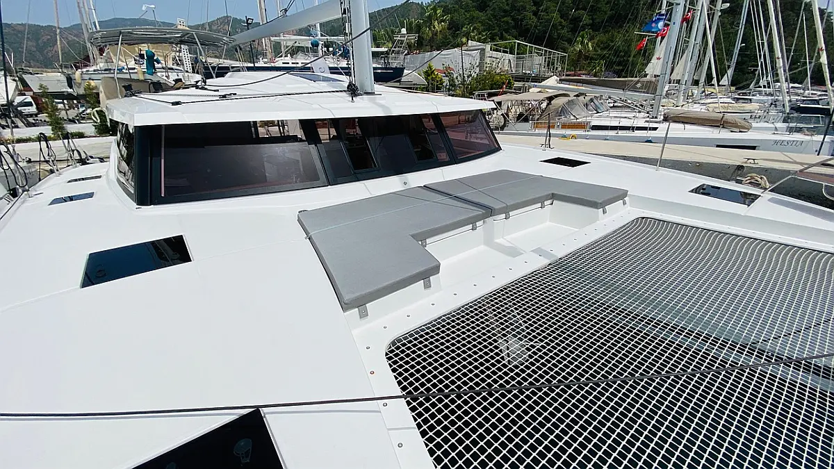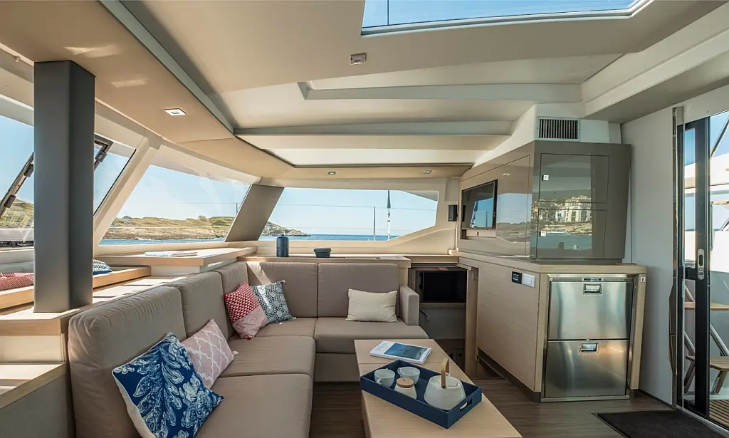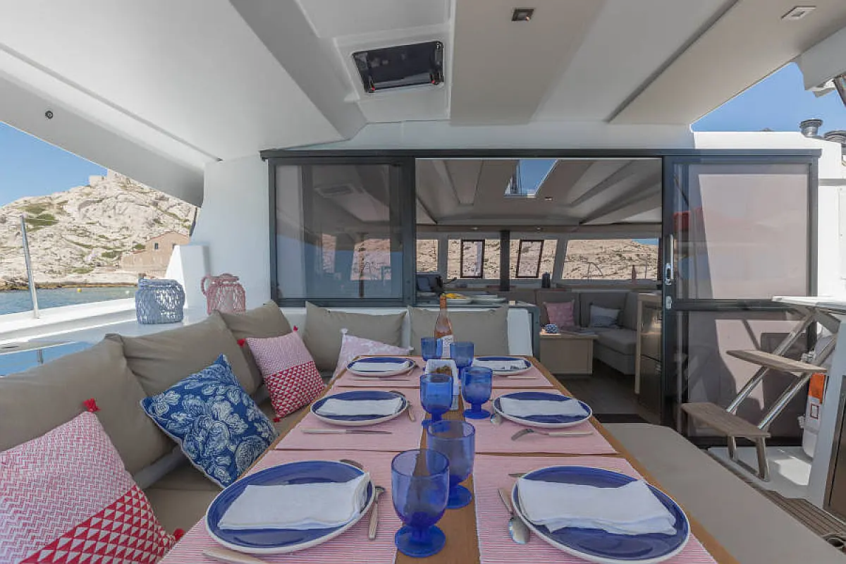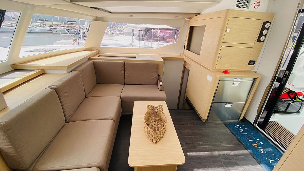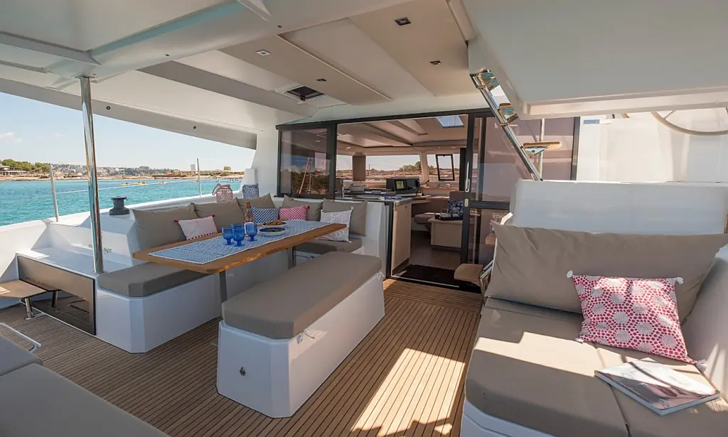 Solar-Panele, Klimaanlage, Inverter, Kühlschrank, Beiboot, Cockpit-Kissen, Außenbordmotor, Elektrische Winch (Segel), Generator, Wassermacher