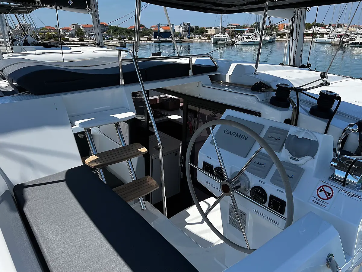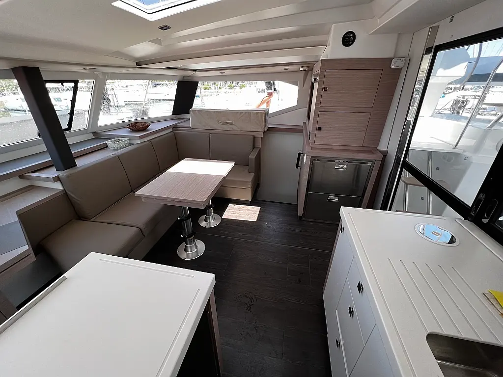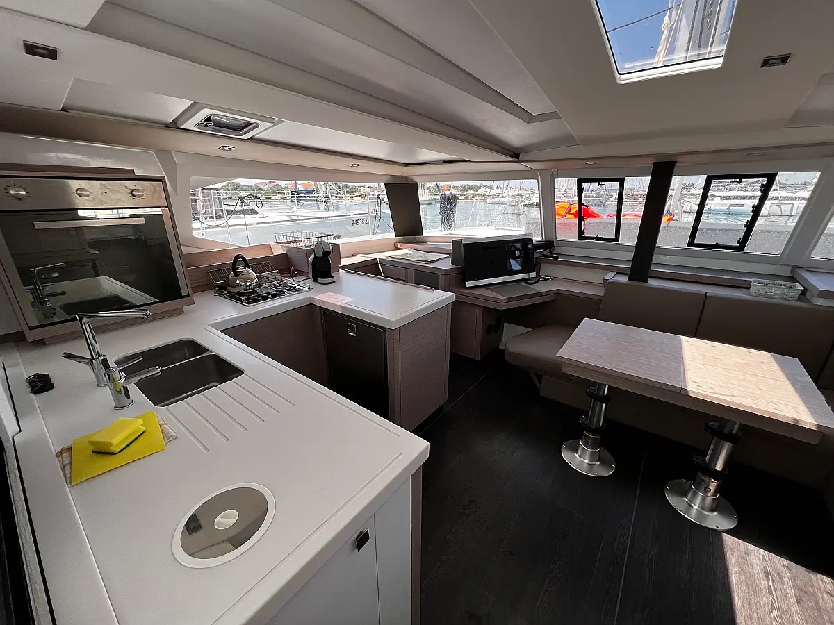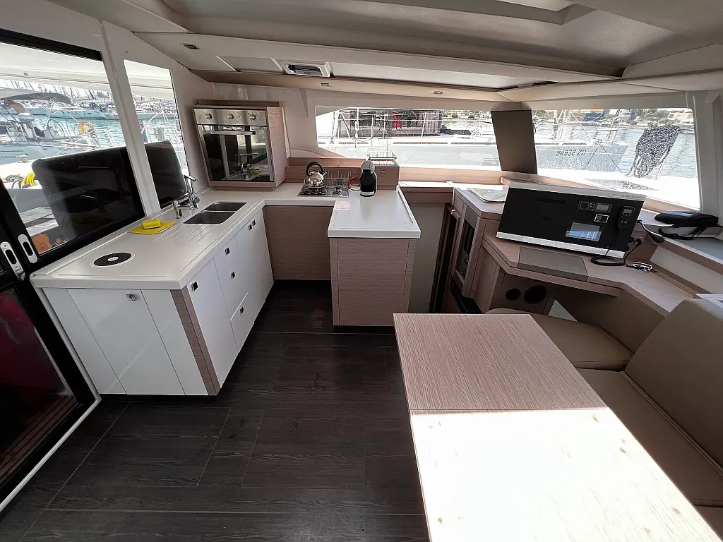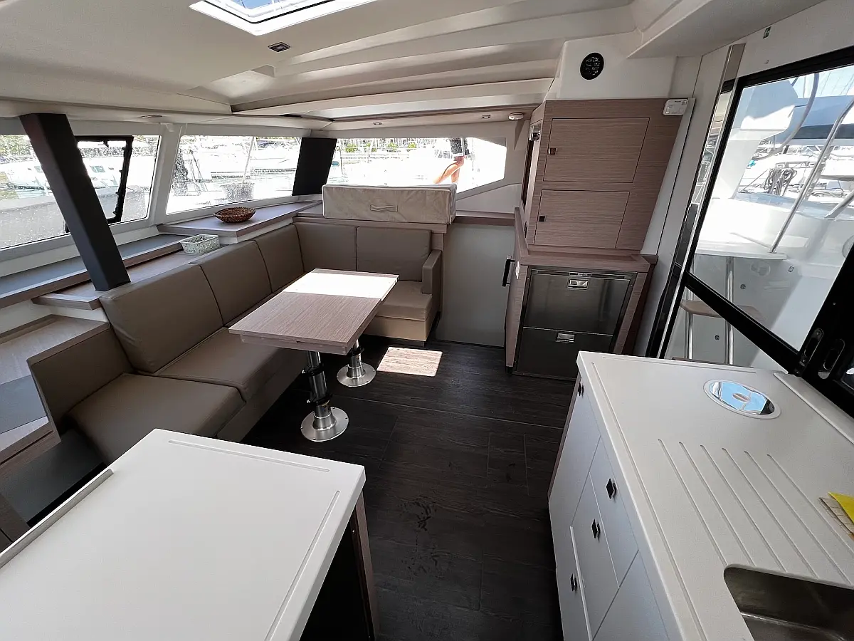 Kaffeemaschine, Eismaschine, Kühlschrank, Beiboot, Wi-Fi und Internet, Heizung, Wassermacher, Generator, Inverter, Solar-Panele, Klimaanlage, Bimini, Badeplattform, Cockpit-Kissen, Elektrische Winch (Segel)
