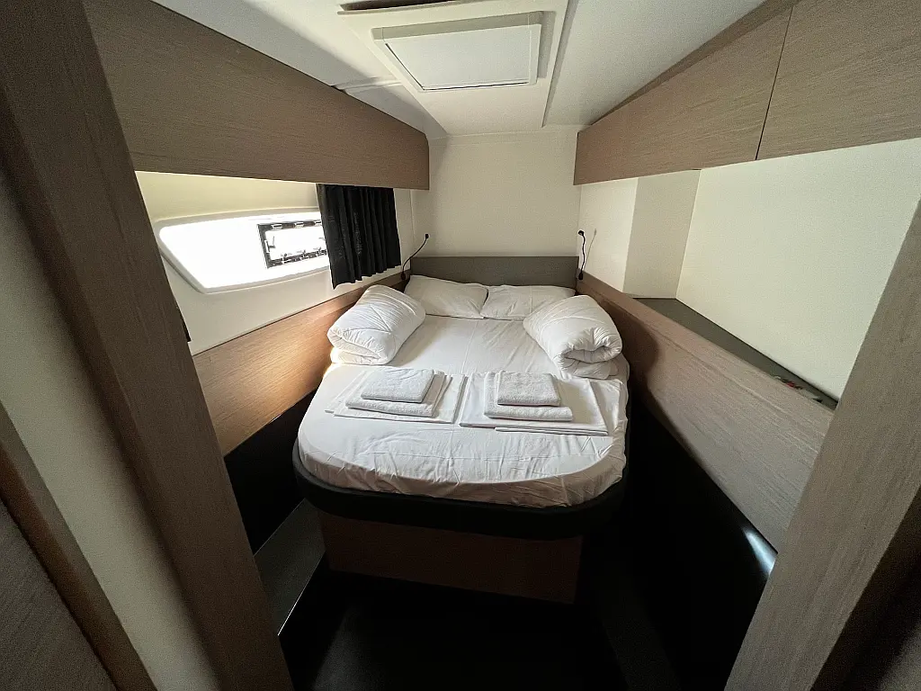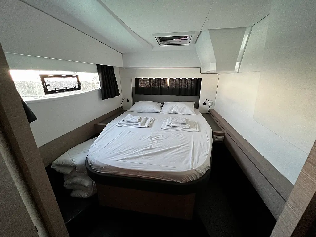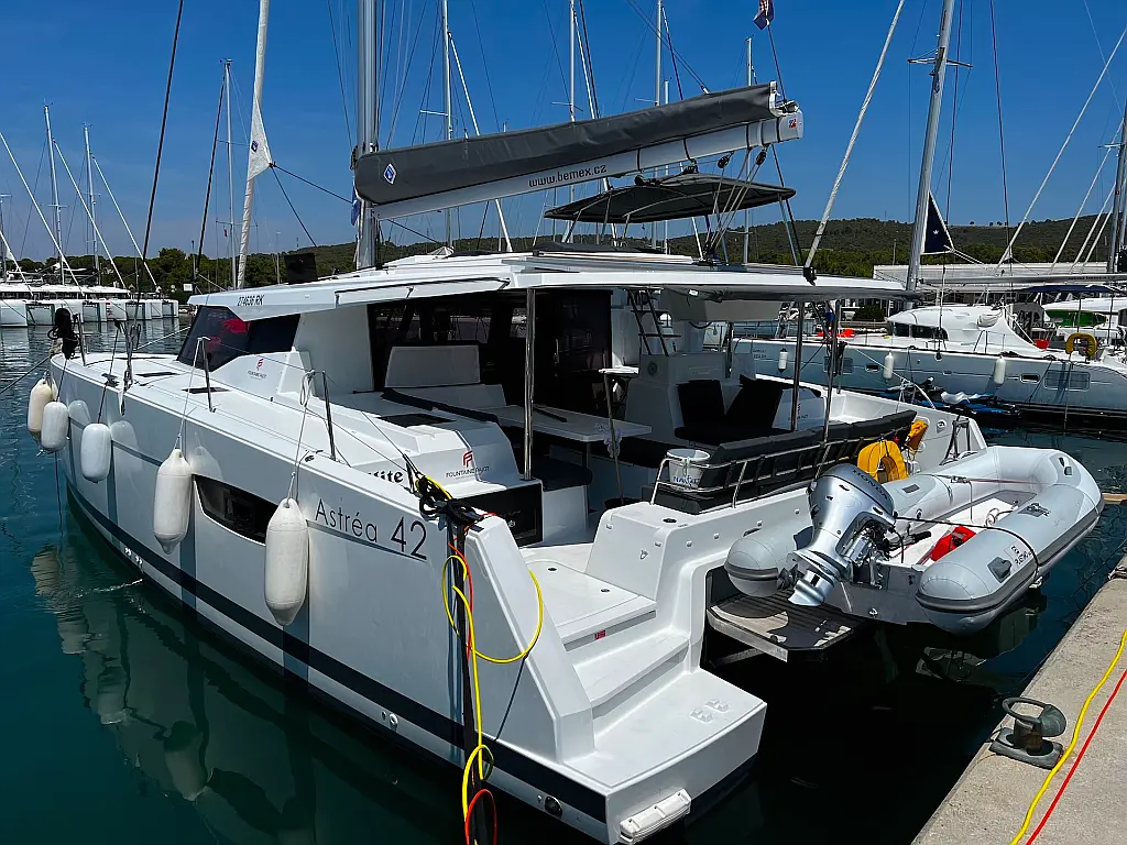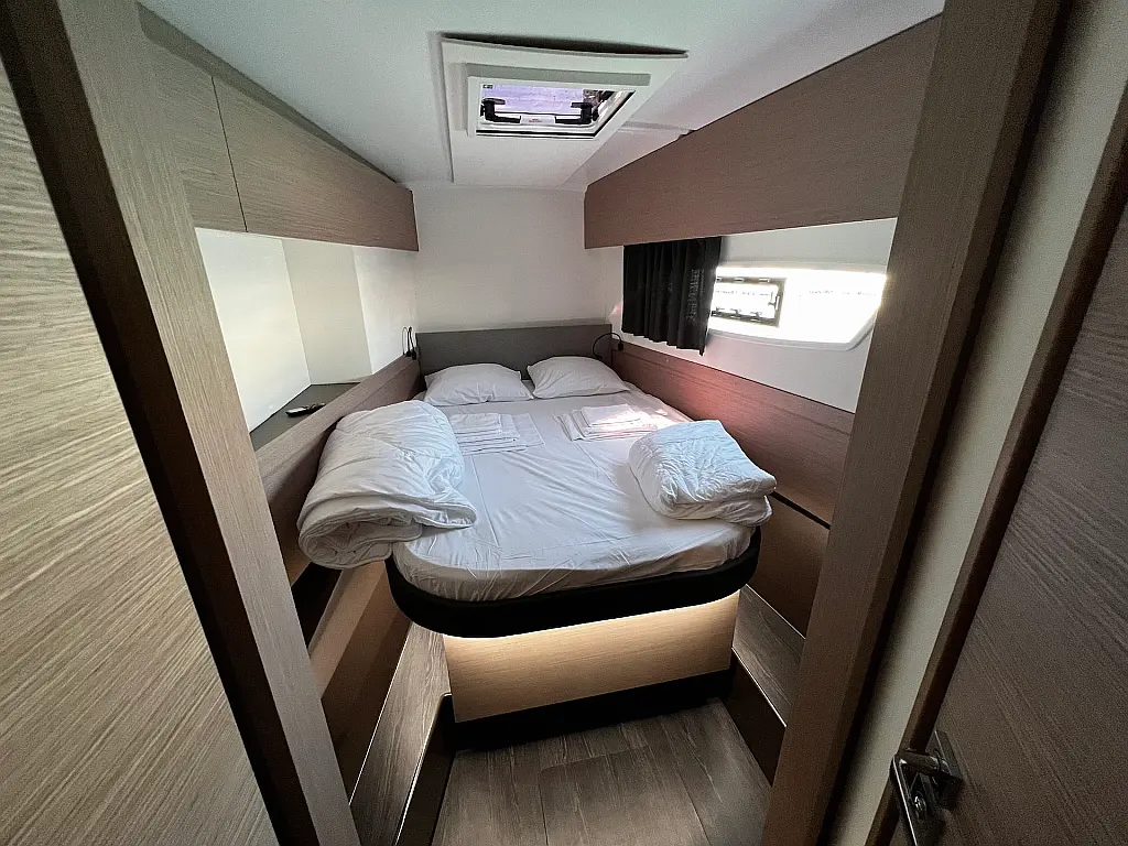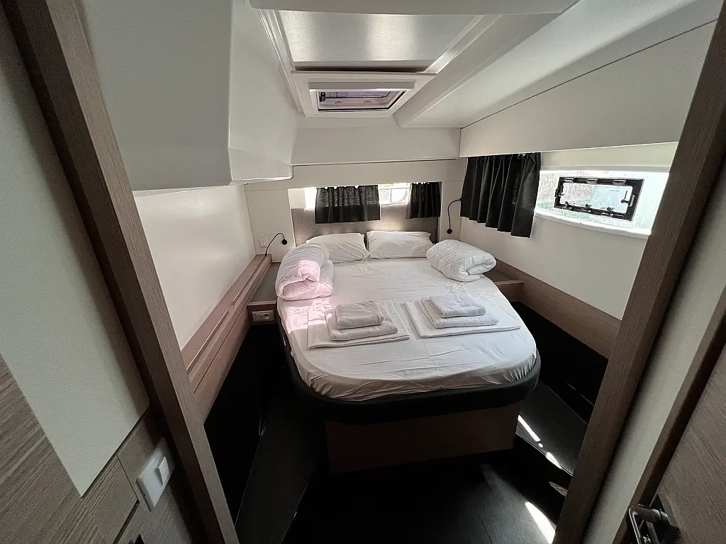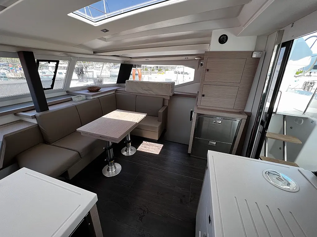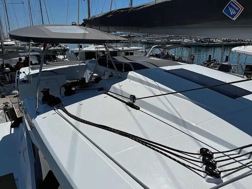 Kaffeemaschine, Eismaschine, Kühlschrank, Beiboot, Wi-Fi und Internet, Heizung, Wassermacher, Generator, Inverter, Solar-Panele, Klimaanlage, Bimini, Badeplattform, Cockpit-Kissen, Elektrische Winch (Segel)