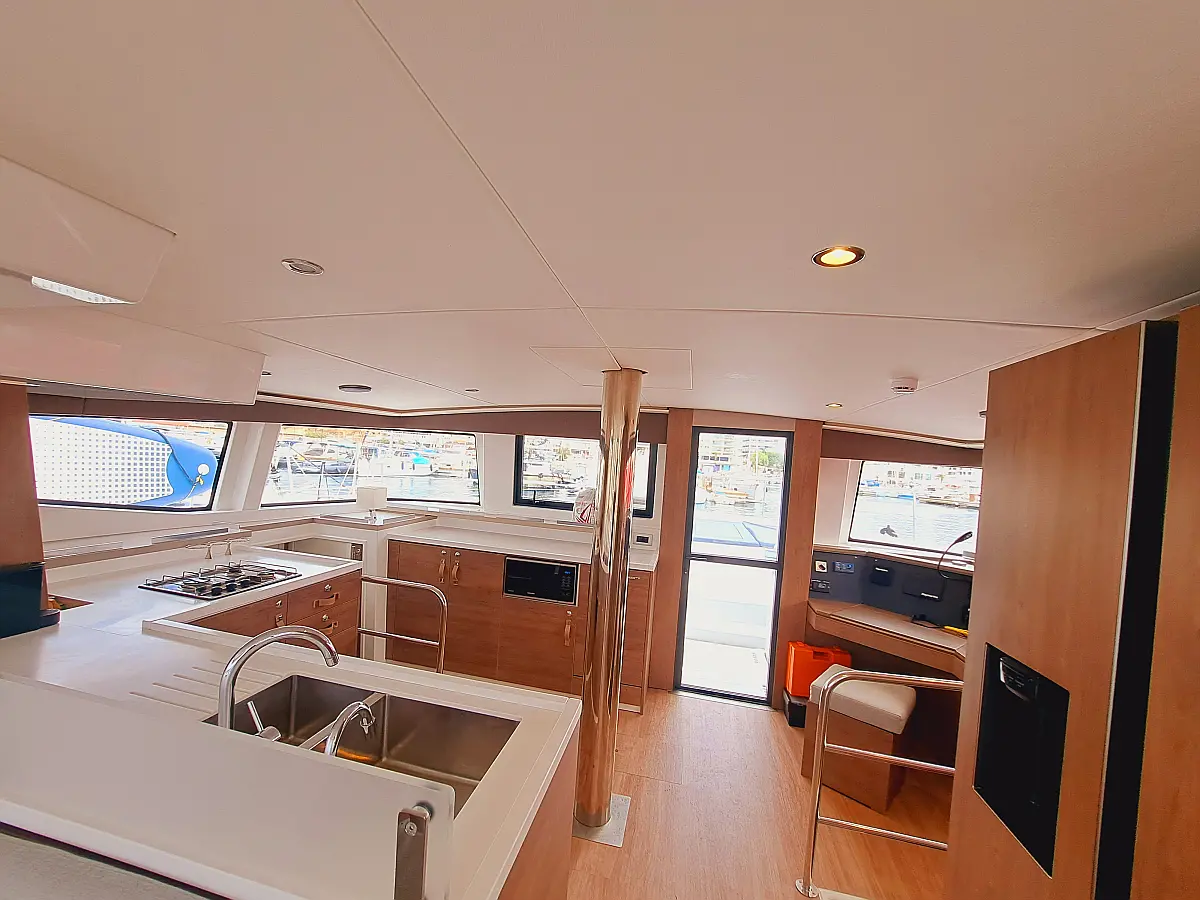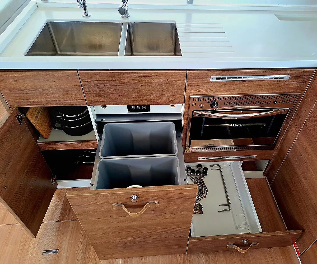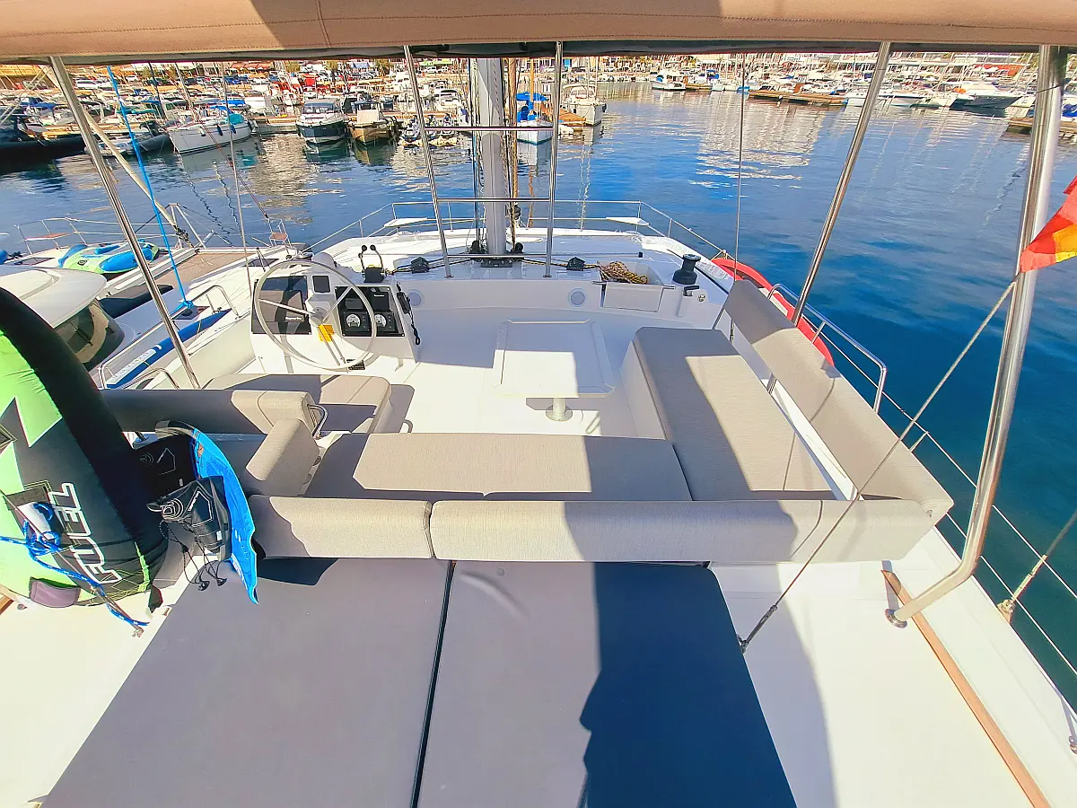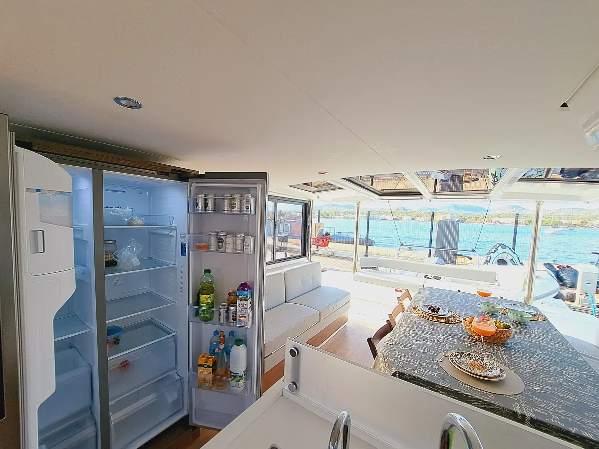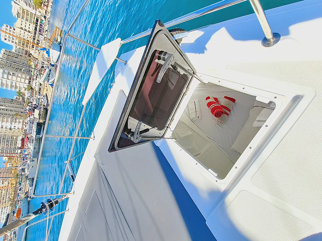 Generator, Wi-Fi und Internet, Wassermacher, Elektrische Winch (Segel), Inverter, Klimaanlage, Lautsprecher im Cockpit, Sprayhood, Cockpit-Kissen, Elektrische Toilette, Beiboot, Kühlschrank, Solar-Panele