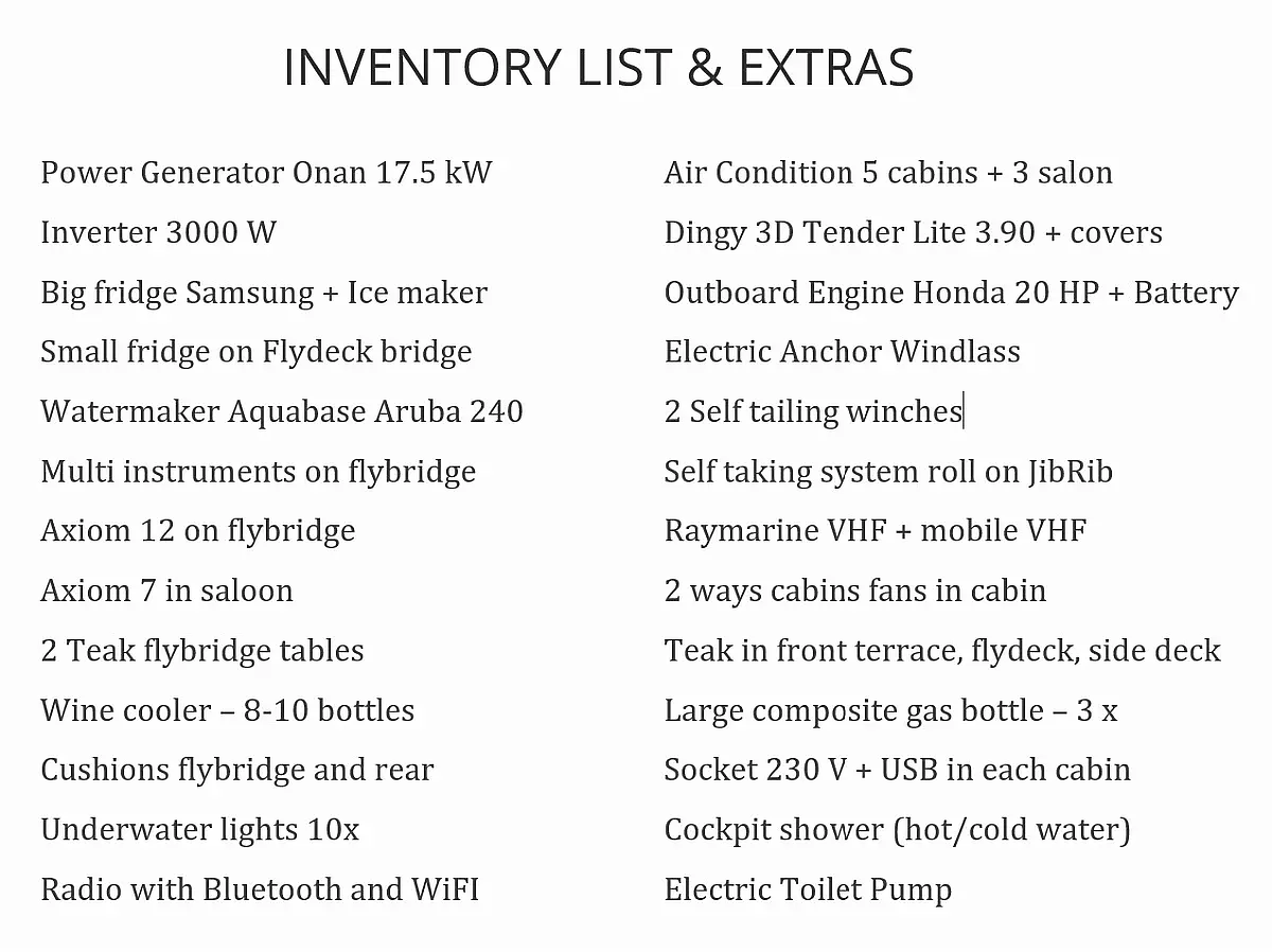 Kühlschrank, Beiboot, Generator, Klimaanlage, Wassermacher, Kaffeemaschine, Teakdeck