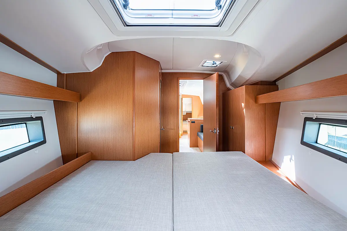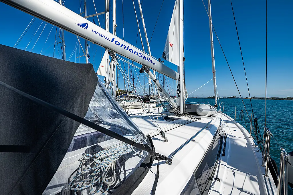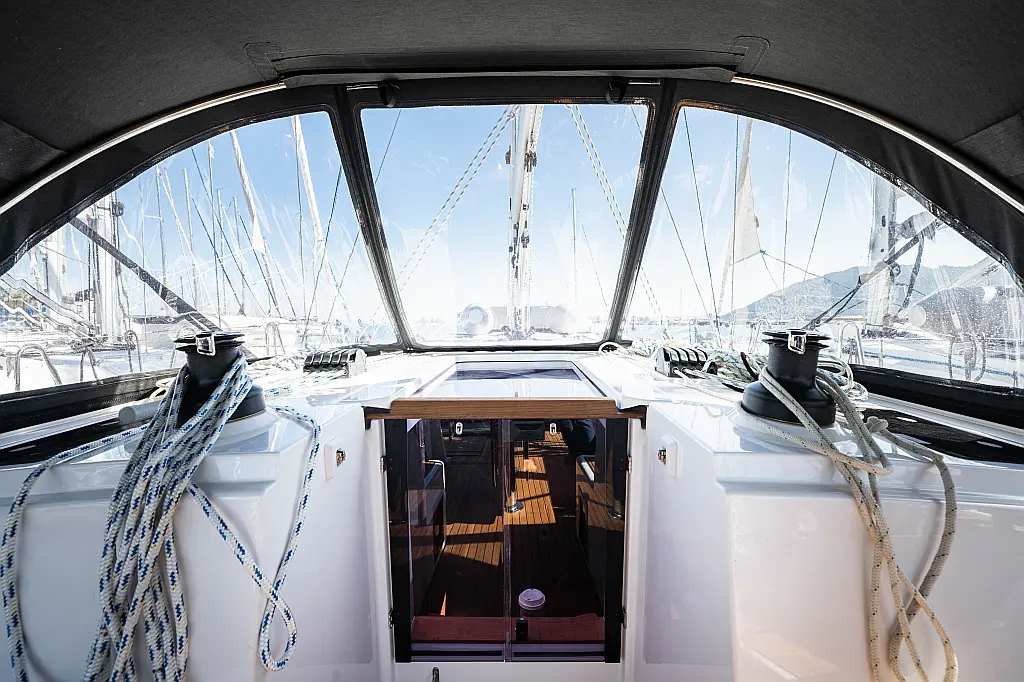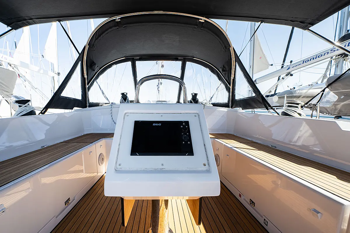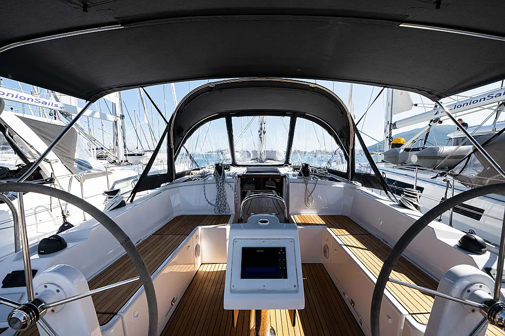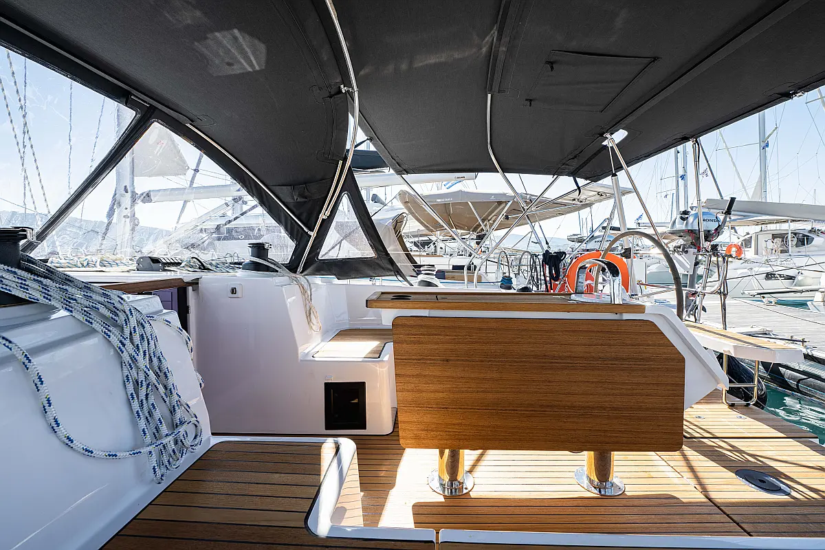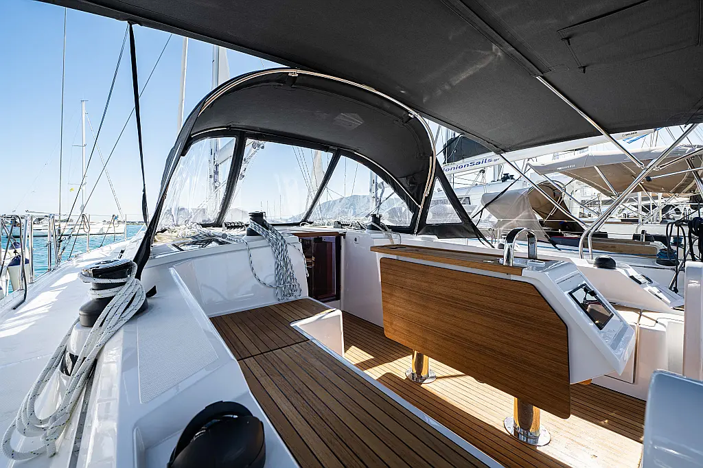Sprayhood, Beiboot, Lautsprecher im Cockpit, Elektrische Winch (Segel), Elektrische Toilette, Solar-Panele, Cockpit-Kissen, Teak Cockpit