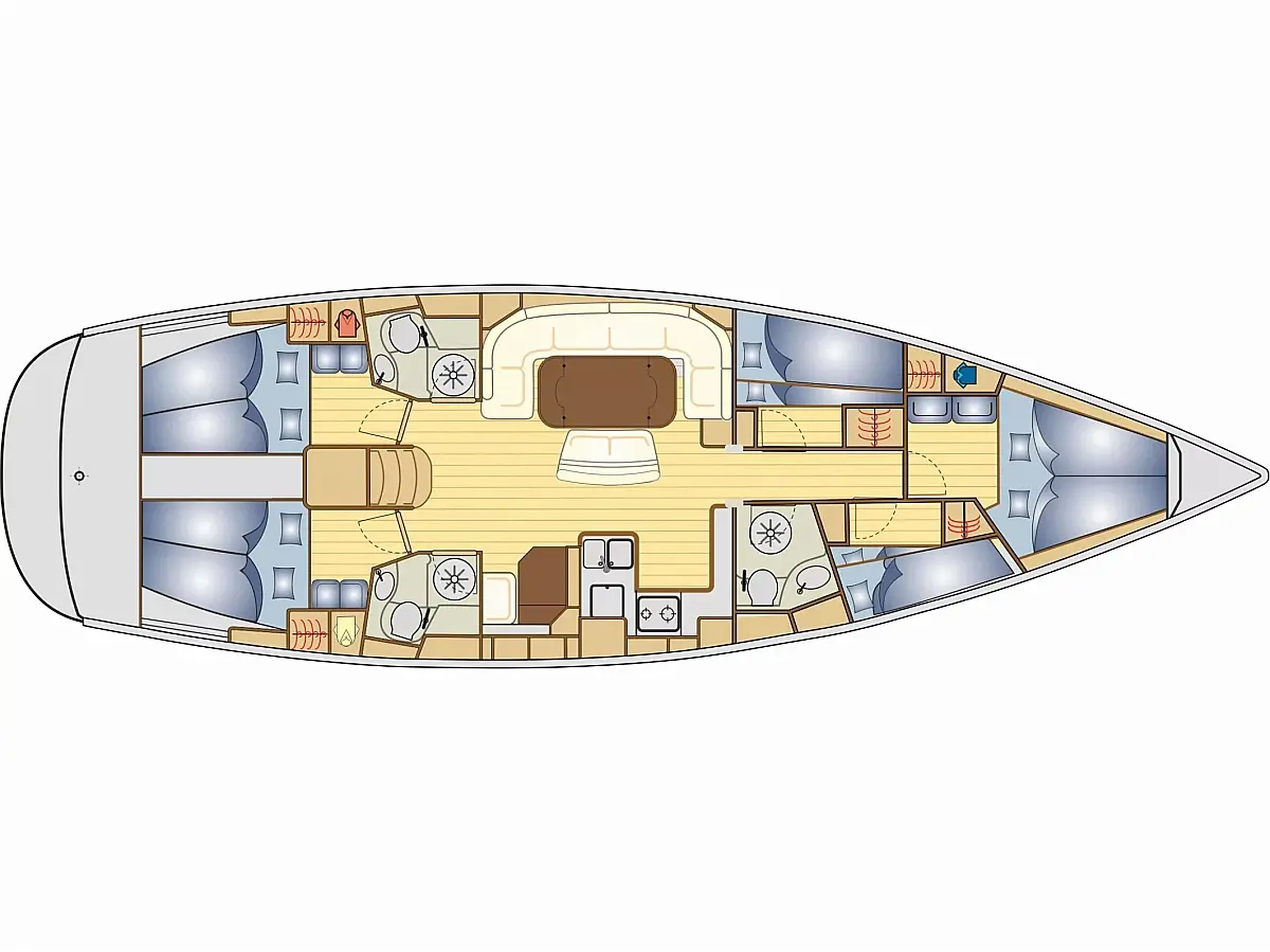 Kühlschrank, Eismaschine, Heizung, Bimini, Sprayhood, Beiboot, Inverter, Solar-Panele, Cockpit-Kissen, Fäkalientank, Kaffeemaschine, Teak Cockpit, Wi-Fi und Internet