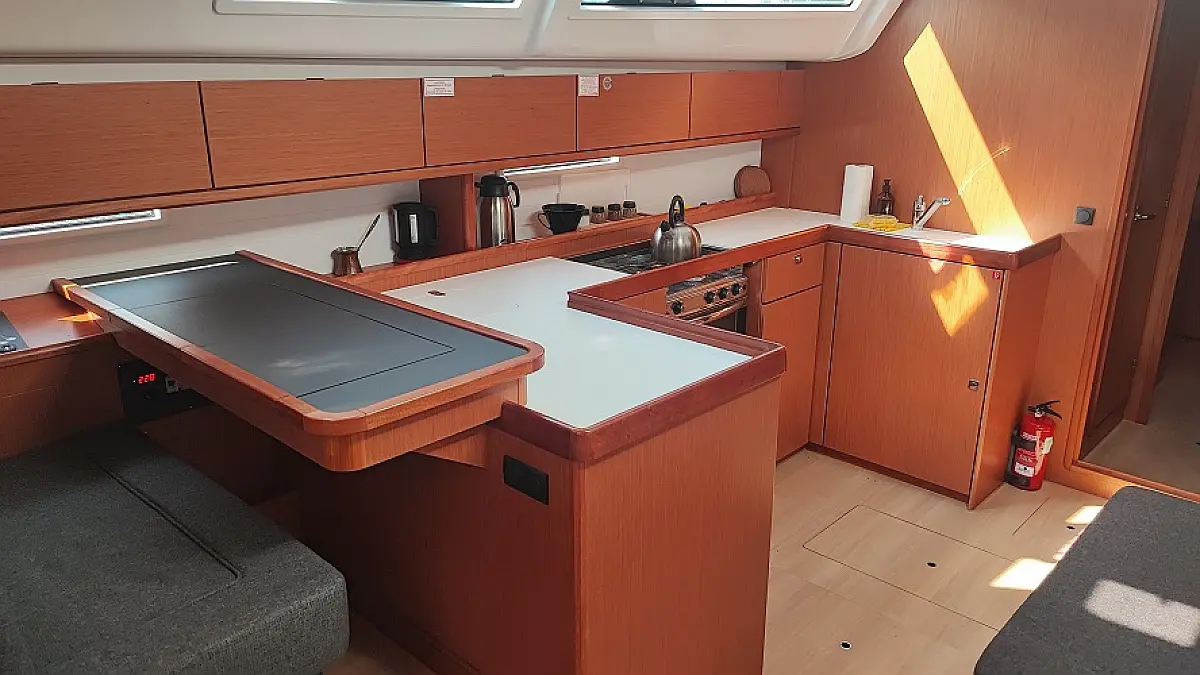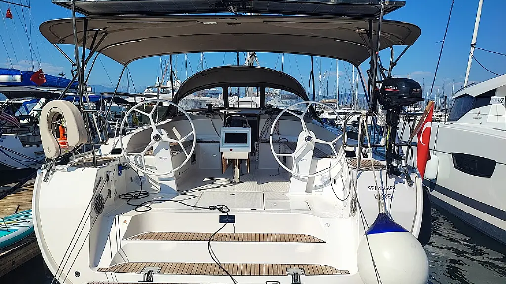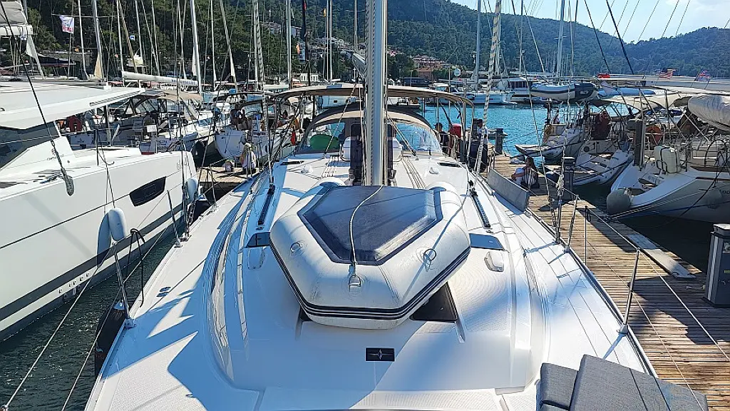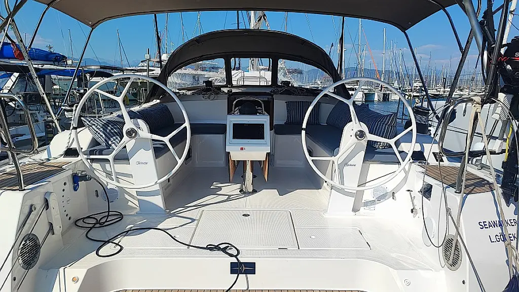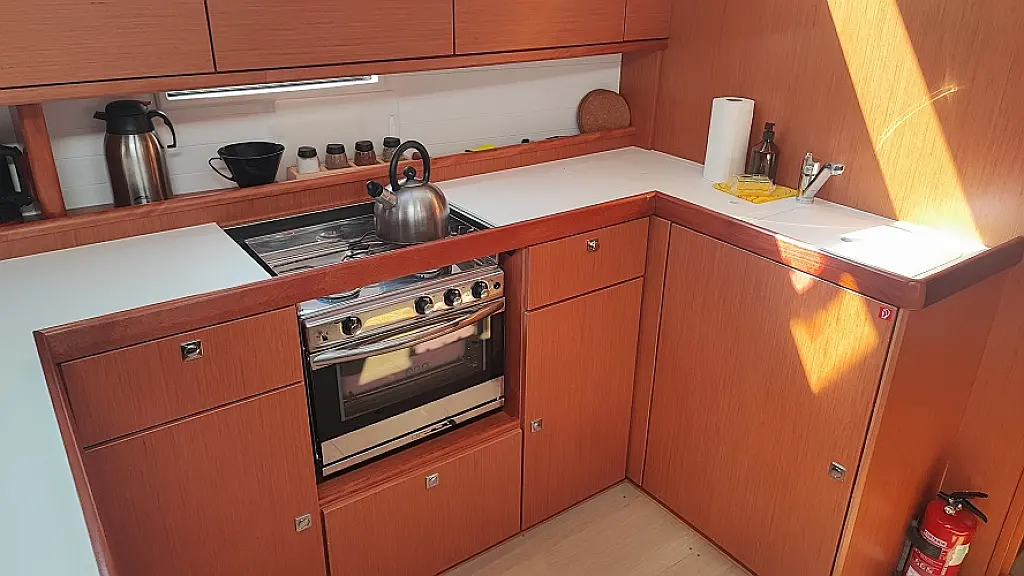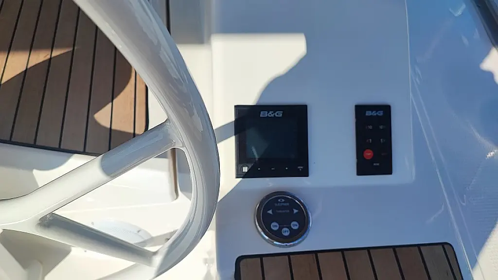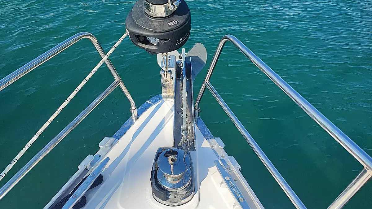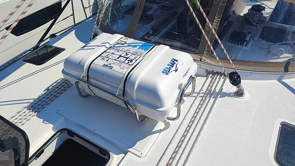 Kühlschrank, Bimini, Cockpit-Kissen, Sprayhood, Außenbordmotor, Solar-Panele, Inverter, Beiboot, Heizung