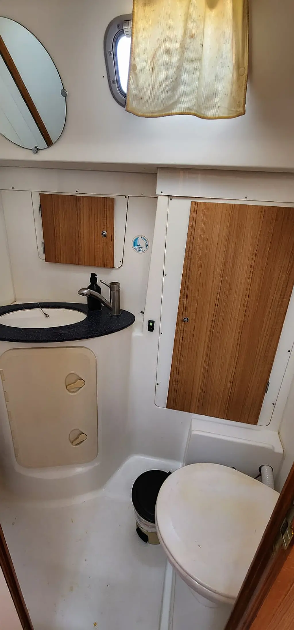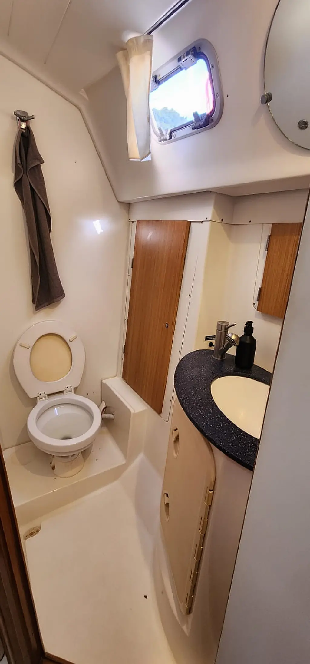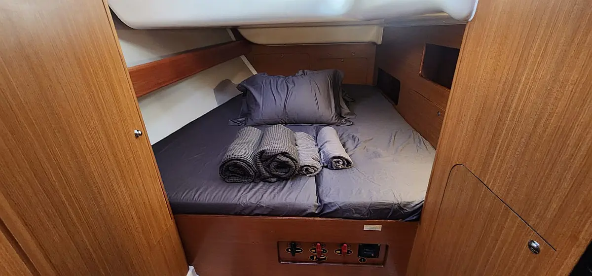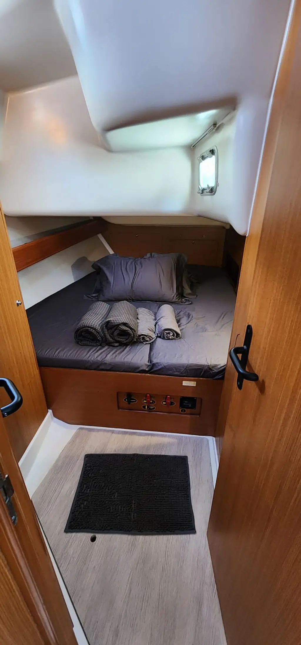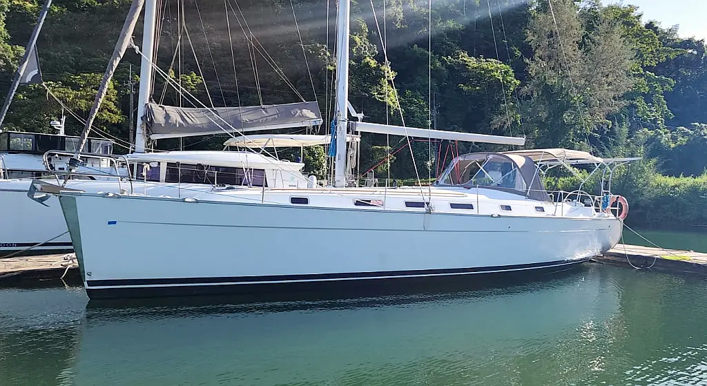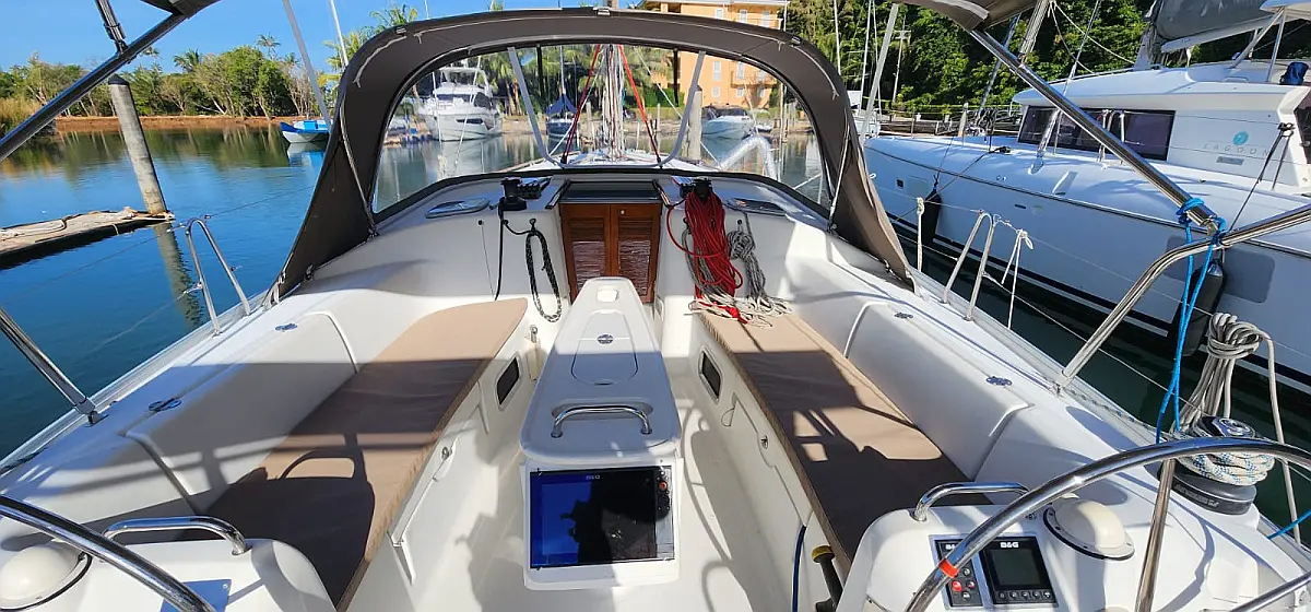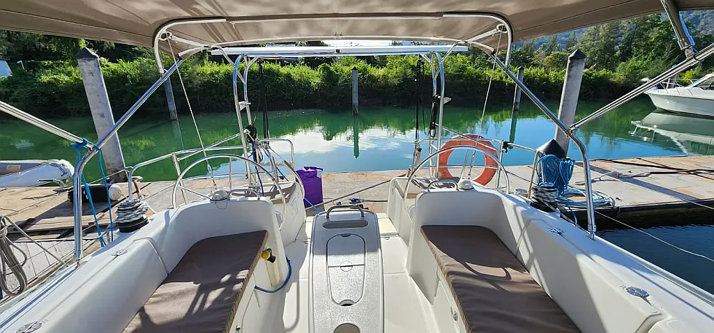 Lautsprecher im Cockpit, Bimini, Kühlschrank, Solar-Panele, Außenbordmotor, Beiboot, Grill im Cockpit