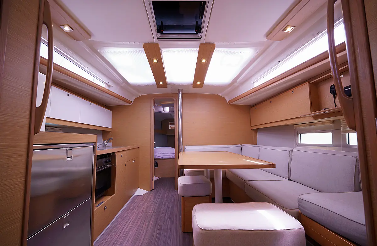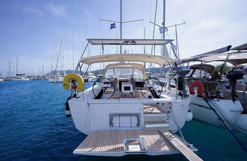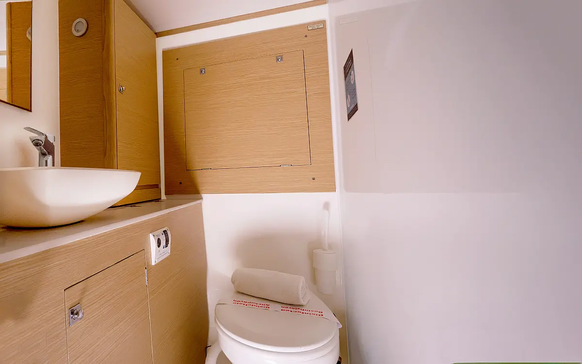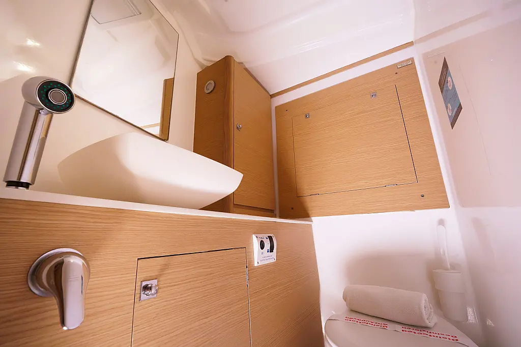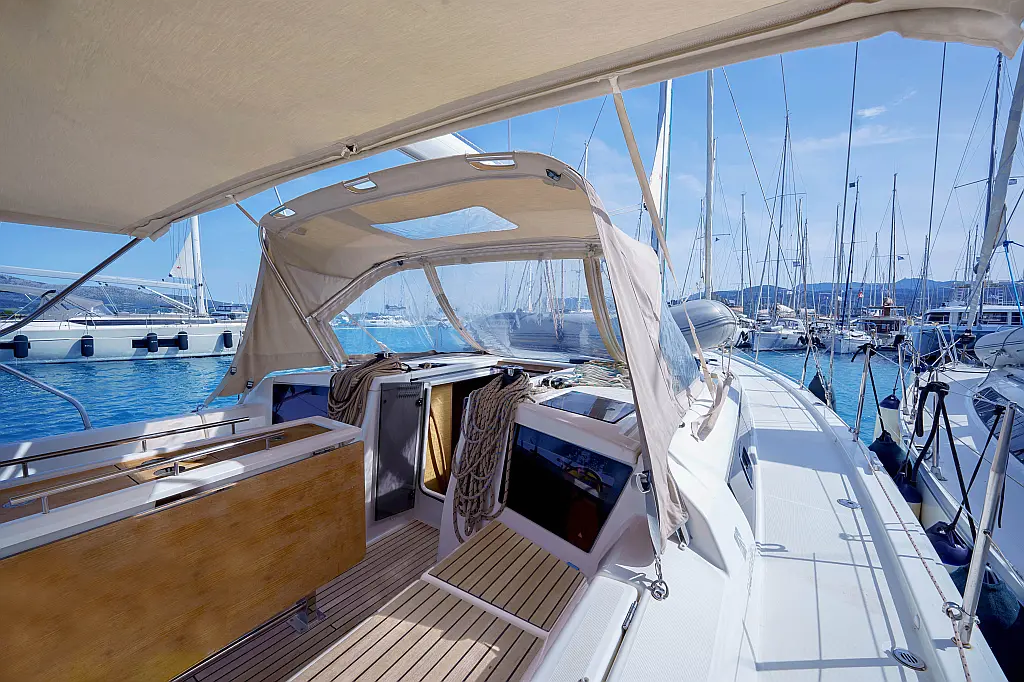 Klimaanlage, Umwandelbarer Tisch, Sprayhood, Fäkalientank, Bimini, Beiboot, Lautsprecher im Cockpit, Elektrische Toilette, Solar-Panele, Cockpit-Kissen, Teak Cockpit, Grill im Cockpit