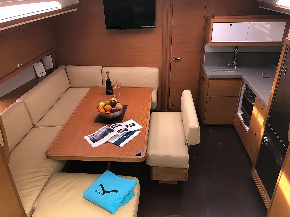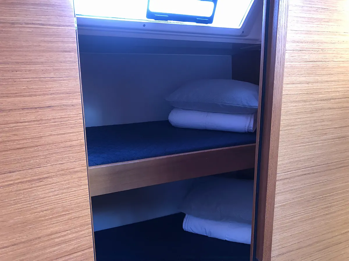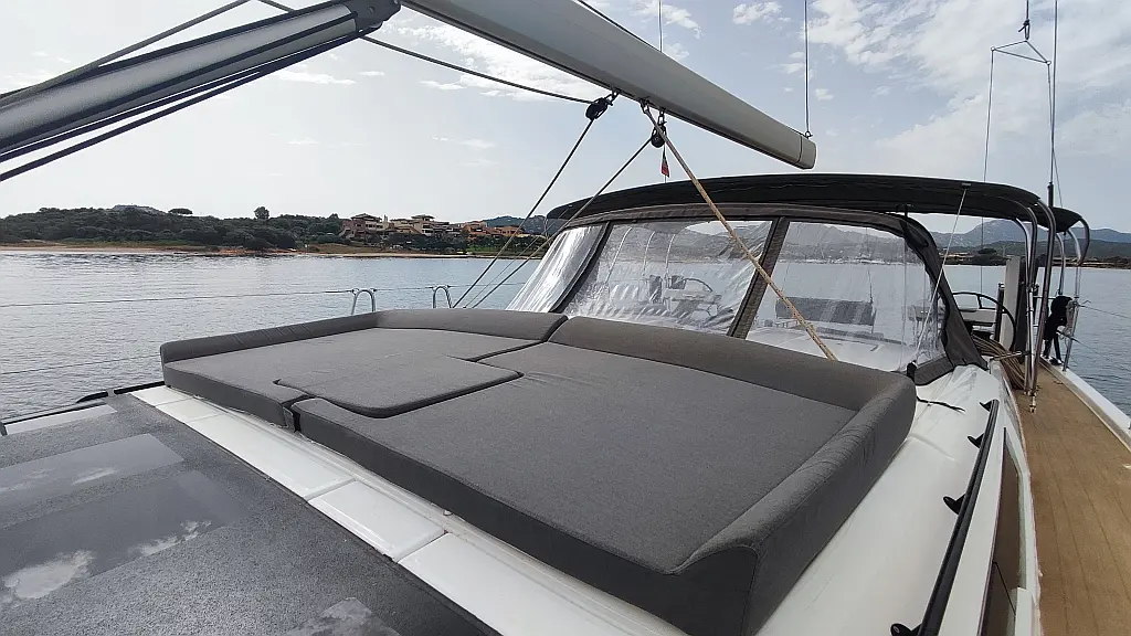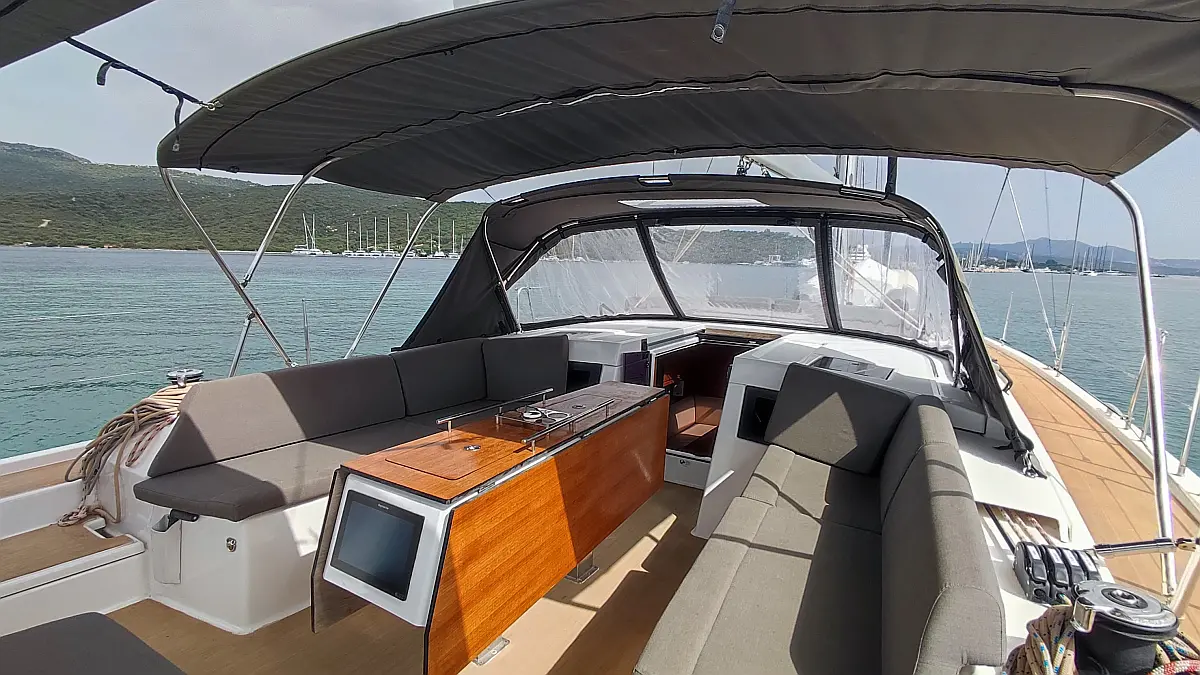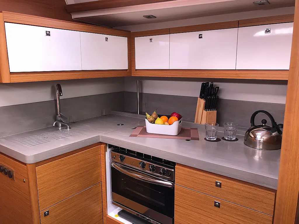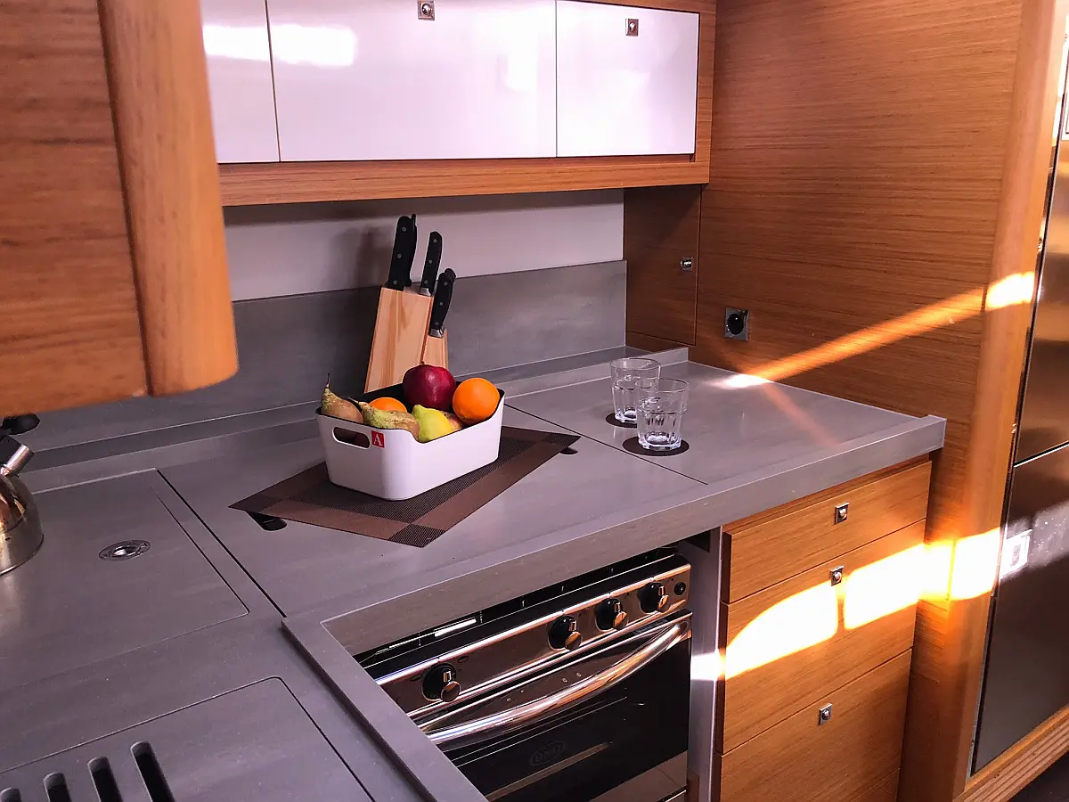 Cockpit-Kissen, Grill im Cockpit, Teakdeck, Elektrische Toilette, Kühlschrank, Badeplattform, Elektrische Winch (Segel), Hydraulische Gangway, Inverter, Solar-Panele
