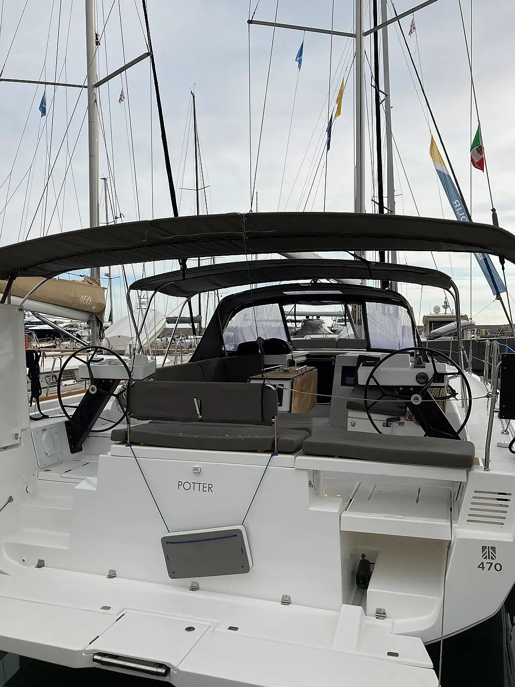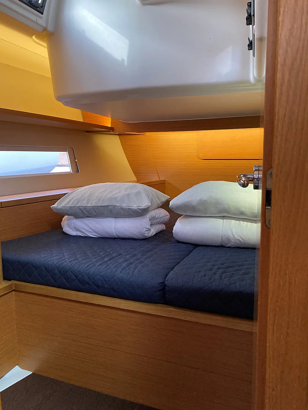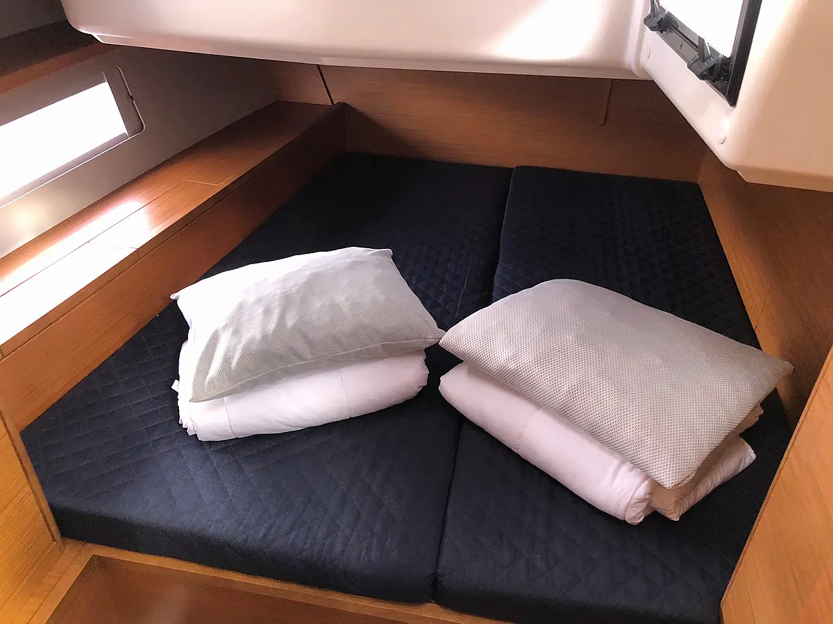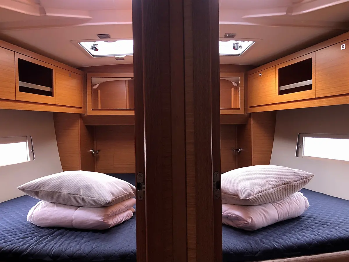 Cockpit-Kissen, Grill im Cockpit, Teakdeck, Elektrische Toilette, Kühlschrank, Badeplattform, Elektrische Winch (Segel), Hydraulische Gangway, Inverter, Solar-Panele