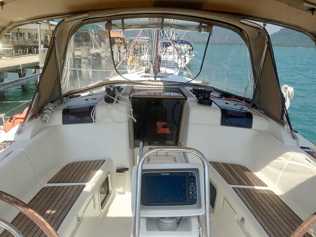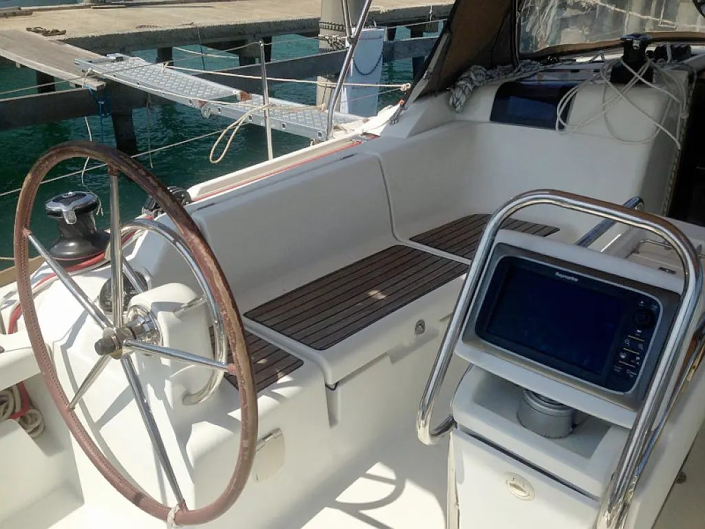 Lautsprecher im Cockpit, Bimini, Kühlschrank, Solar-Panele, Außenbordmotor, Beiboot, Grill im Cockpit