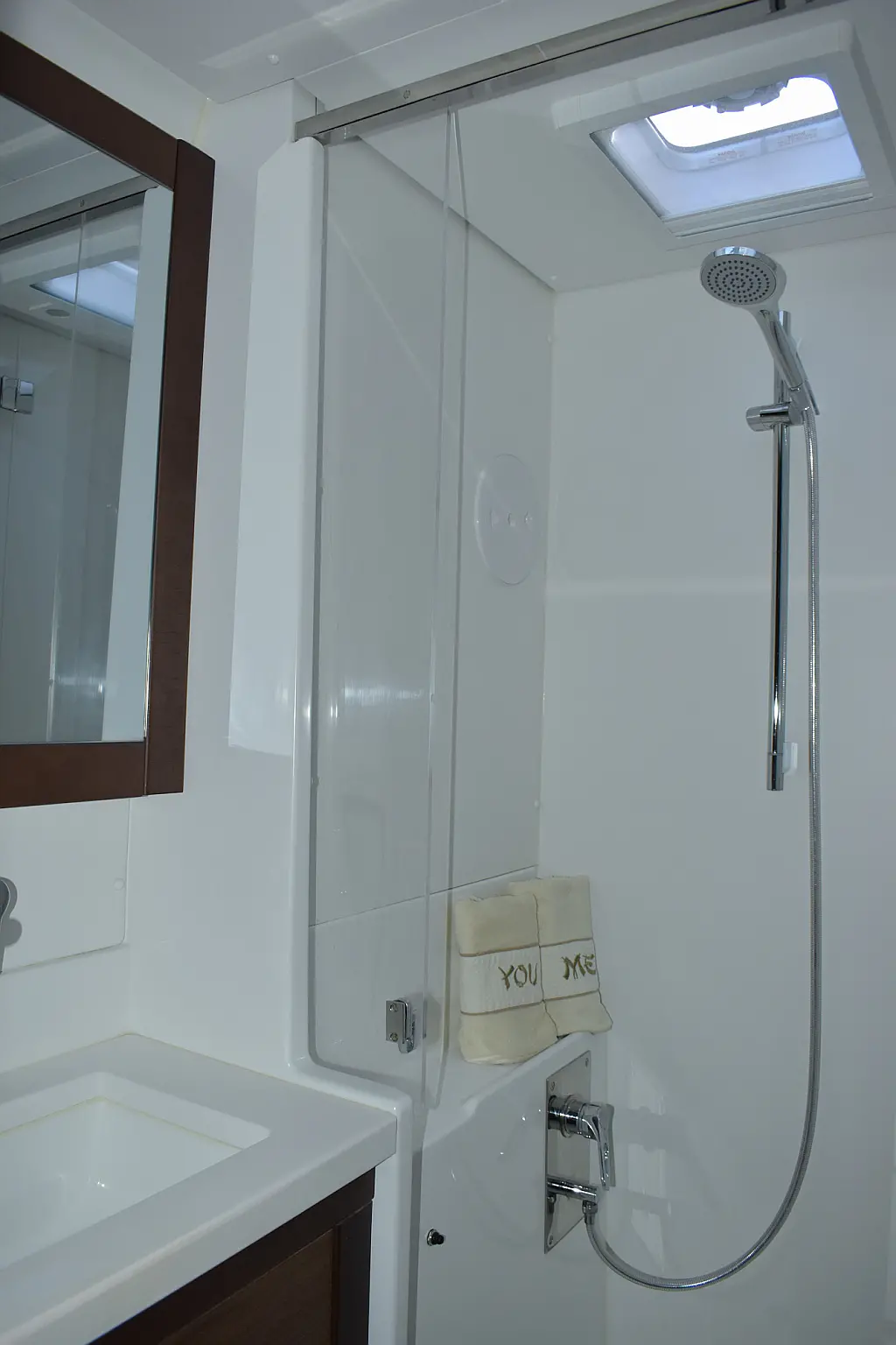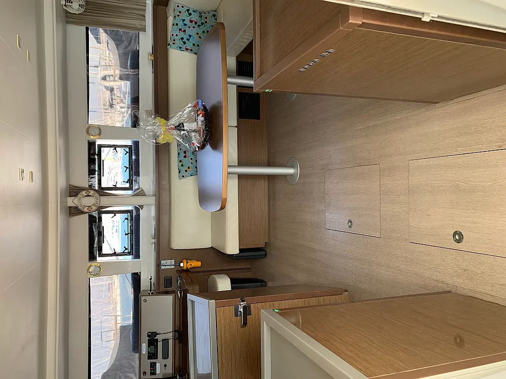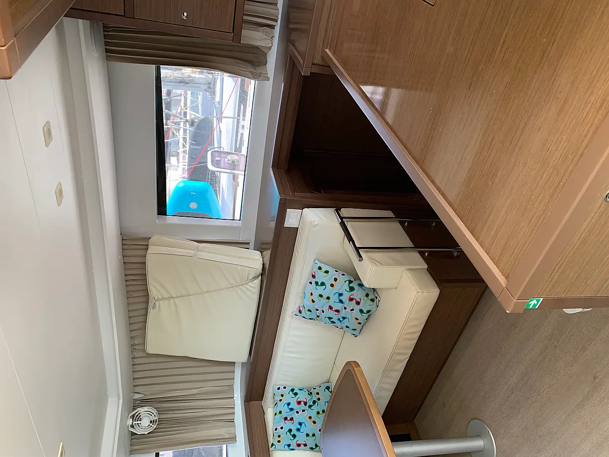 Beiboot, Wassermacher, Elektrische Toilette, Elektrische Winch (Segel), Klimaanlage, Bimini, Kaffeemaschine, Solar-Panele, Generator, Außenbordmotor, Sprayhood, Inverter, Teakdeck