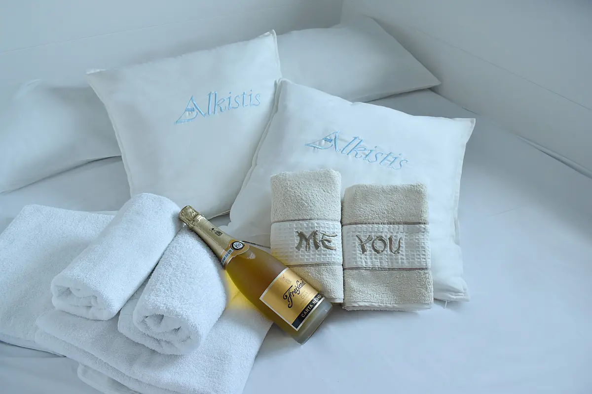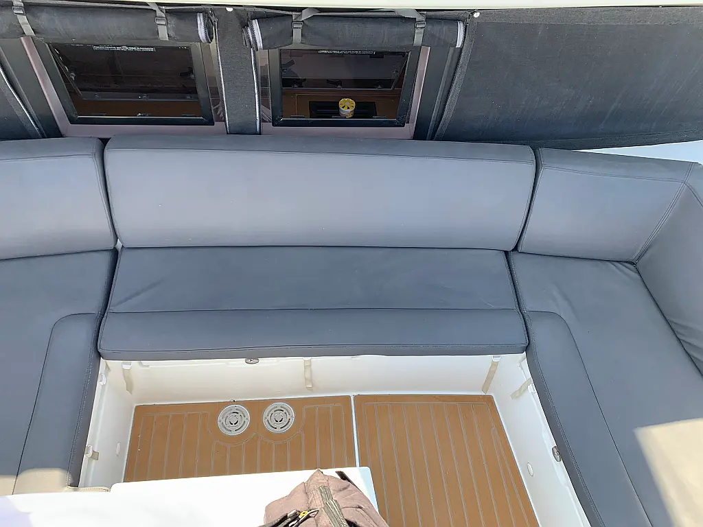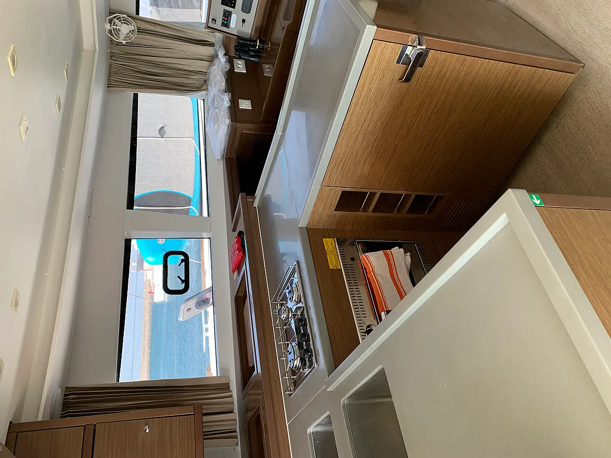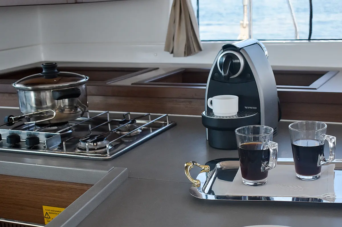 Beiboot, Wassermacher, Elektrische Toilette, Elektrische Winch (Segel), Klimaanlage, Bimini, Kaffeemaschine, Solar-Panele, Generator, Außenbordmotor, Sprayhood, Inverter, Teakdeck