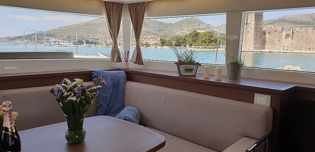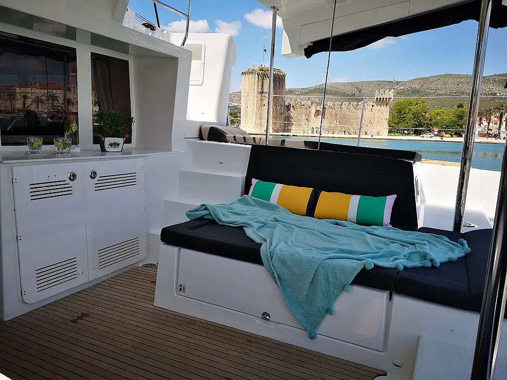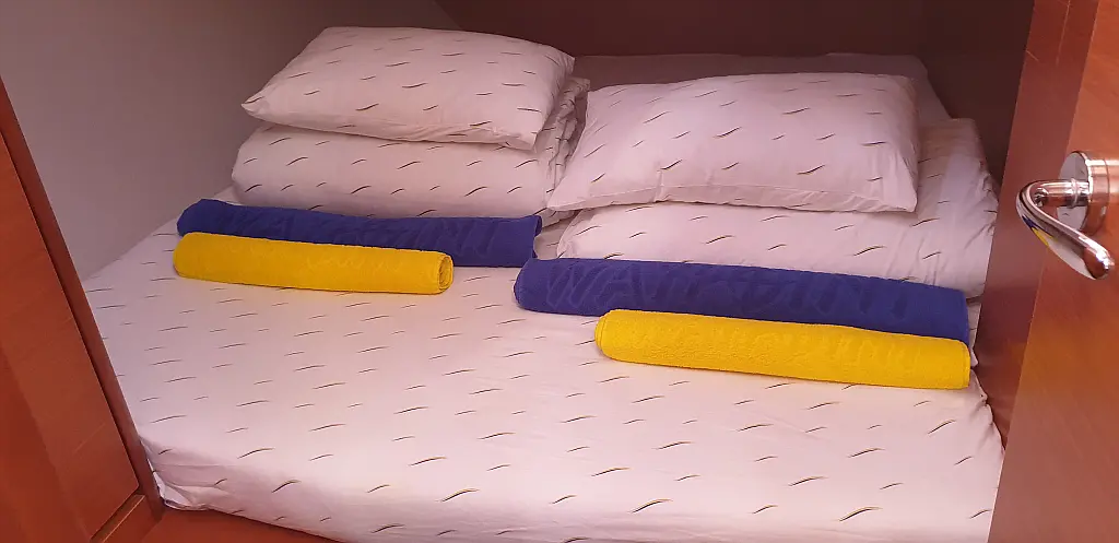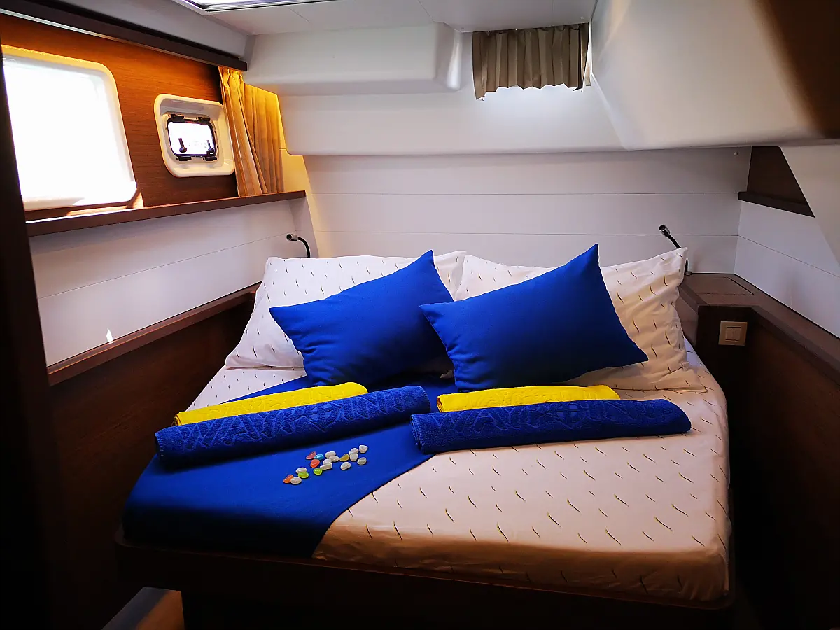 Bimini, Sprayhood, Außenbordmotor, Kaffeemaschine, Kühlschrank, Klimaanlage, Generator, Eismaschine, Teakdeck, Cockpit-Kissen, Elektrische Winch (Segel), Heizung, Elektrische Toilette