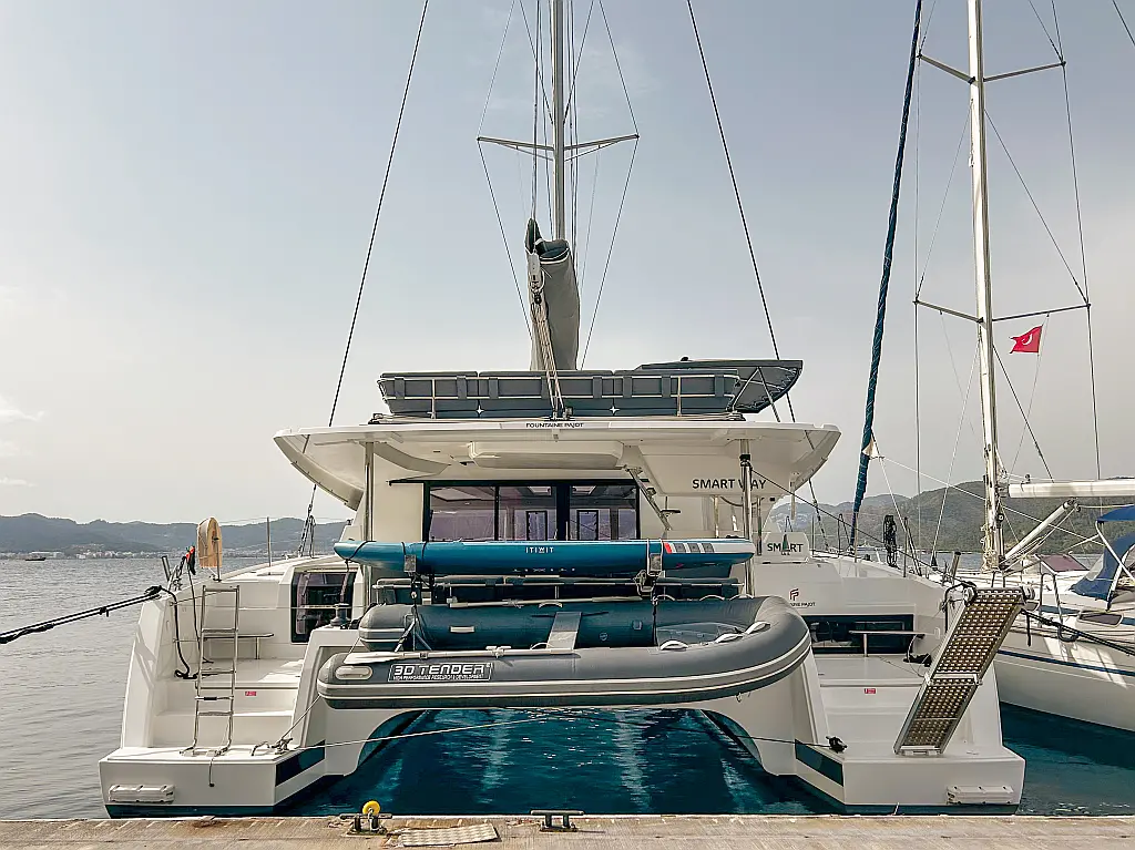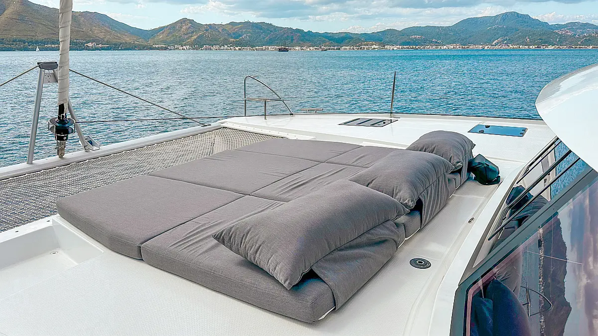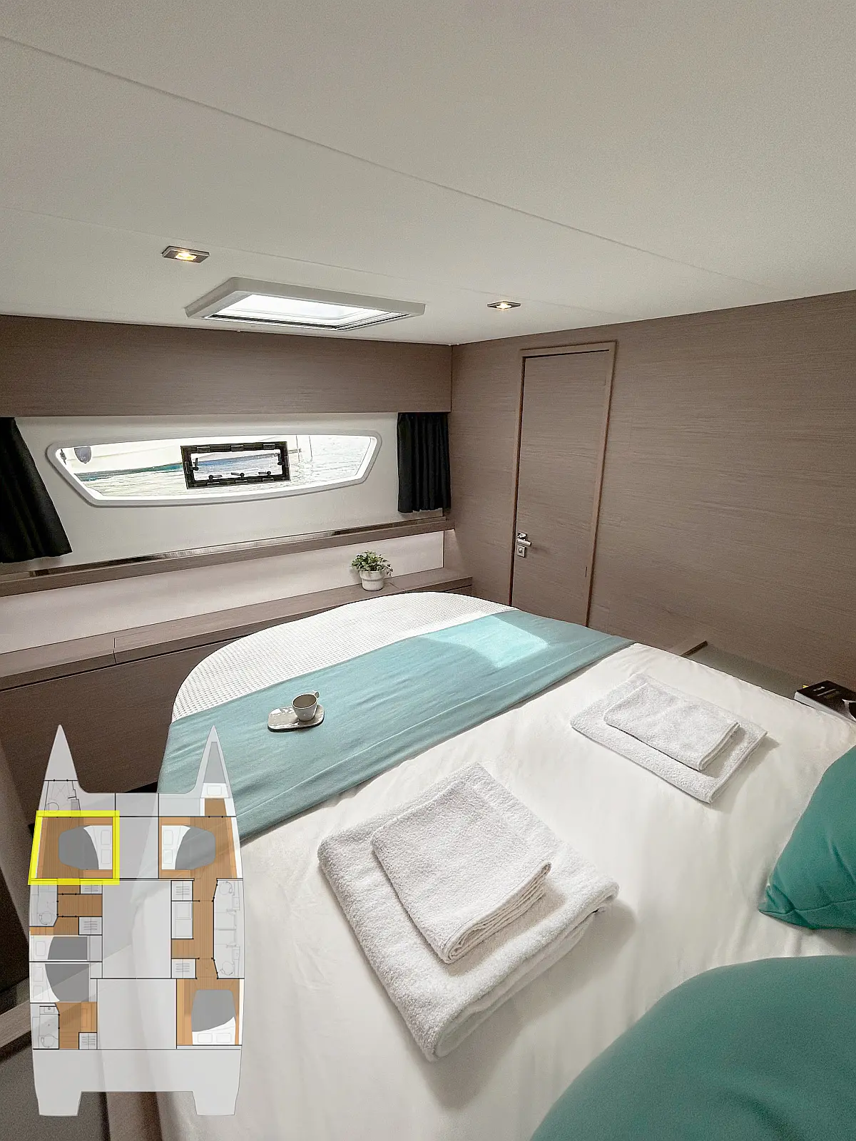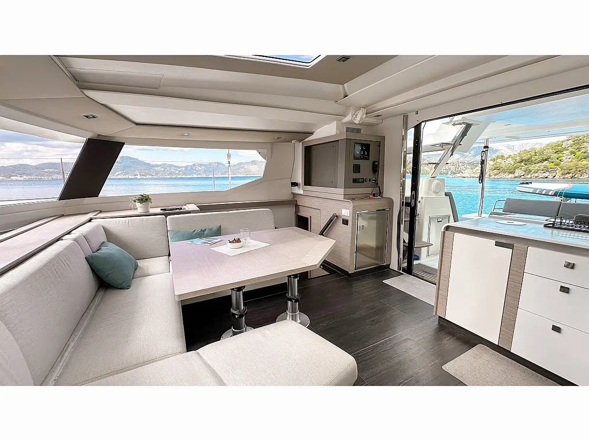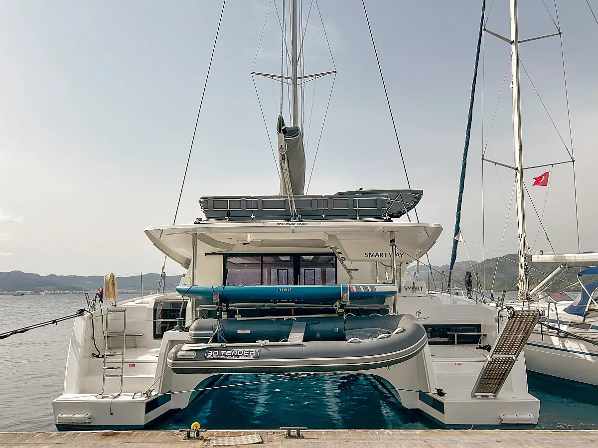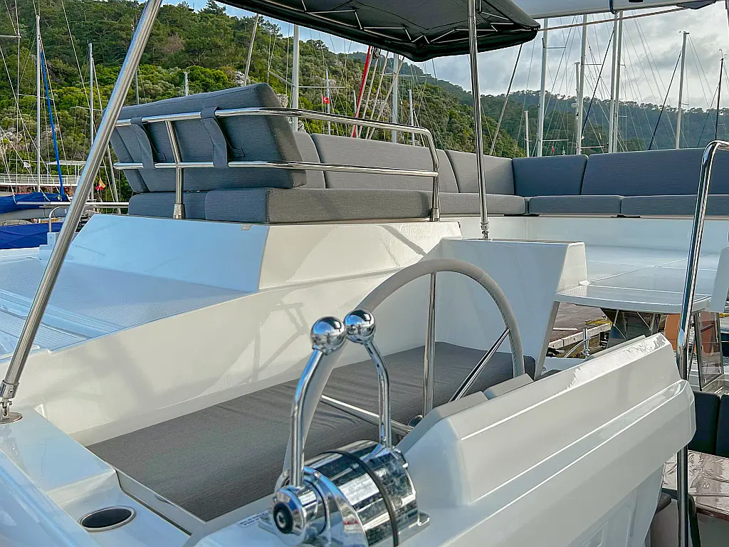 Generator, Beiboot, Kaffeemaschine, Inverter, Klimaanlage, Elektrische Winch (Segel), Wassermacher, Kühlschrank, Solar-Panele, Cockpit-Kissen, Lautsprecher im Cockpit, Wi-Fi und Internet, Elektrische Toilette, Flybridge, Bimini, Eismaschine, Außenbordmotor