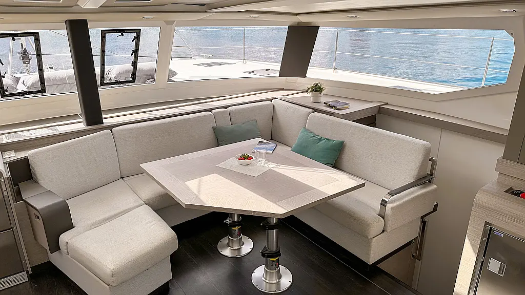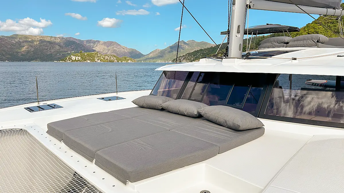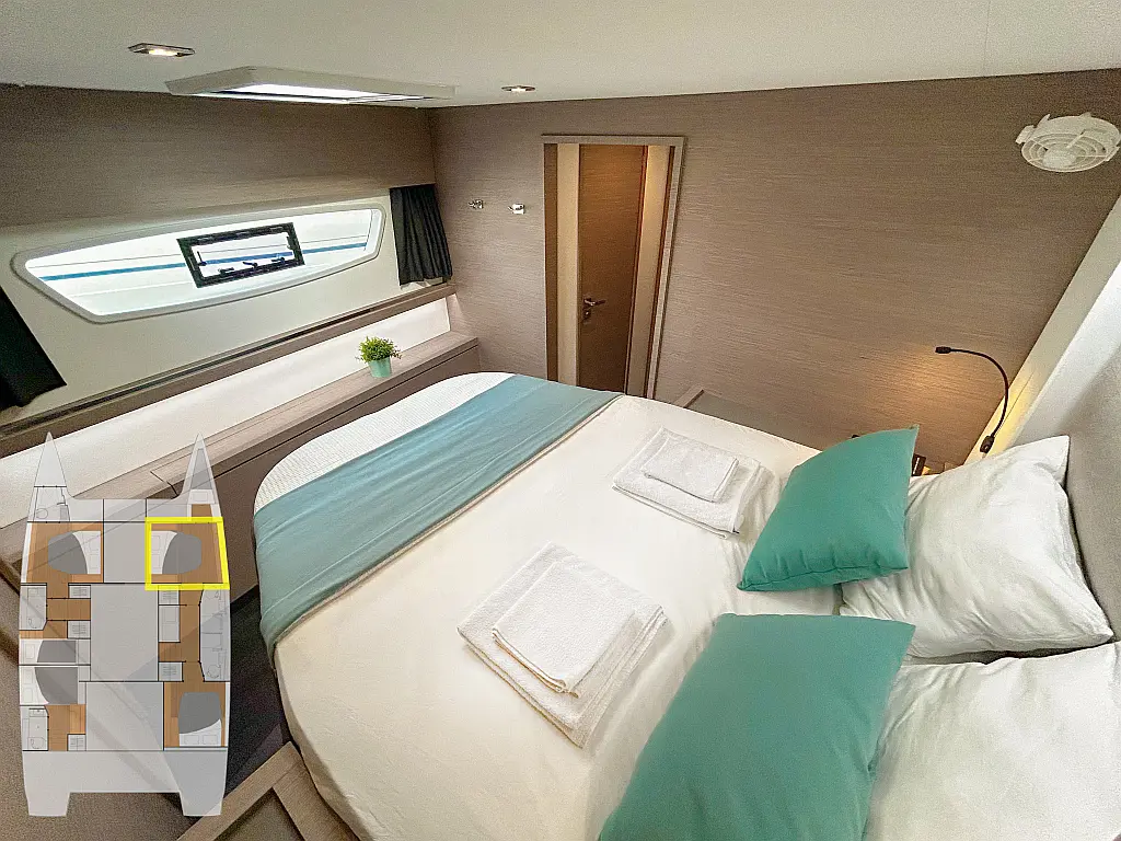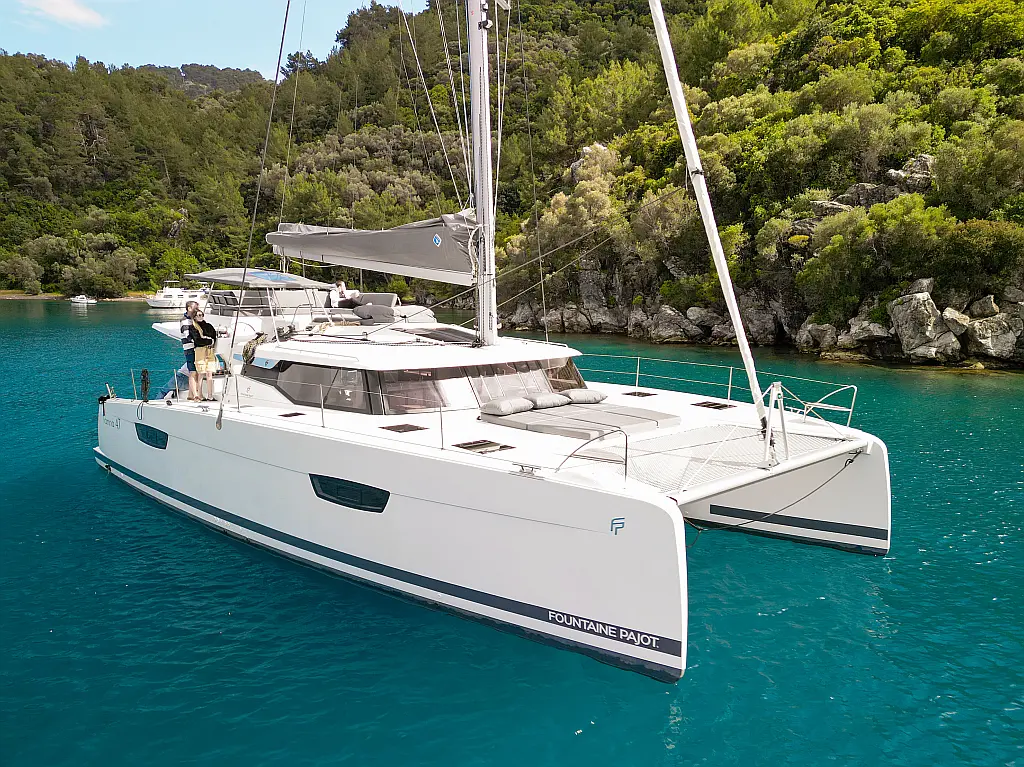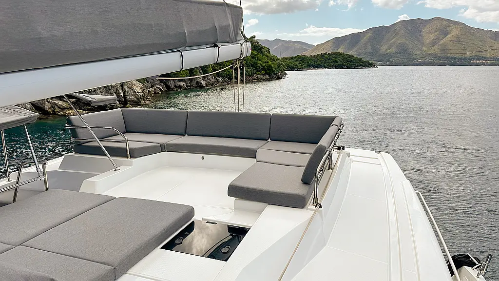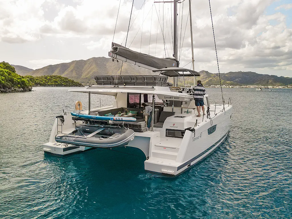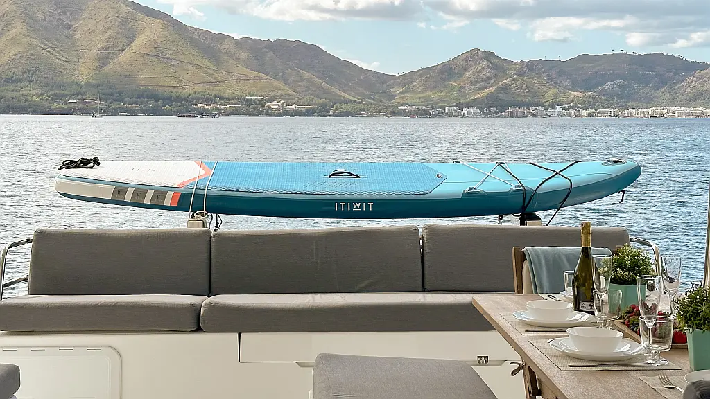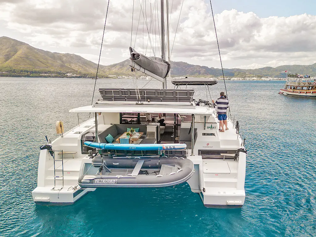 Generator, Beiboot, Kaffeemaschine, Inverter, Klimaanlage, Elektrische Winch (Segel), Wassermacher, Kühlschrank, Solar-Panele, Cockpit-Kissen, Lautsprecher im Cockpit, Wi-Fi und Internet, Elektrische Toilette, Flybridge, Bimini, Eismaschine, Außenbordmotor