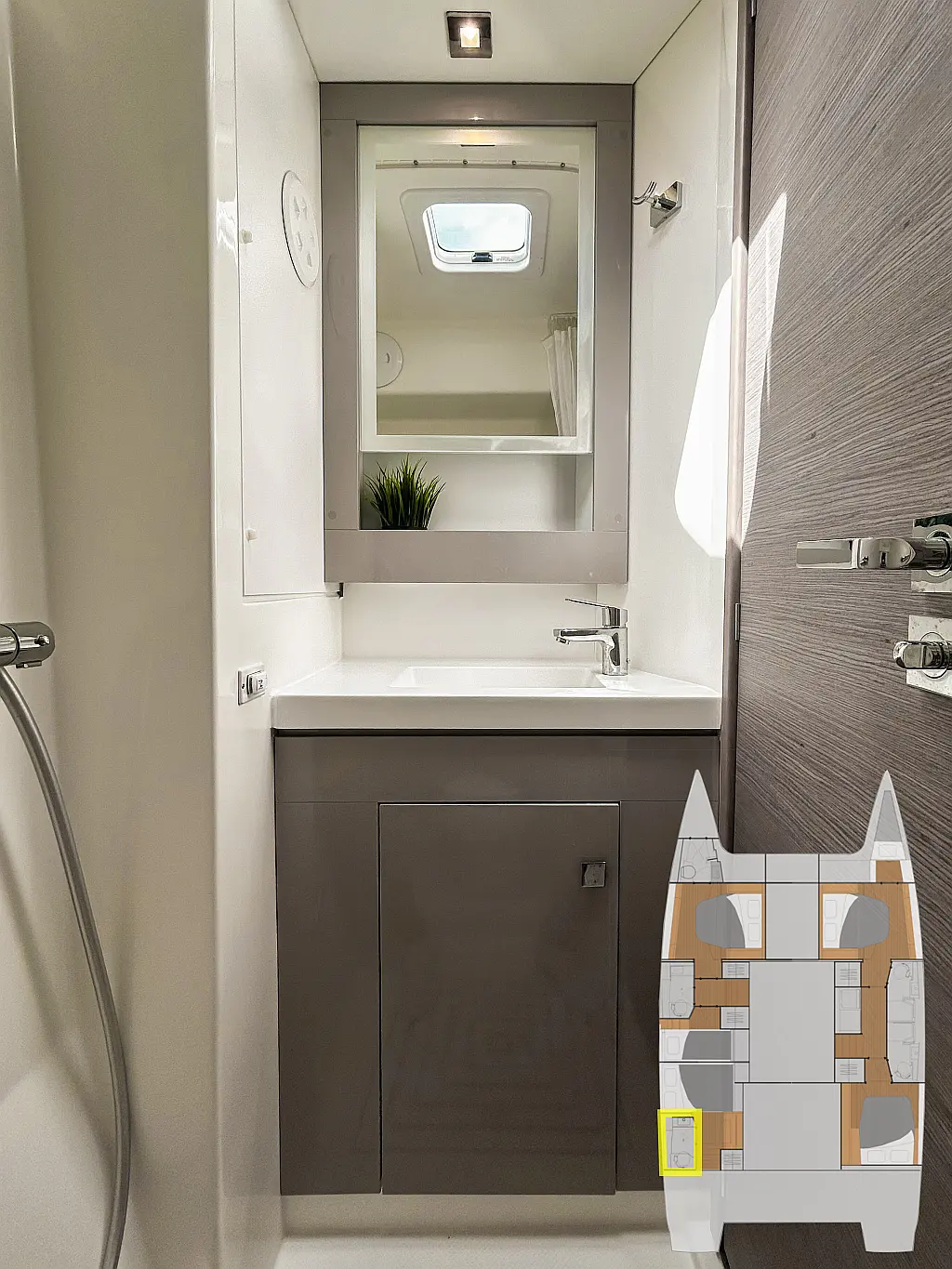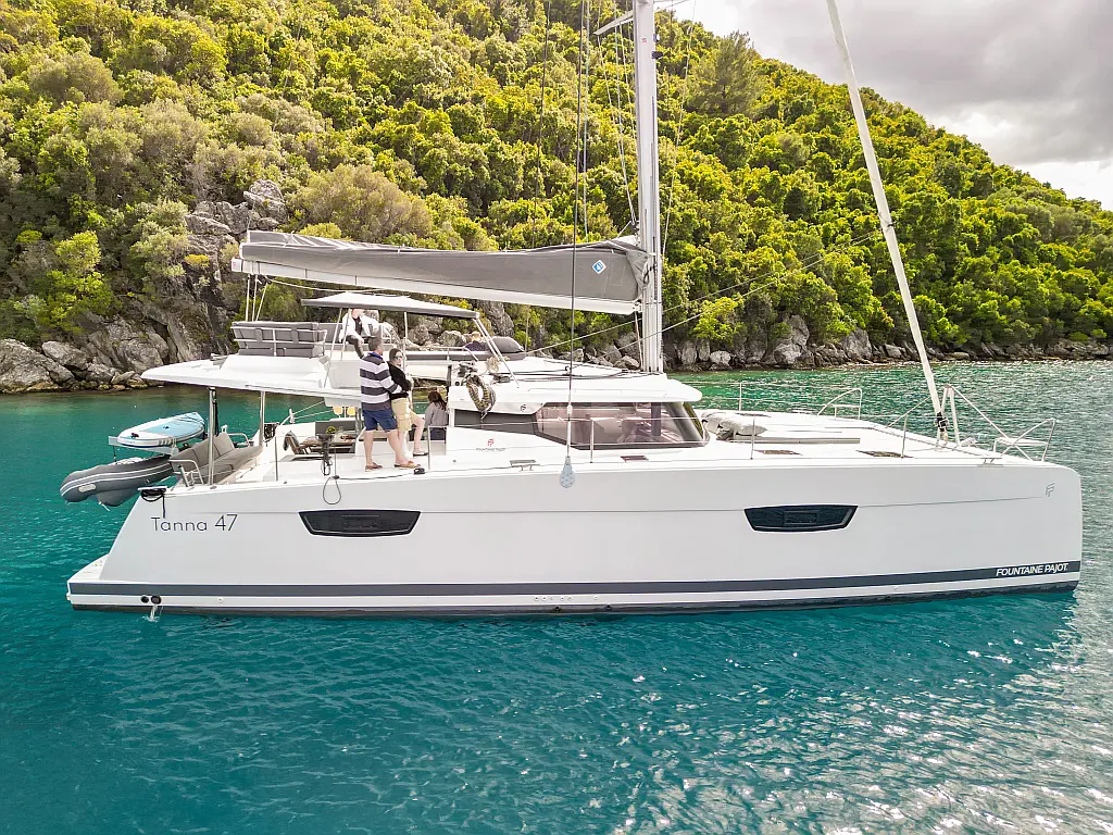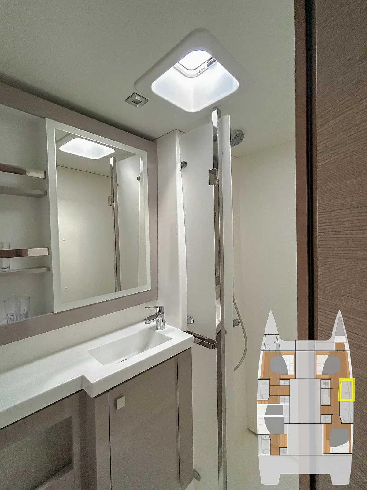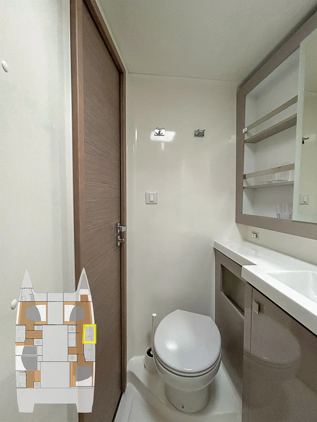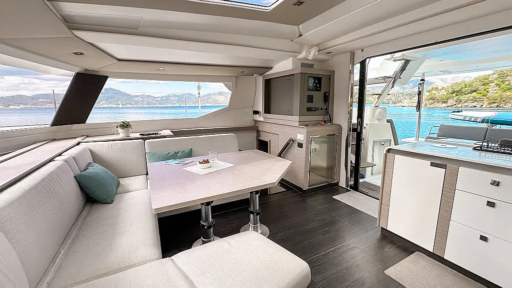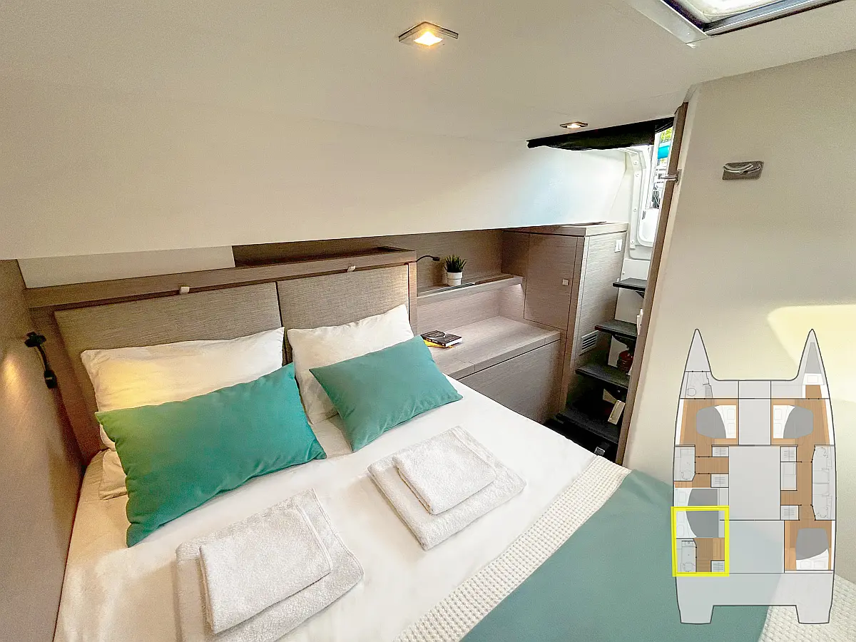 Generator, Beiboot, Kaffeemaschine, Inverter, Klimaanlage, Elektrische Winch (Segel), Wassermacher, Kühlschrank, Solar-Panele, Cockpit-Kissen, Lautsprecher im Cockpit, Wi-Fi und Internet, Elektrische Toilette, Flybridge, Bimini, Eismaschine, Außenbordmotor
