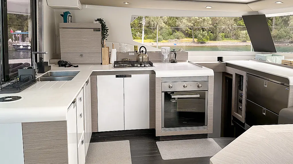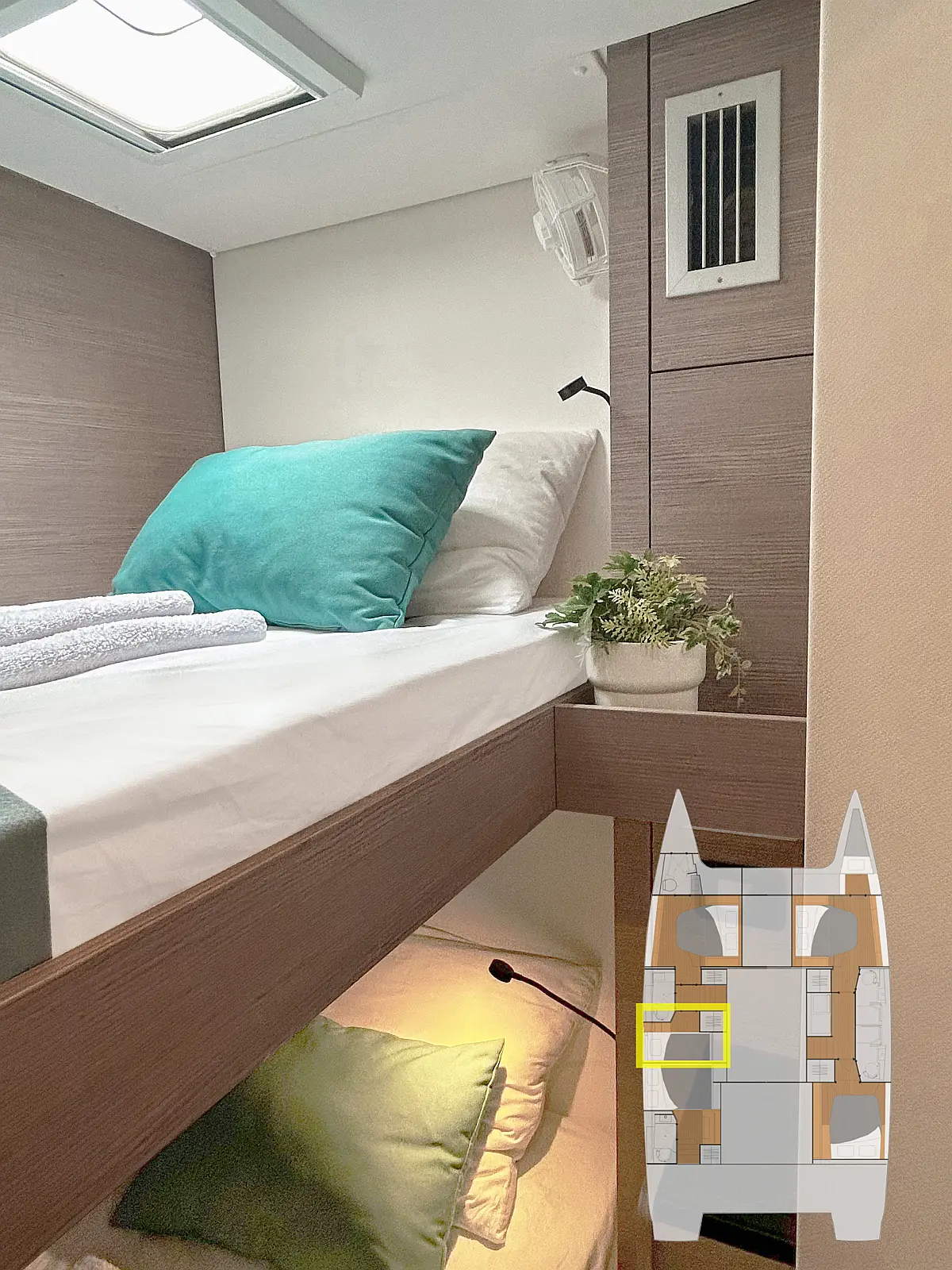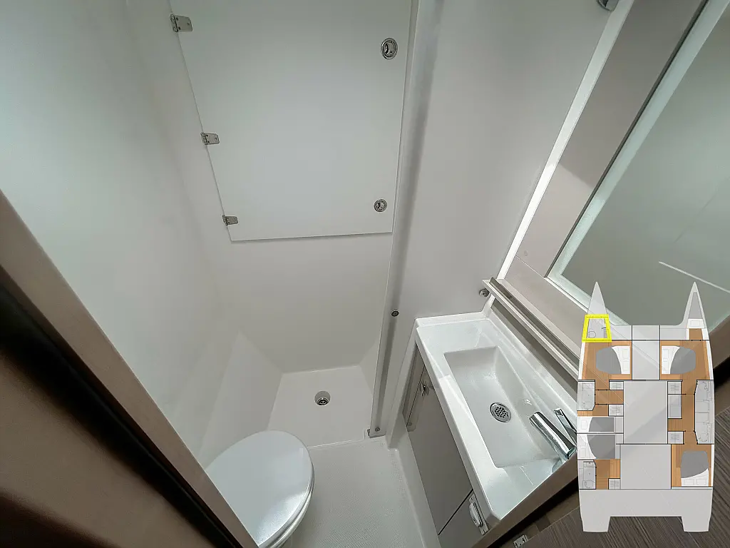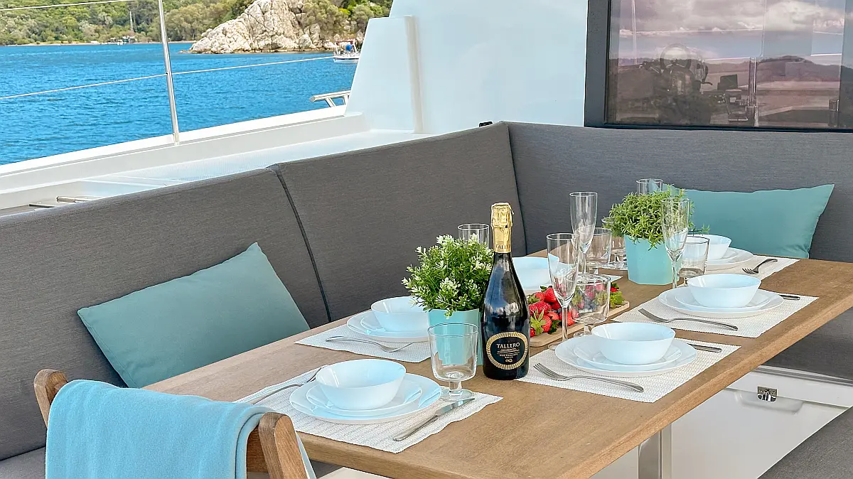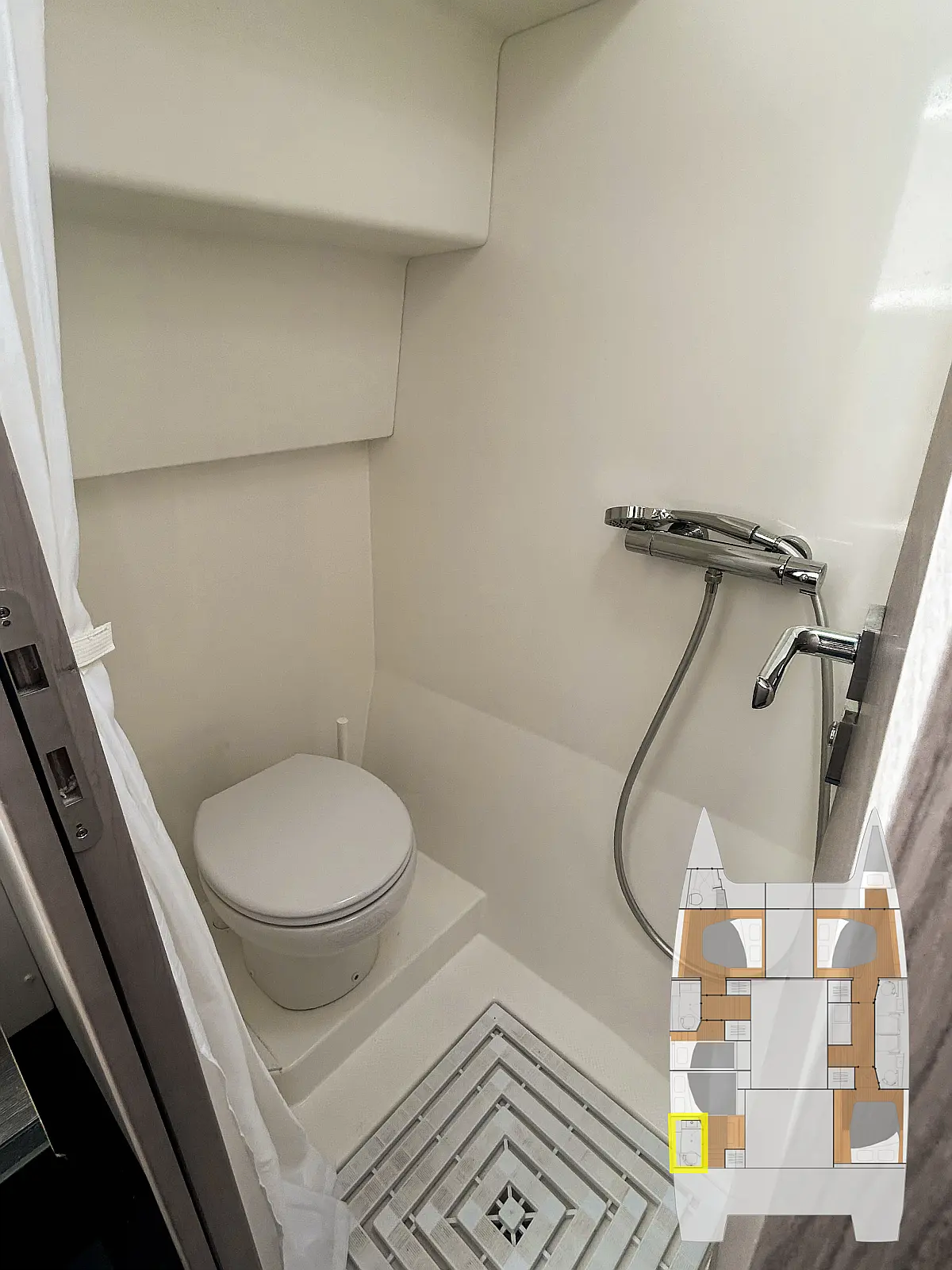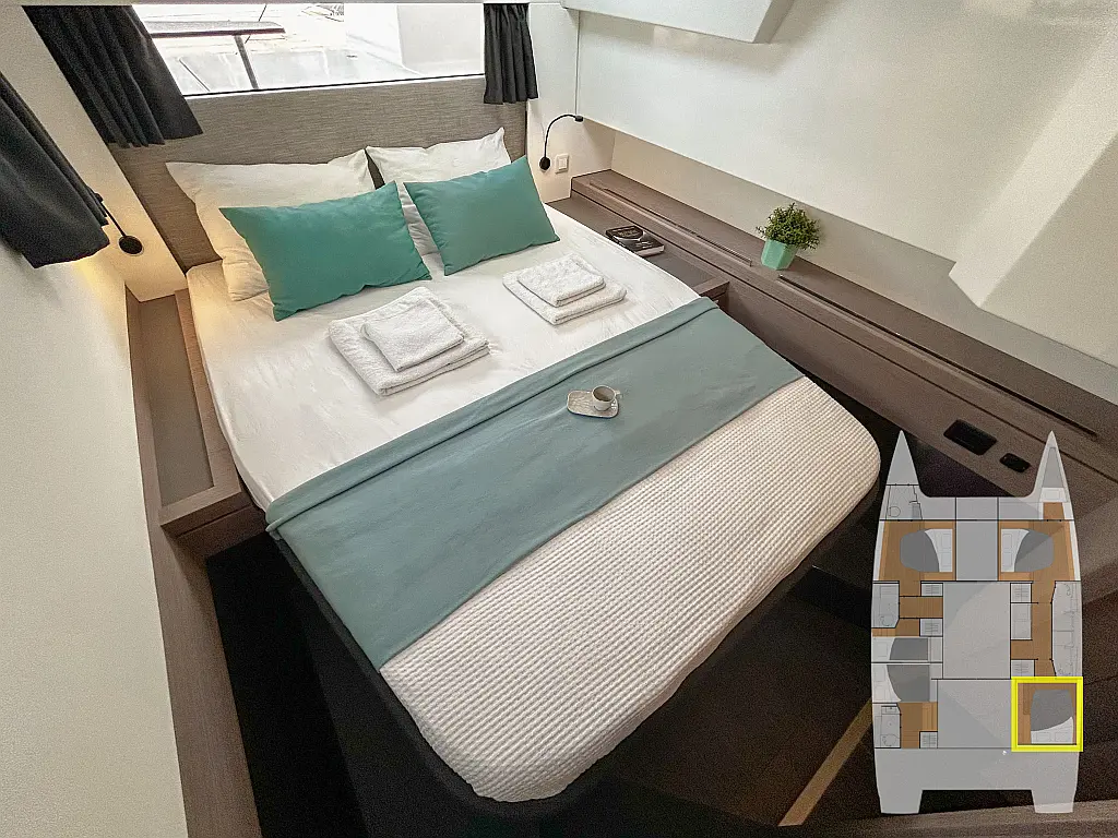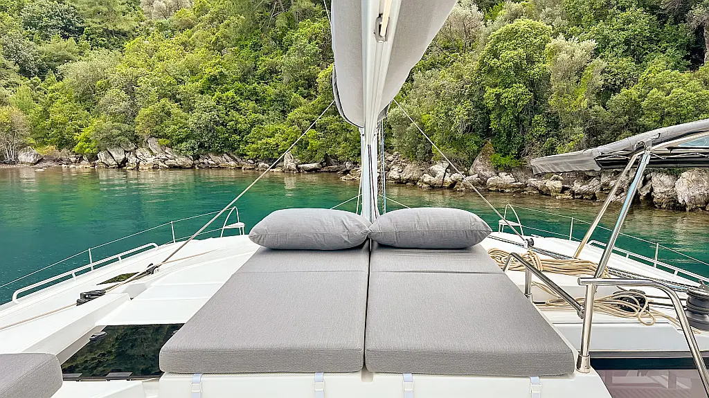 Generator, Beiboot, Kaffeemaschine, Inverter, Klimaanlage, Elektrische Winch (Segel), Wassermacher, Kühlschrank, Solar-Panele, Cockpit-Kissen, Lautsprecher im Cockpit, Wi-Fi und Internet, Elektrische Toilette, Flybridge, Bimini, Eismaschine, Außenbordmotor