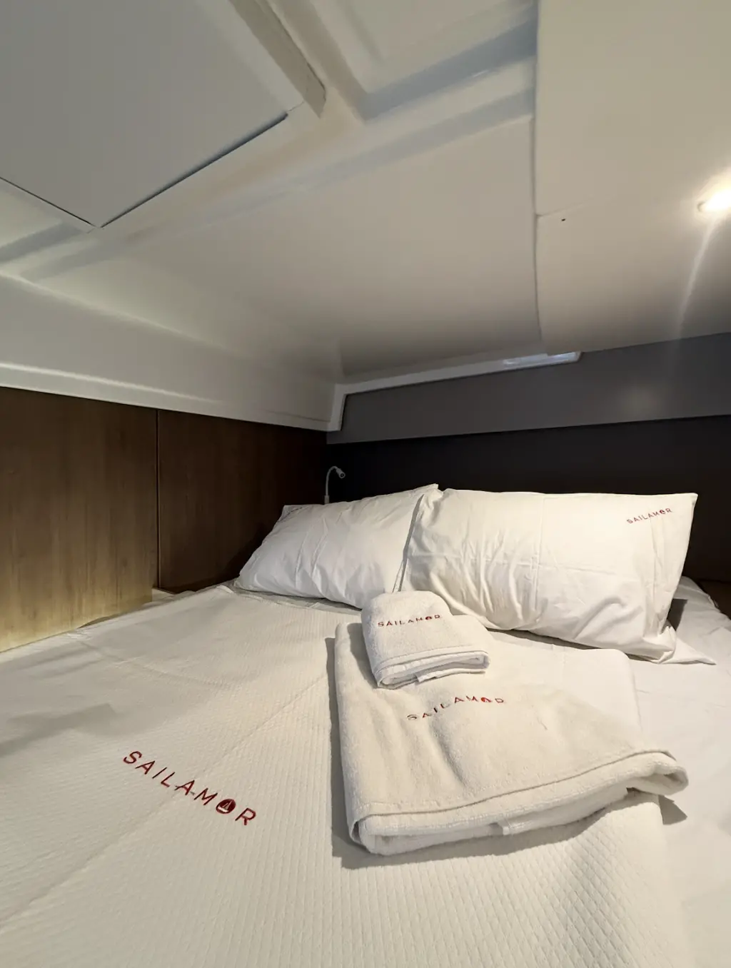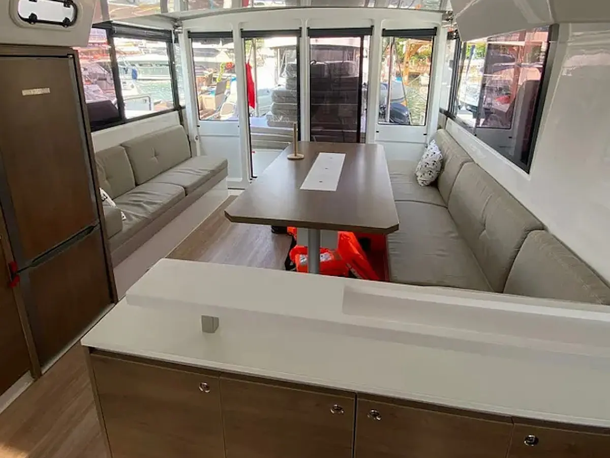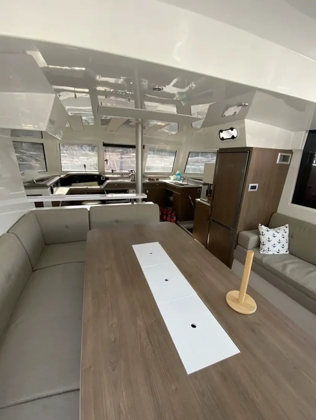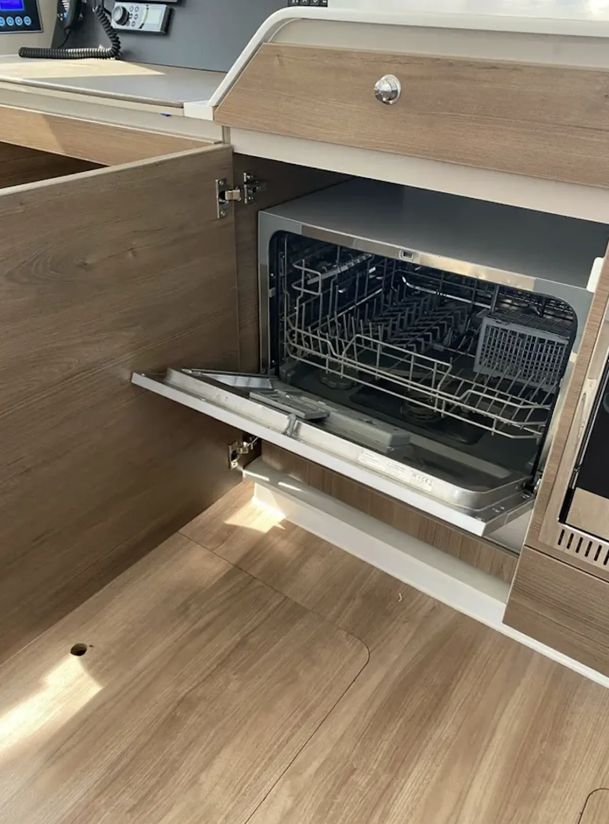 Generator, Elektrische Winch (Segel), Bimini, Beiboot, Solar-Panele, Klimaanlage, Flybridge, Inverter, Wassermacher, Kaffeemaschine, Heizung, Kühlschrank, Lautsprecher im Cockpit, Grill im Cockpit, Cockpit-Kissen