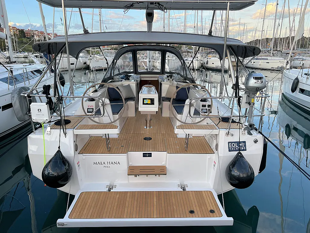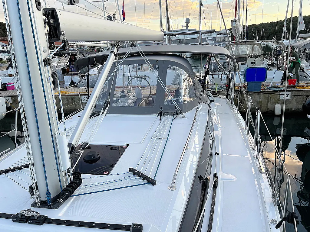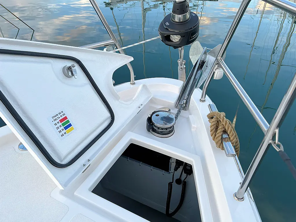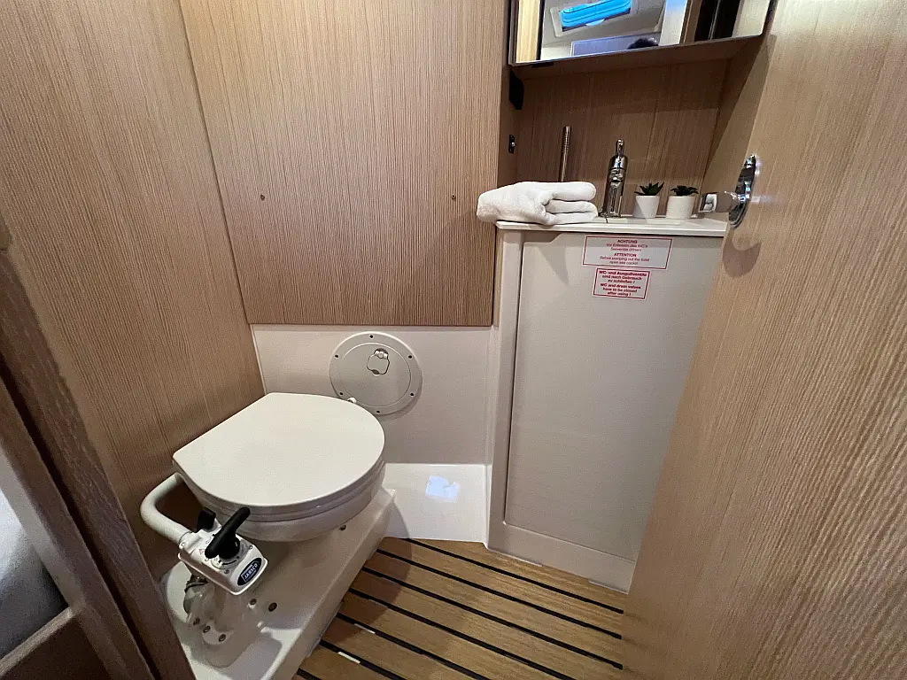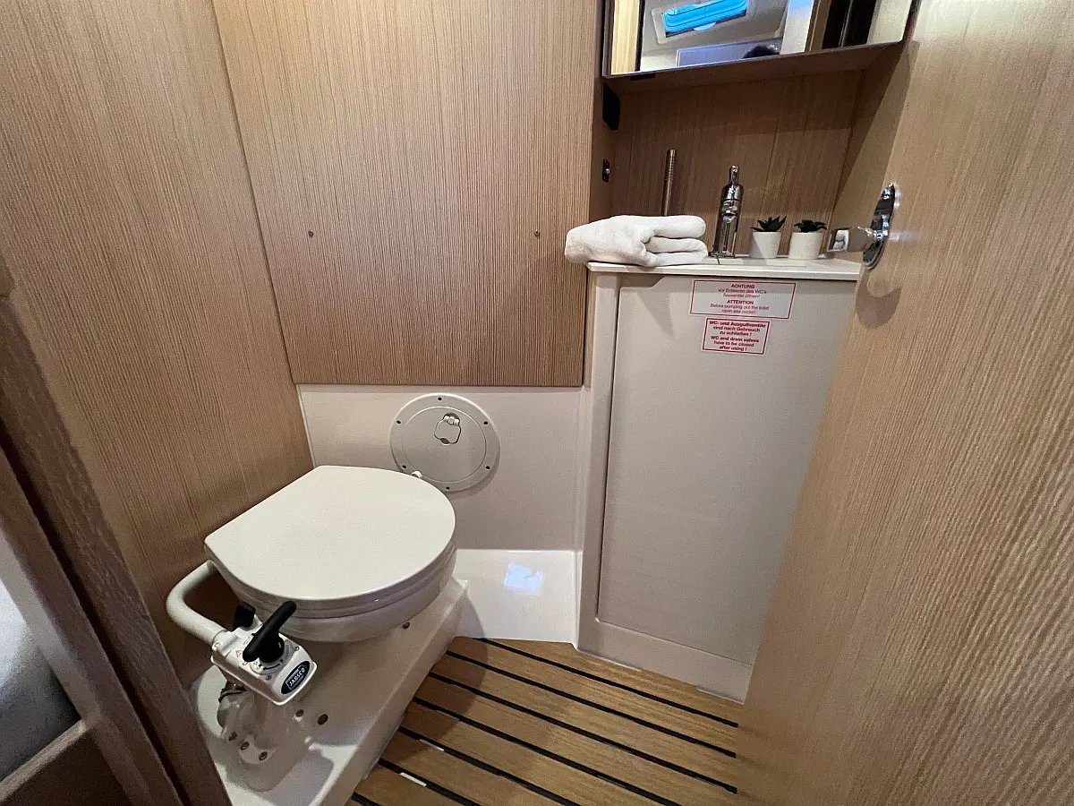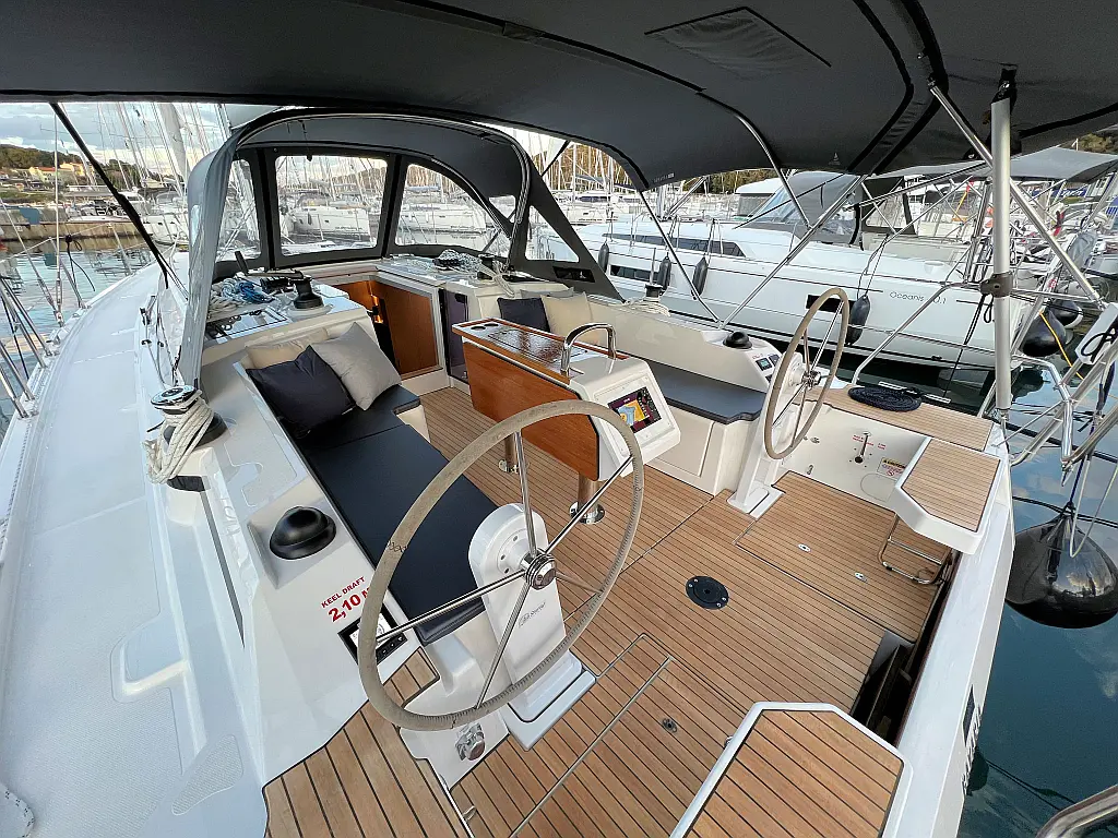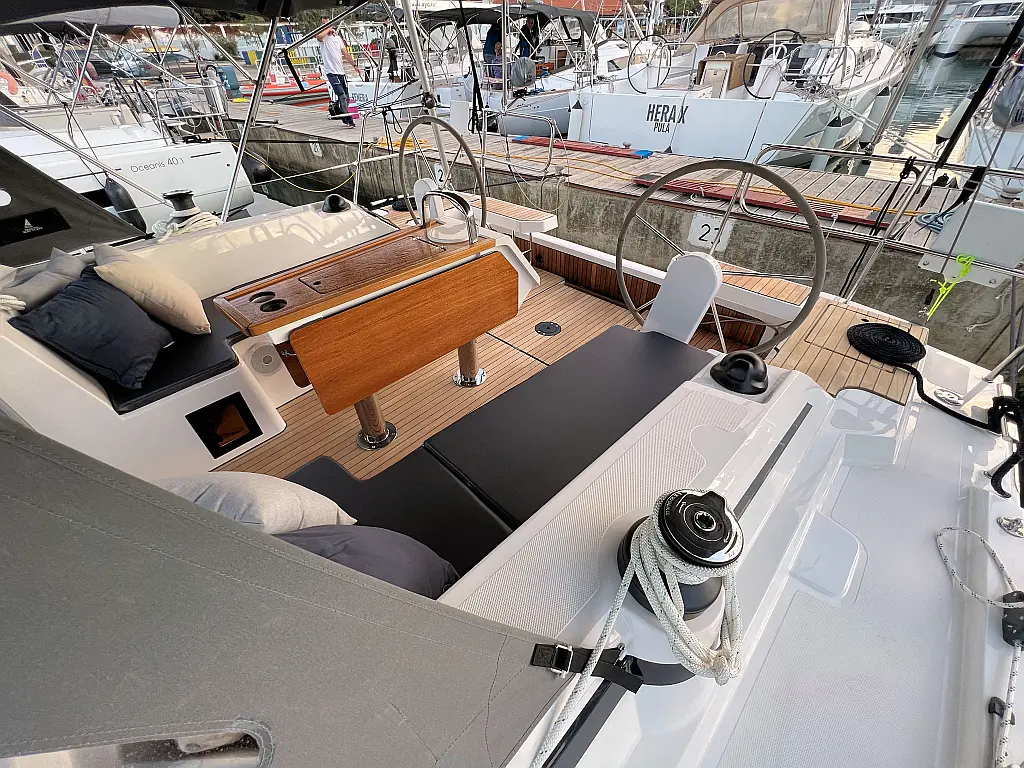 Lautsprecher im Cockpit, Fäkalientank, Bimini, Cockpit-Kissen, Beiboot, Sprayhood, Teak Cockpit, Kühlschrank, Heizung, Solar-Panele