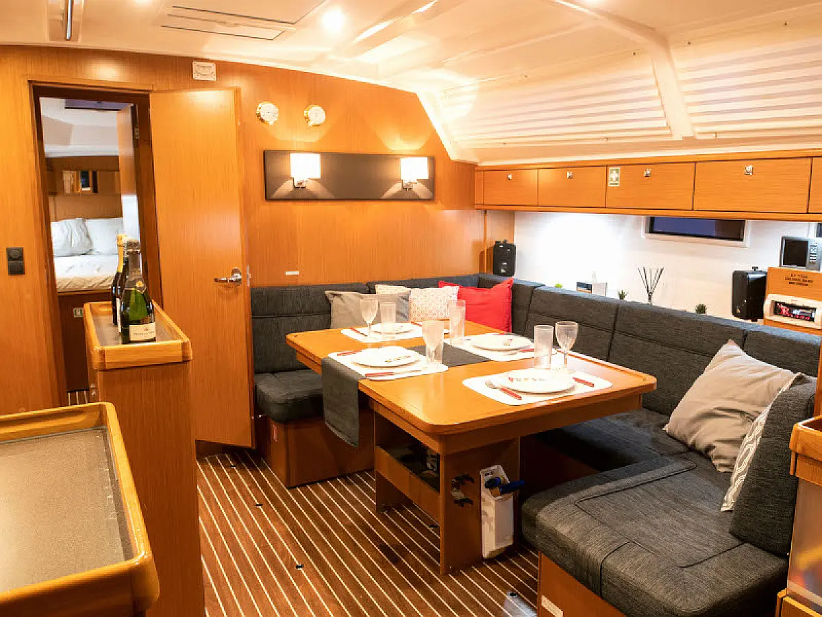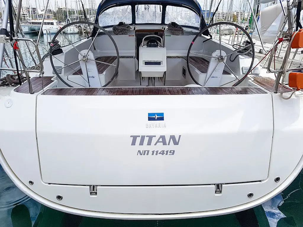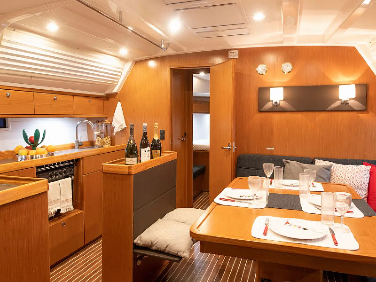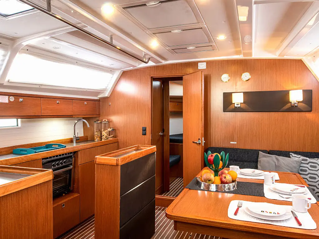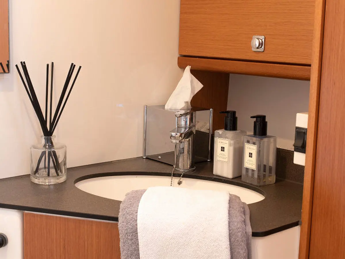 Lautsprecher im Cockpit, Badeplattform, Bimini, Kühlschrank, Außenbordmotor, Beiboot, Sprayhood, Hydraulische Gangway