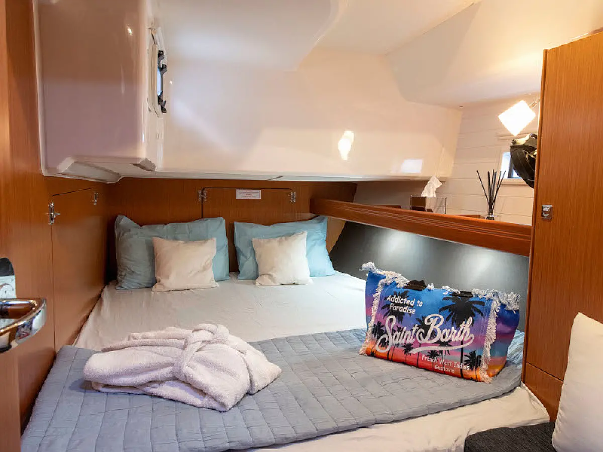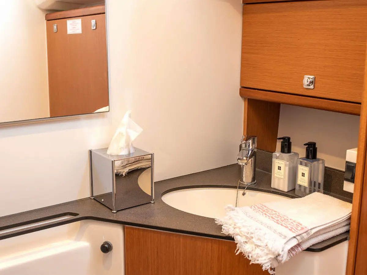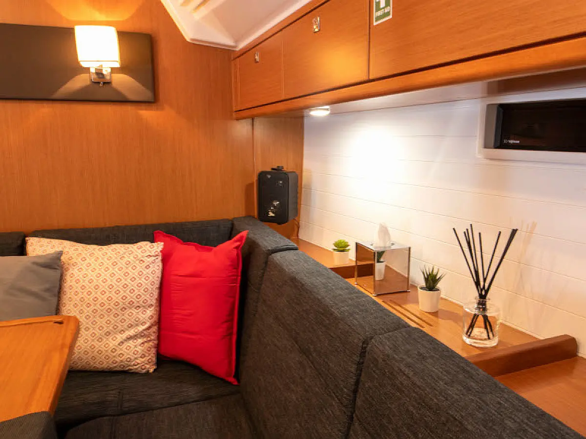 Lautsprecher im Cockpit, Badeplattform, Bimini, Kühlschrank, Außenbordmotor, Beiboot, Sprayhood, Hydraulische Gangway
