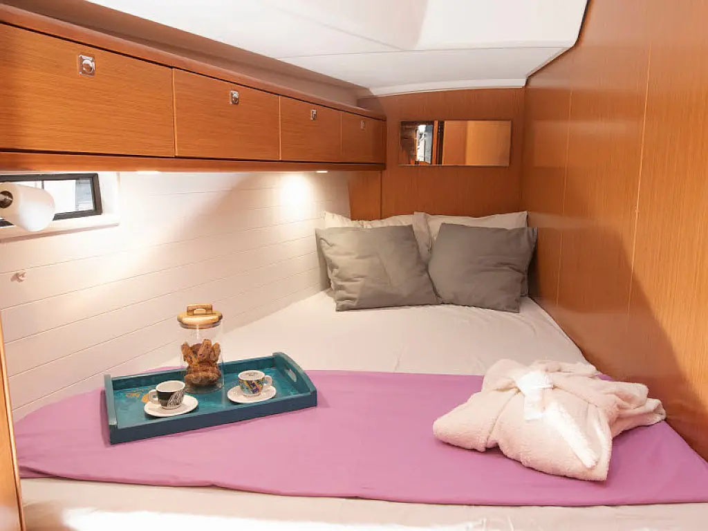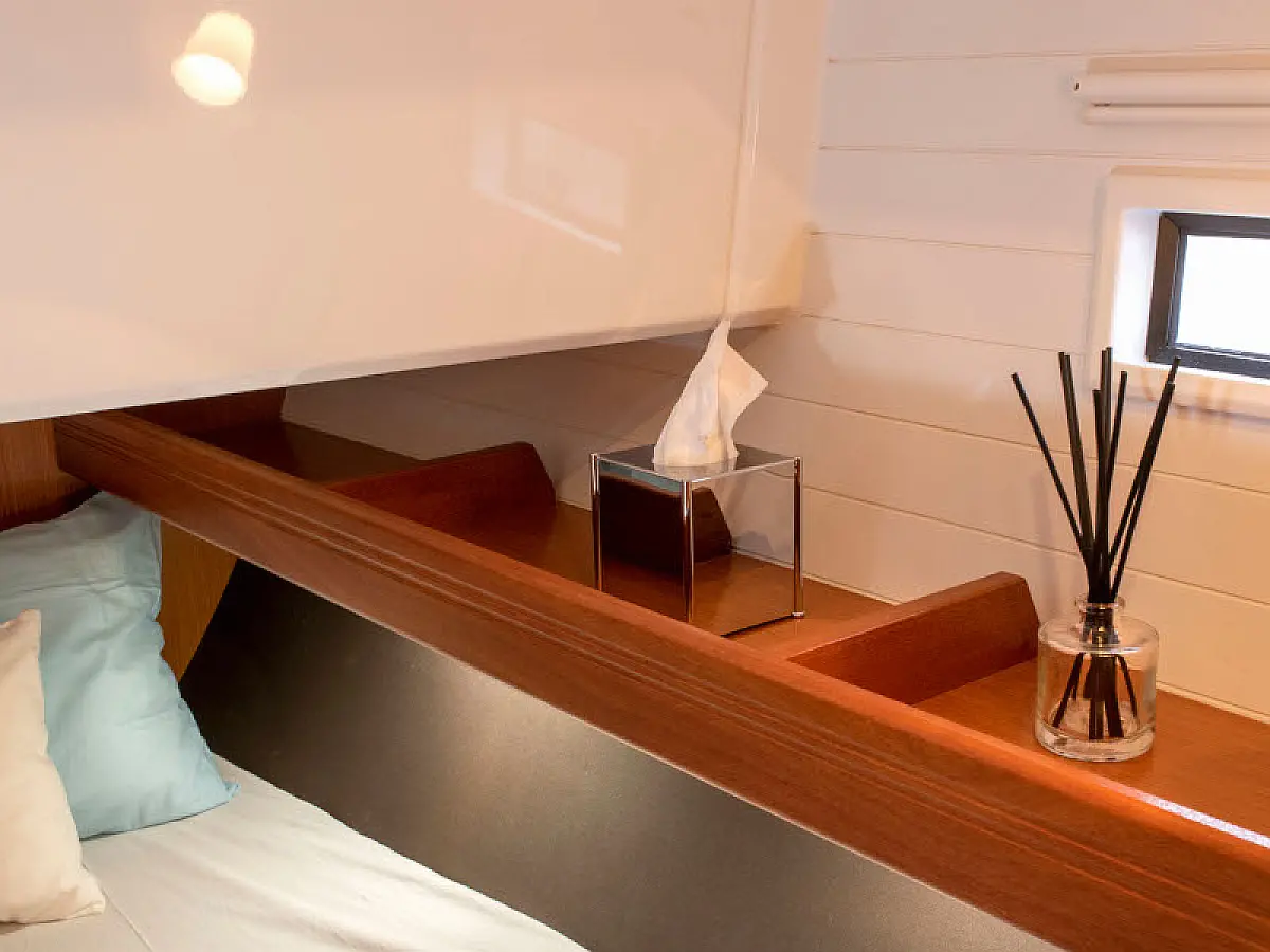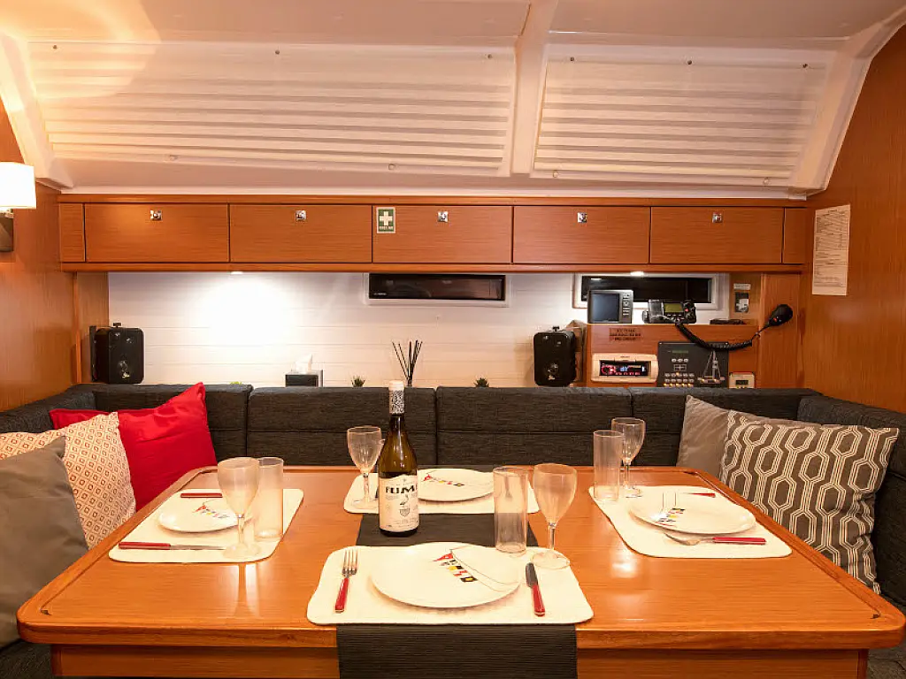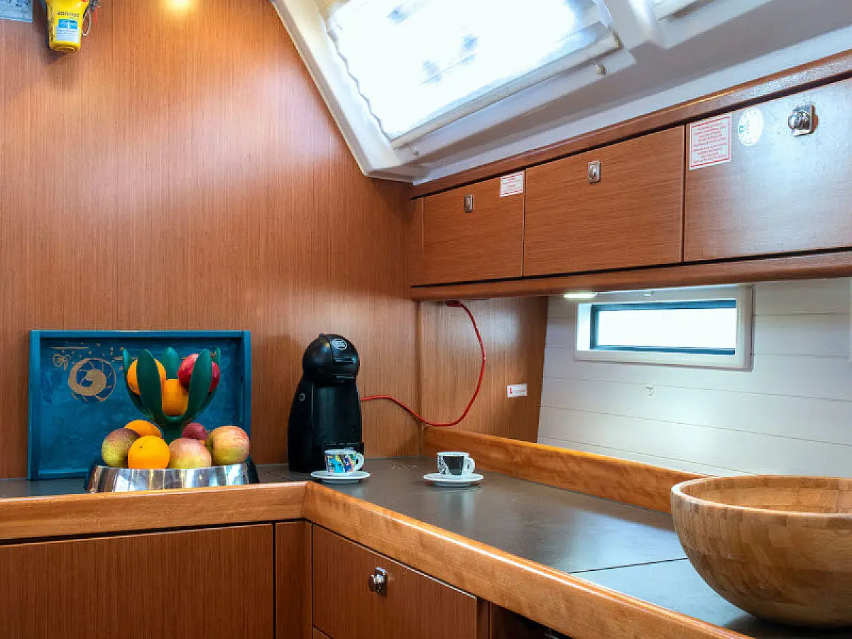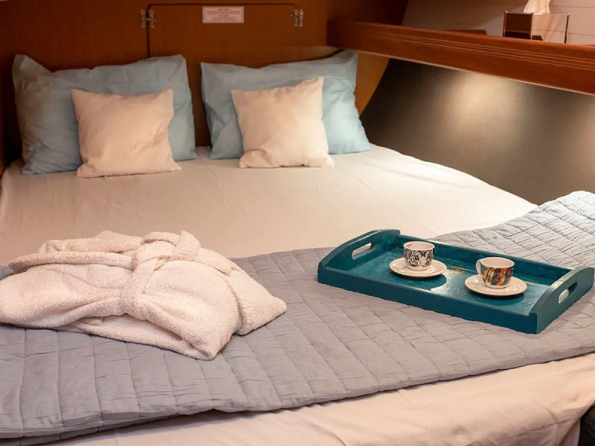 Lautsprecher im Cockpit, Badeplattform, Bimini, Kühlschrank, Außenbordmotor, Beiboot, Sprayhood, Hydraulische Gangway