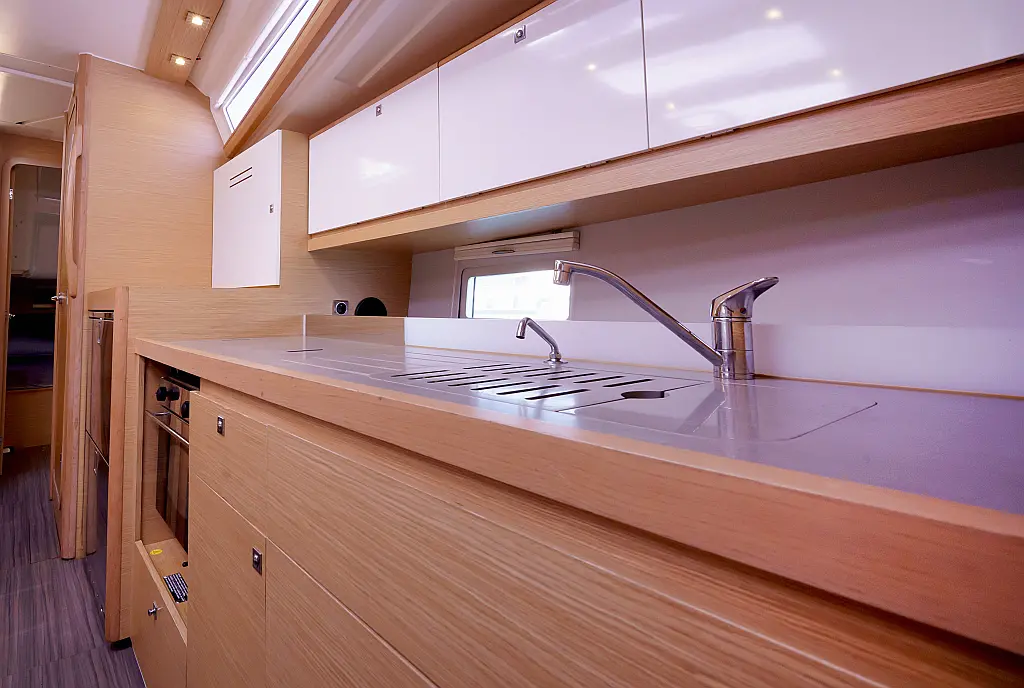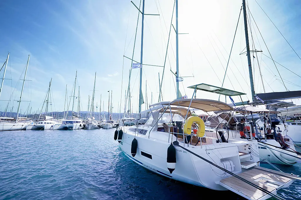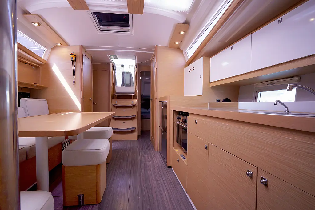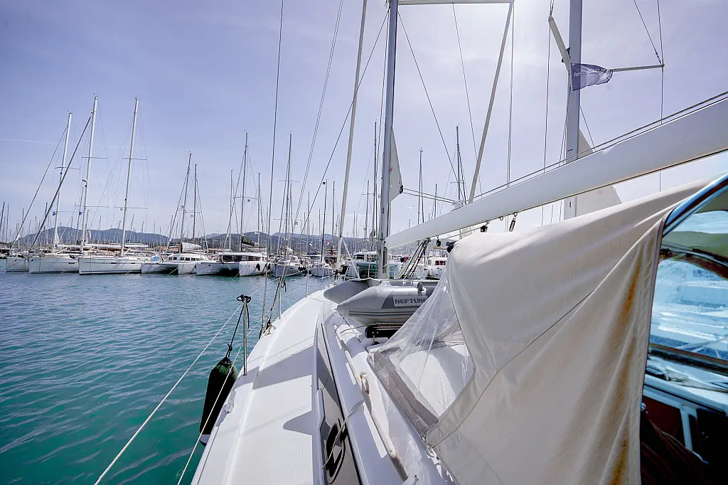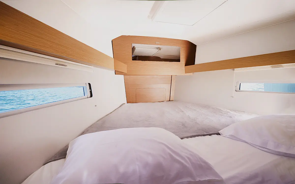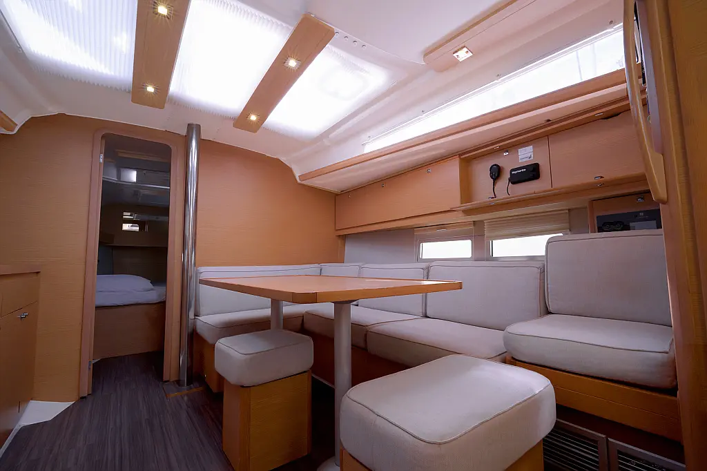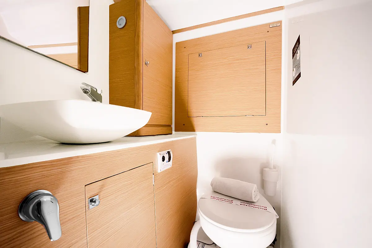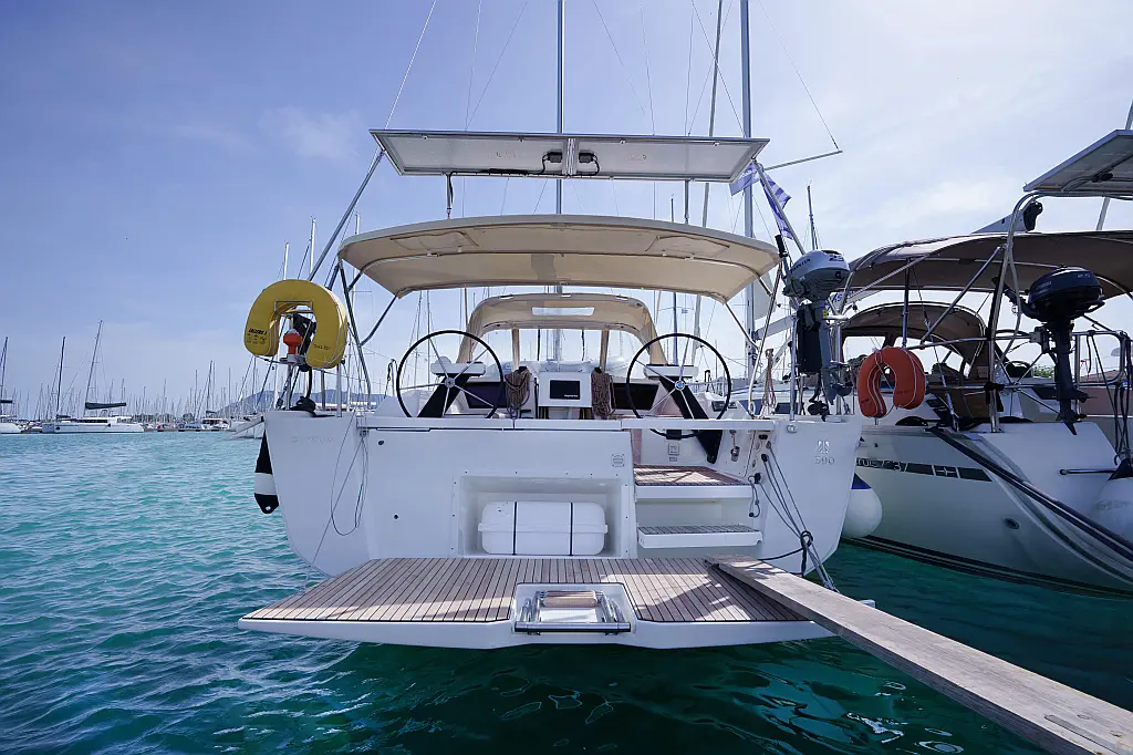 Klimaanlage, Umwandelbarer Tisch, Sprayhood, Fäkalientank, Bimini, Beiboot, Lautsprecher im Cockpit, Elektrische Toilette, Solar-Panele, Cockpit-Kissen, Teak Cockpit, Grill im Cockpit