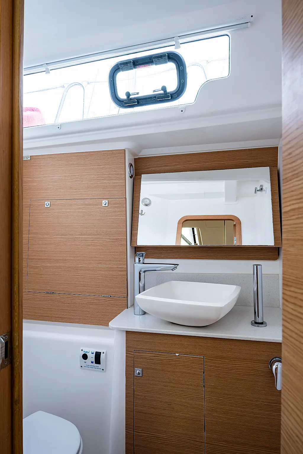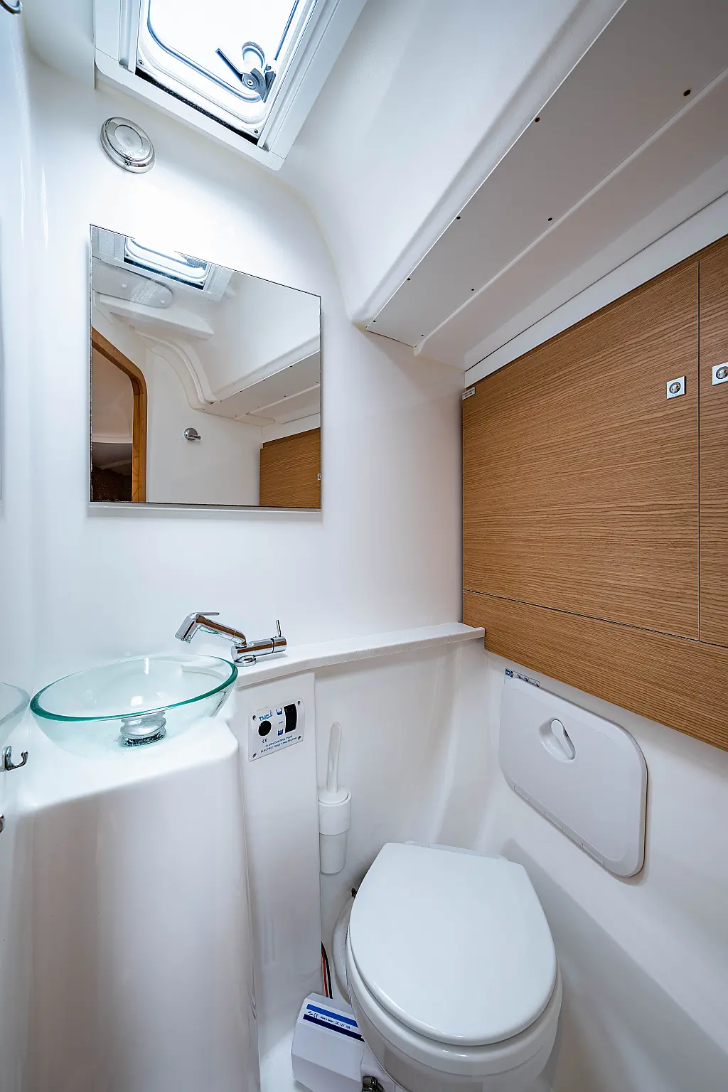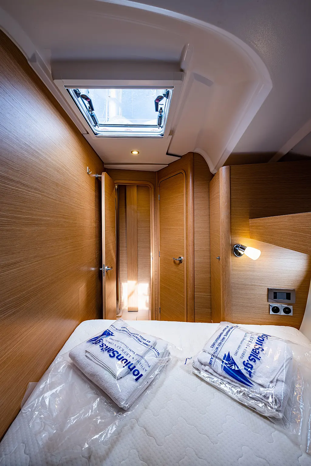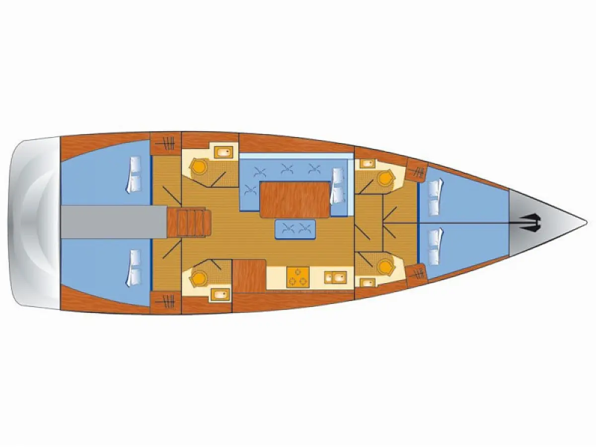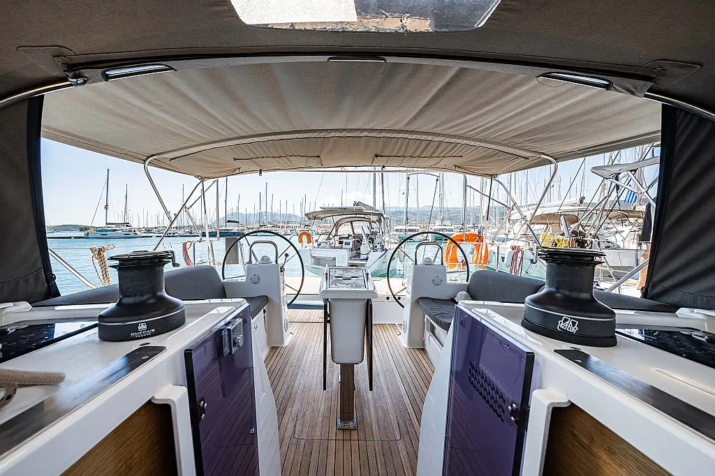 Klimaanlage, Umwandelbarer Tisch, Fäkalientank, Bimini, Sprayhood, Beiboot, Lautsprecher im Cockpit, Elektrische Winch (Segel), Elektrische Toilette, Solar-Panele, Generator, Cockpit-Kissen, Teak Cockpit