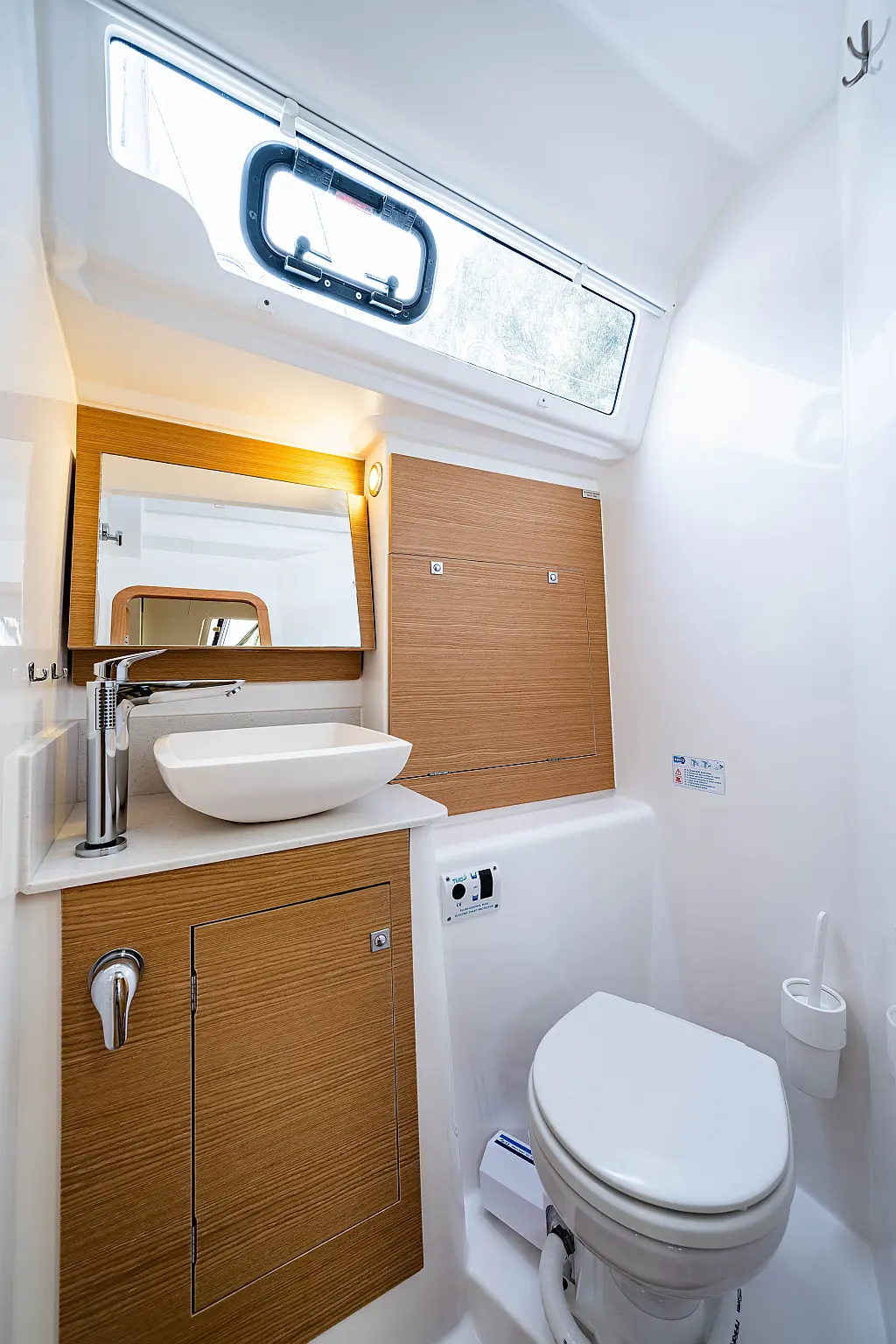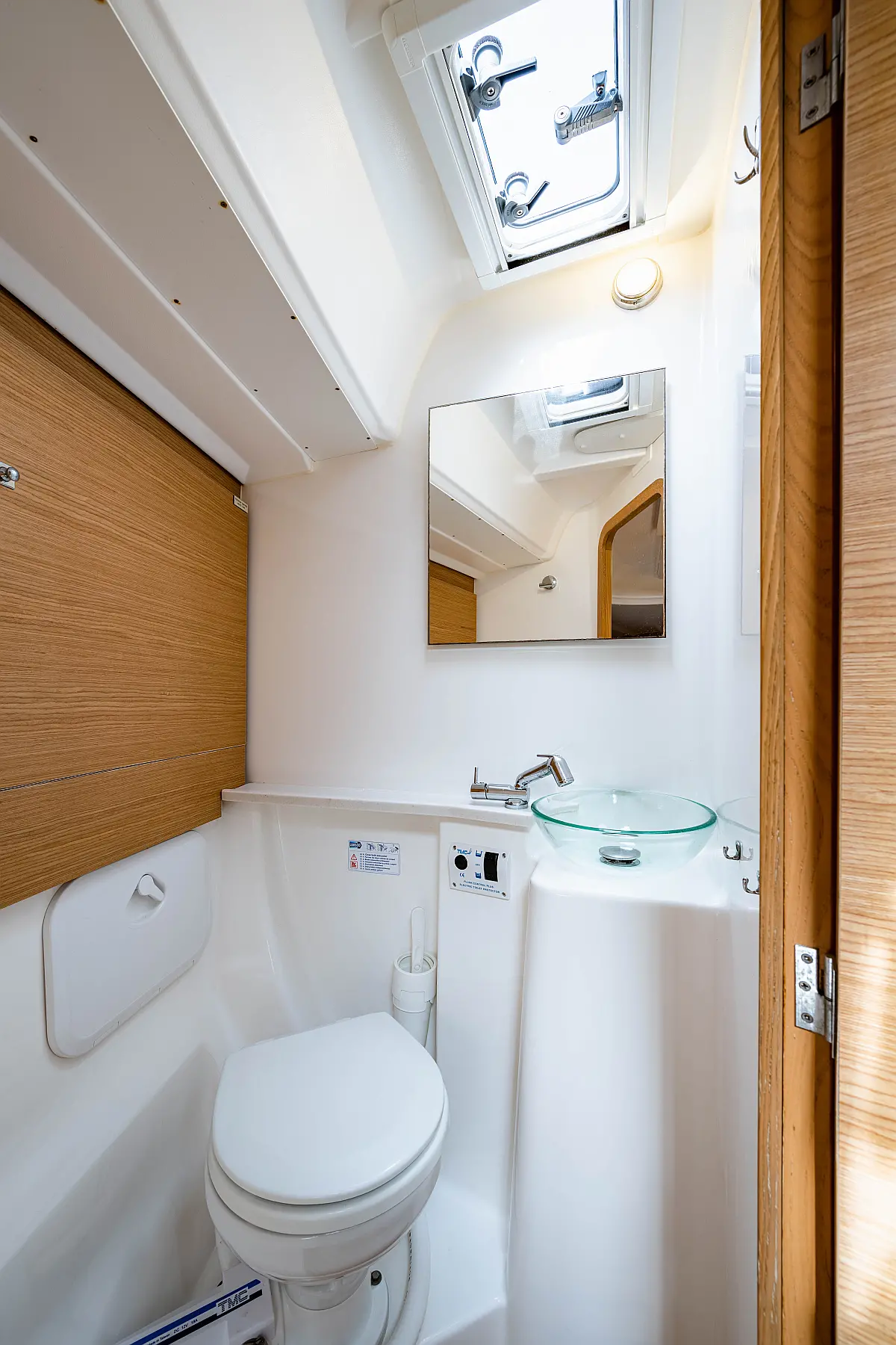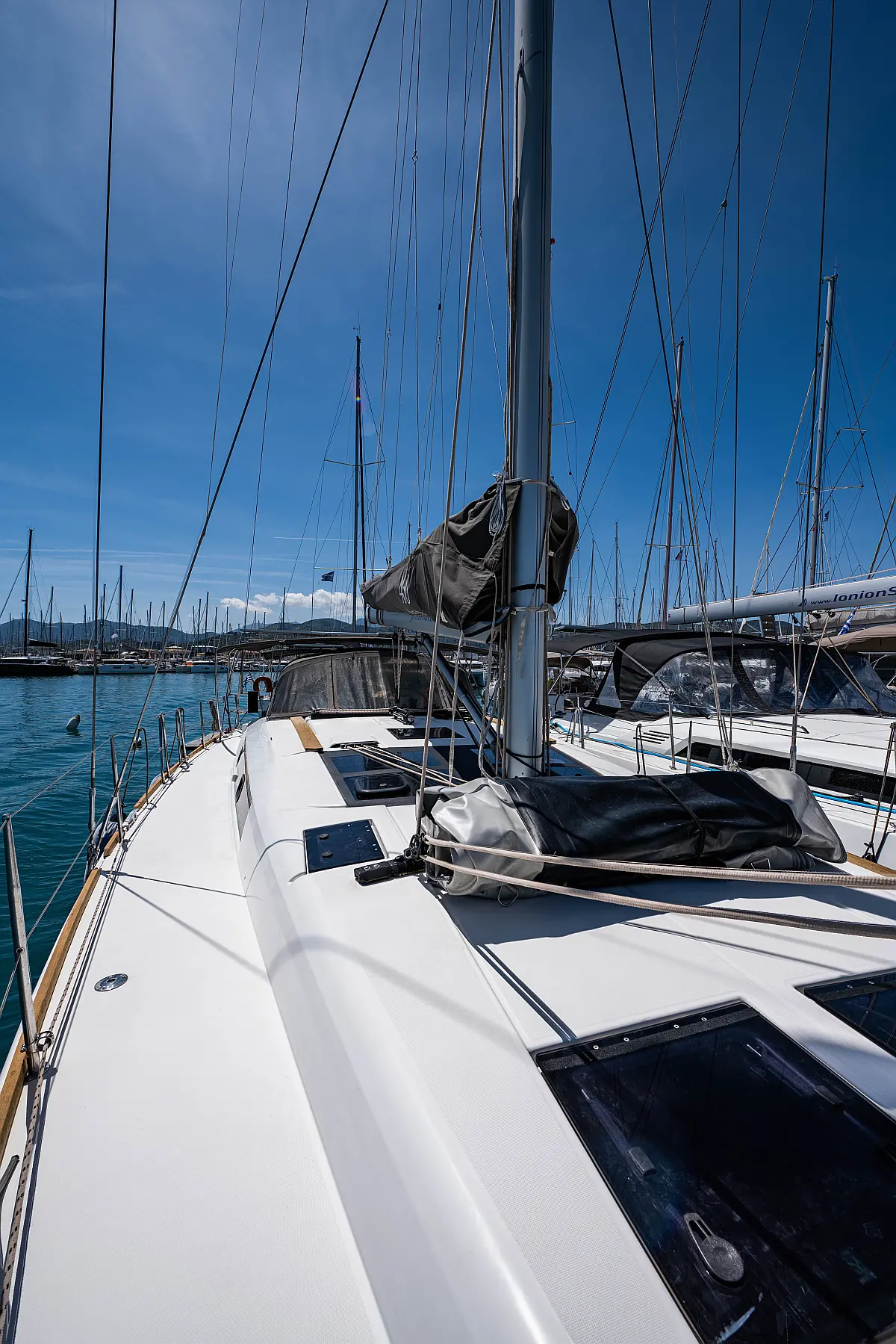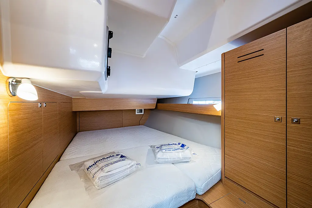 Klimaanlage, Umwandelbarer Tisch, Fäkalientank, Bimini, Sprayhood, Beiboot, Lautsprecher im Cockpit, Elektrische Winch (Segel), Elektrische Toilette, Solar-Panele, Generator, Cockpit-Kissen, Teak Cockpit