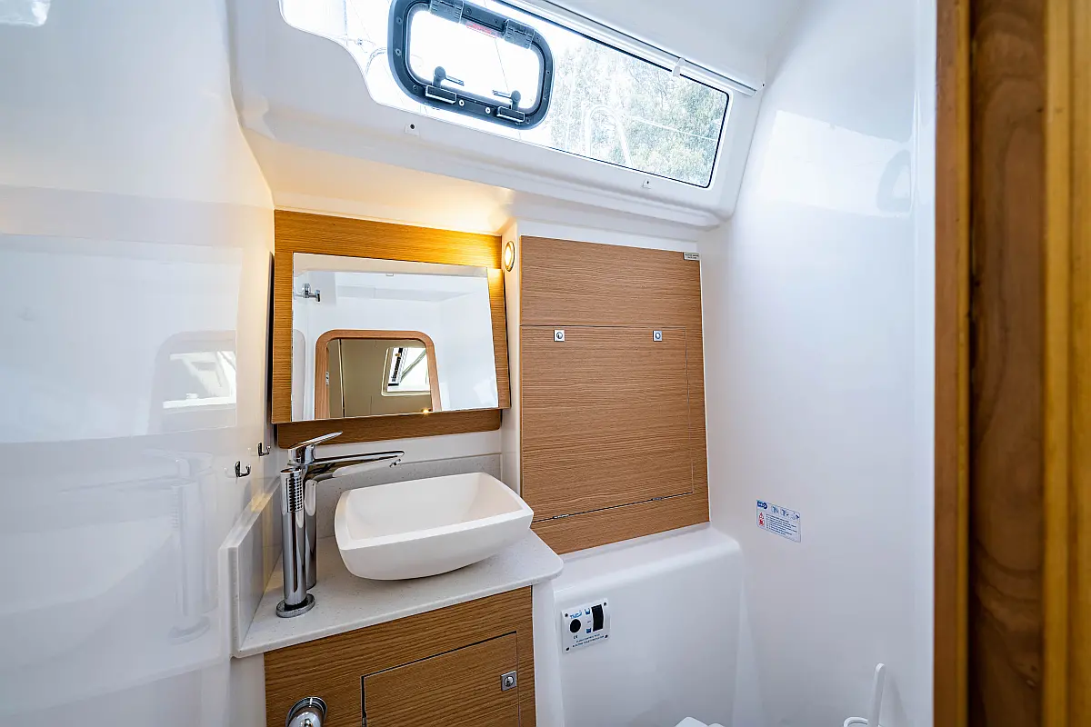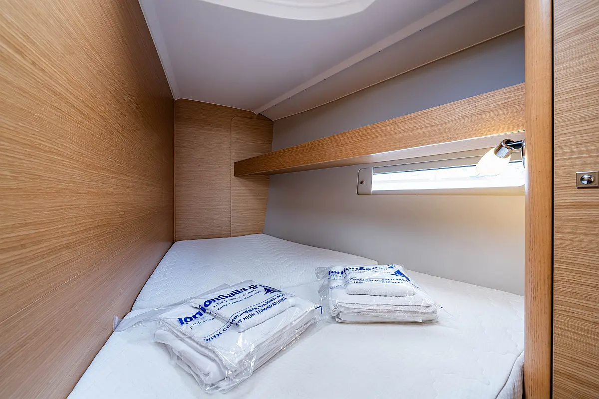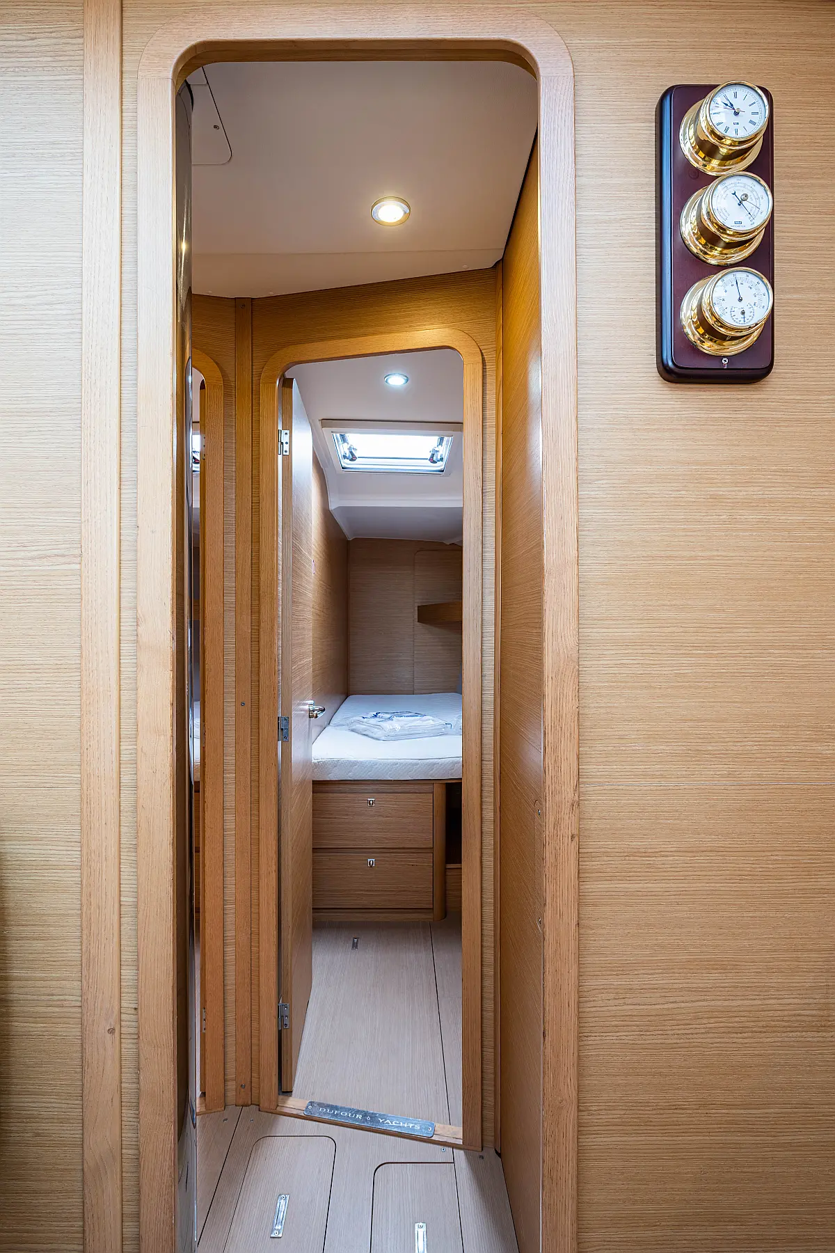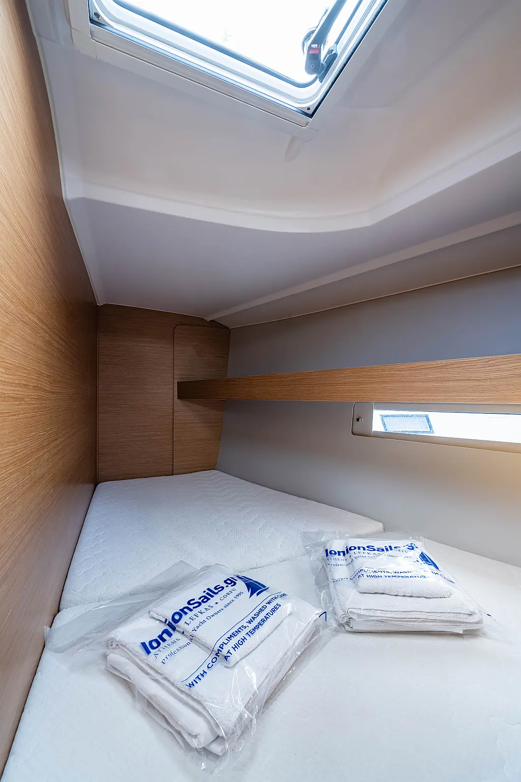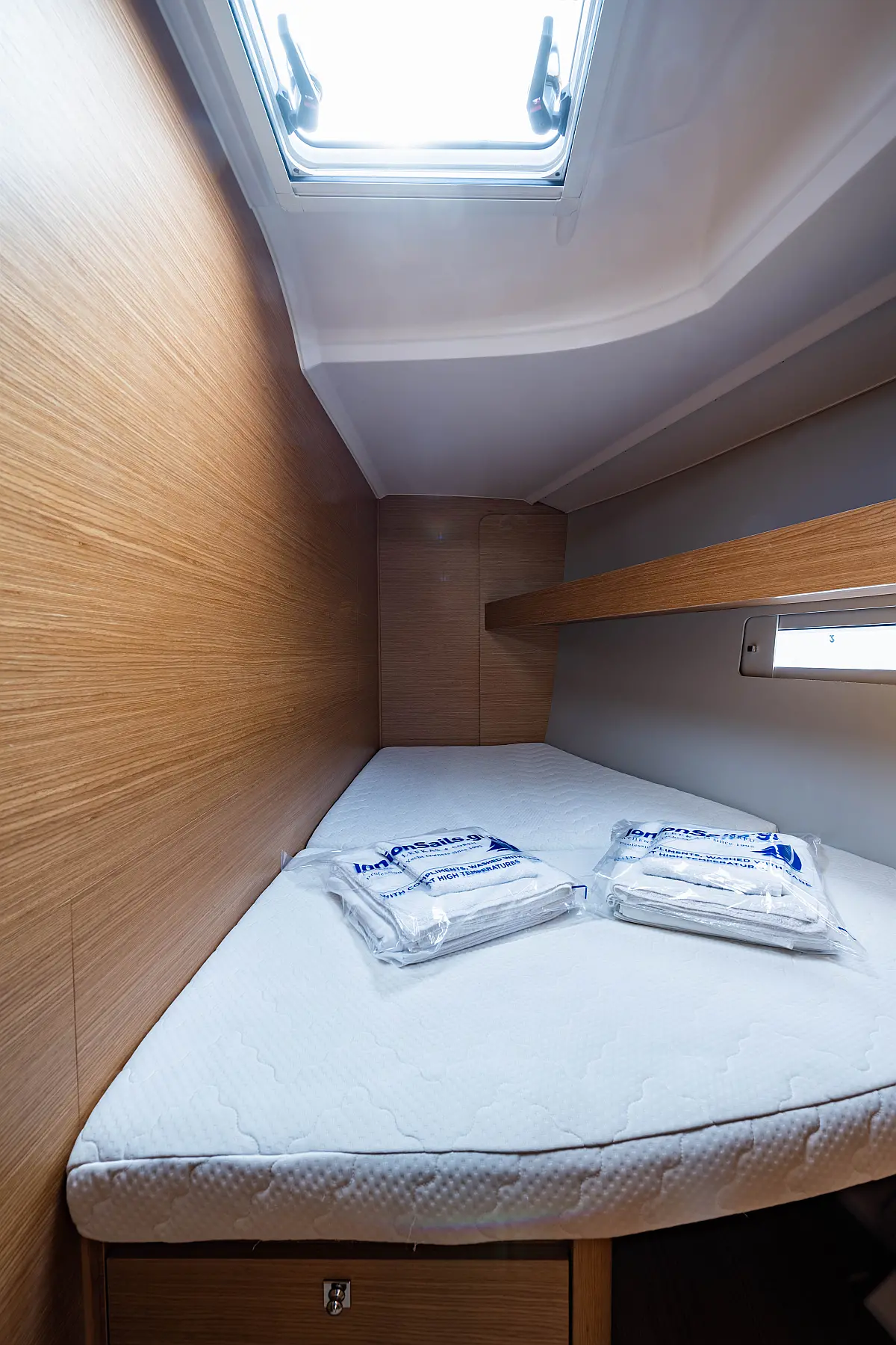 Klimaanlage, Umwandelbarer Tisch, Fäkalientank, Bimini, Sprayhood, Beiboot, Lautsprecher im Cockpit, Elektrische Winch (Segel), Elektrische Toilette, Solar-Panele, Generator, Cockpit-Kissen, Teak Cockpit