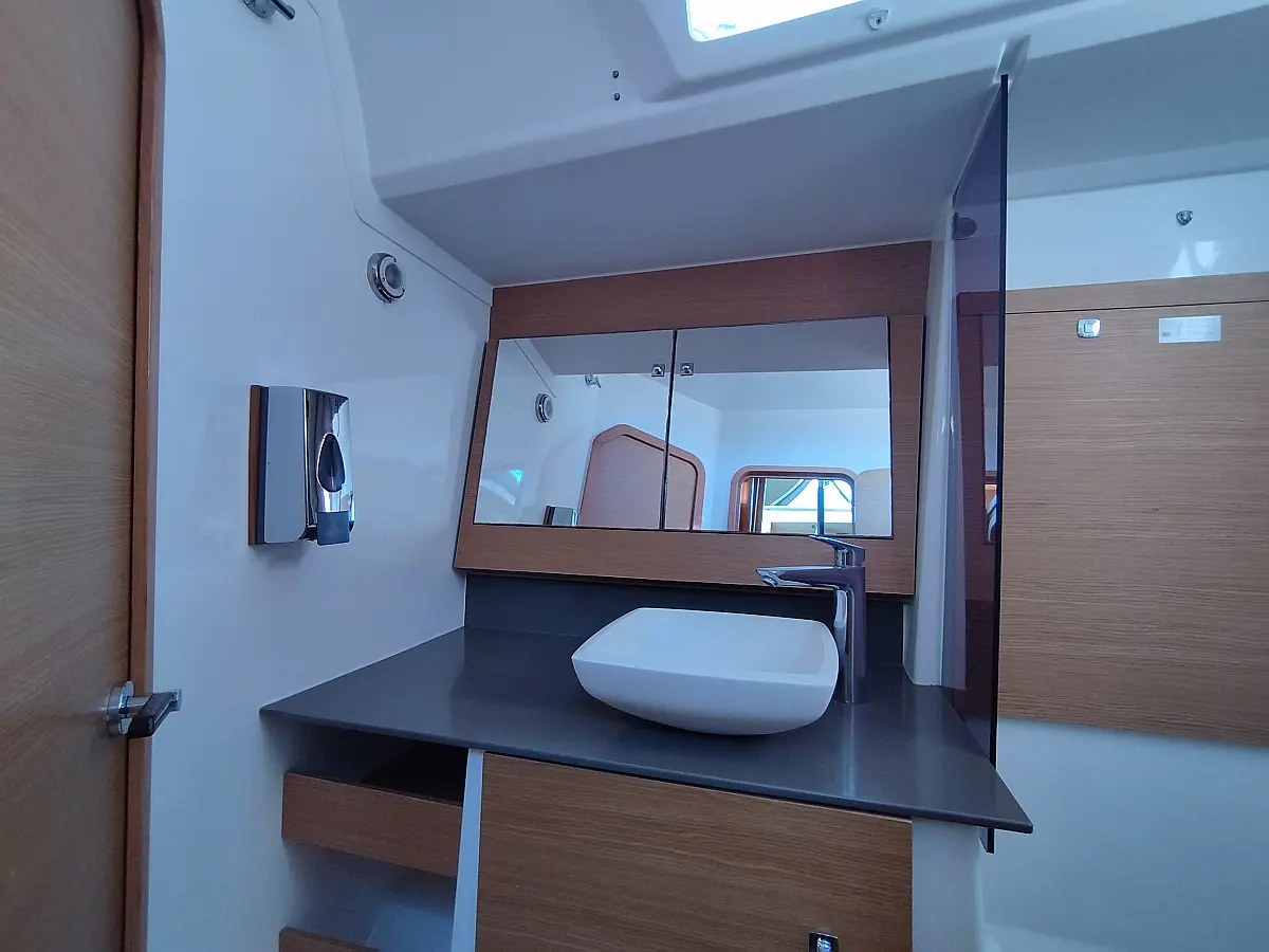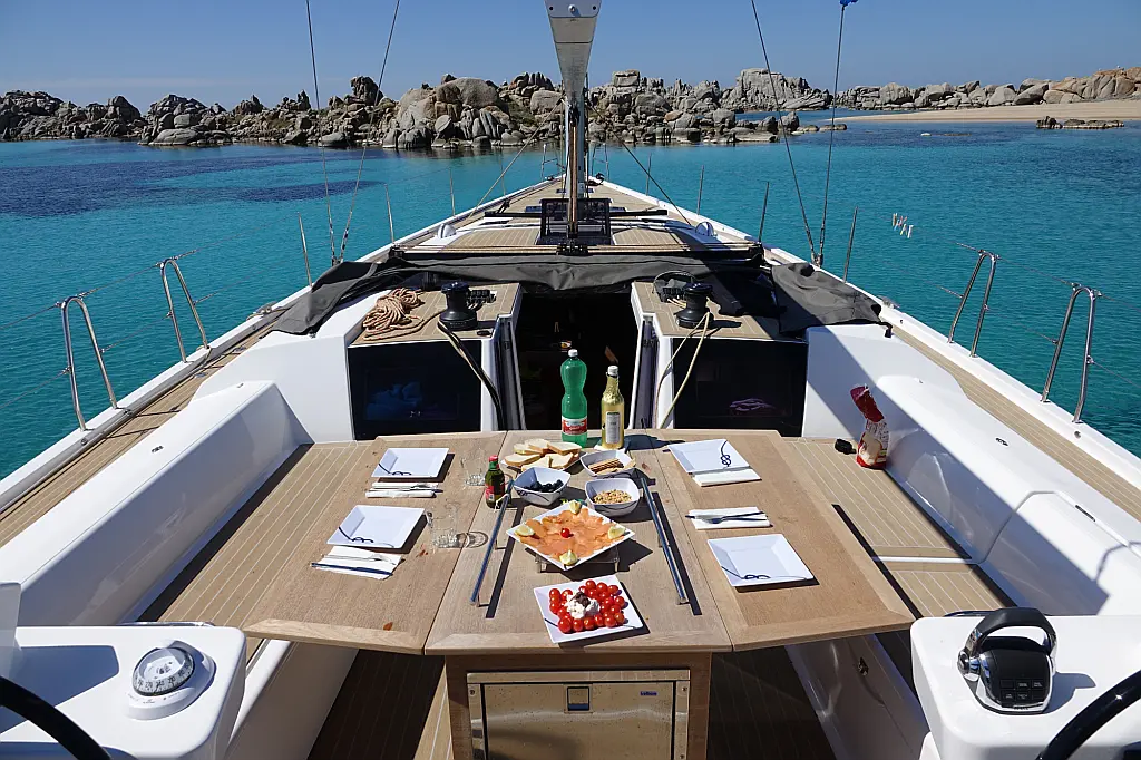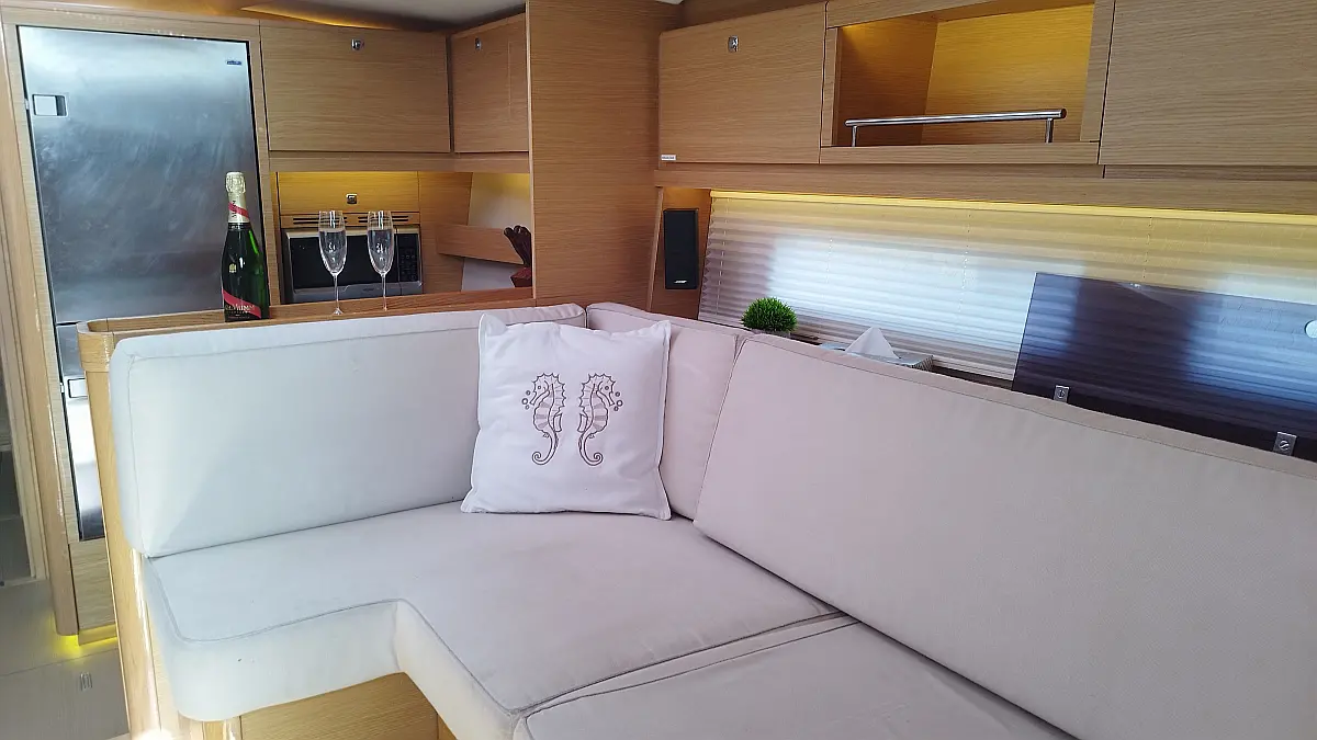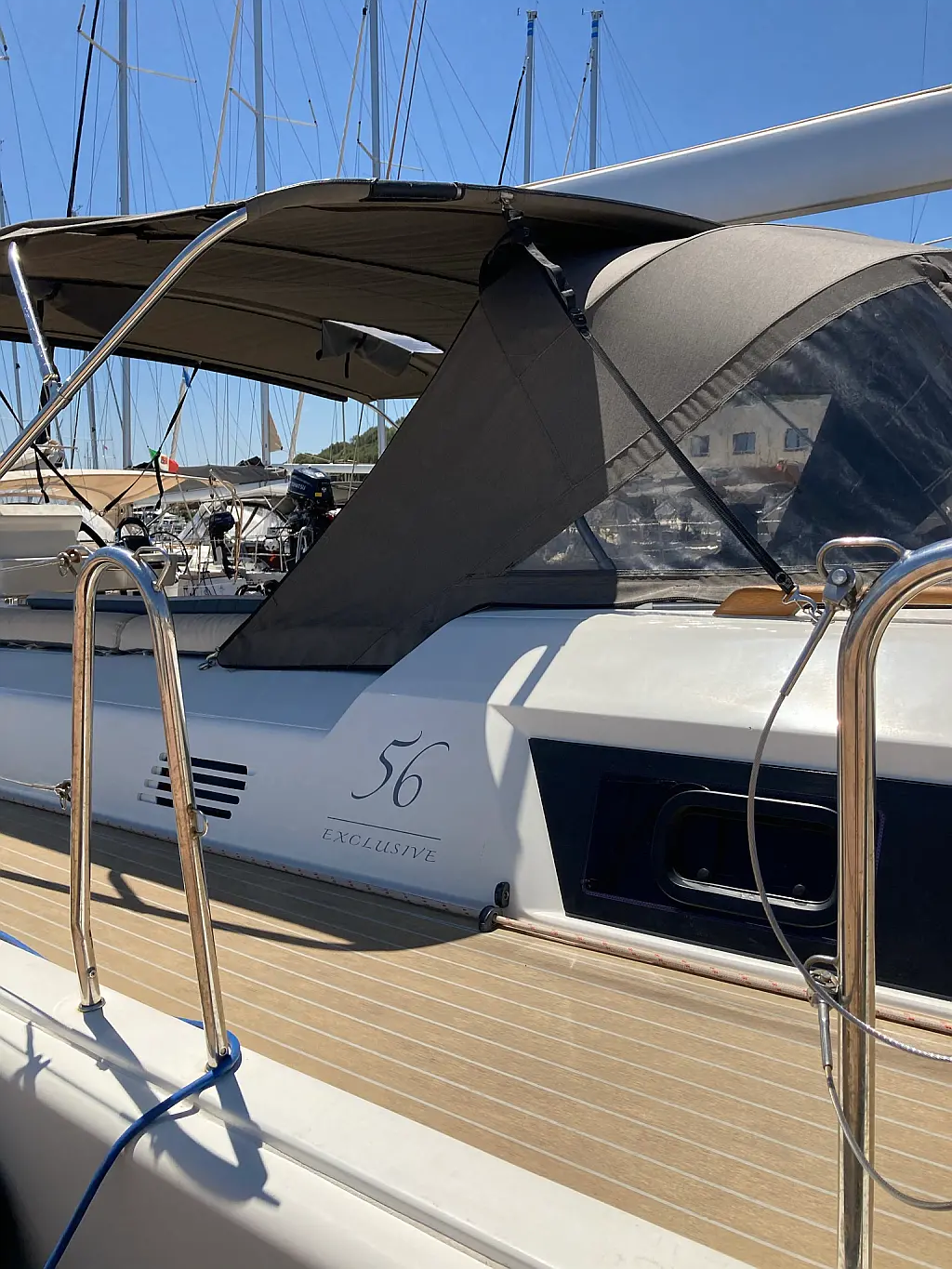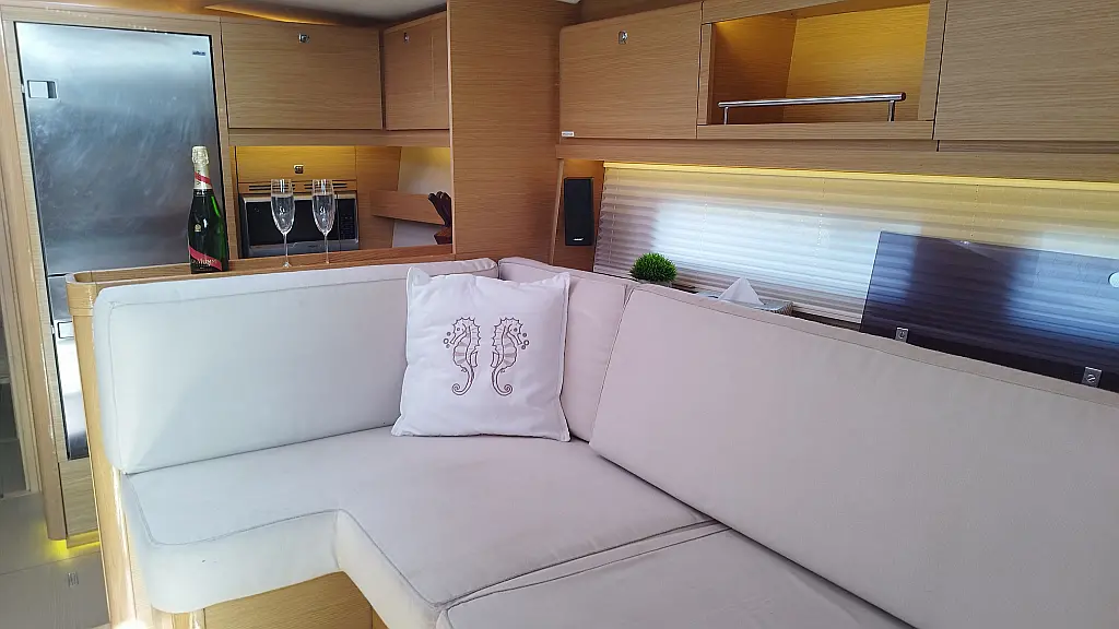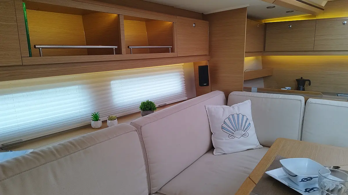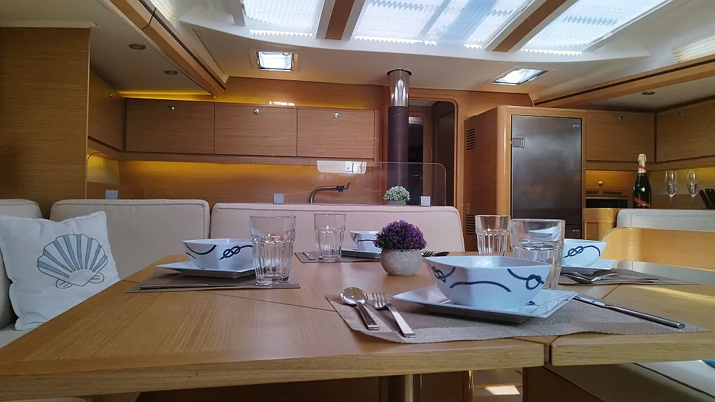 Cockpit-Kissen, Grill im Cockpit, Teakdeck, Elektrische Toilette, Kühlschrank, Badeplattform, Elektrische Winch (Segel), Hydraulische Gangway, Inverter