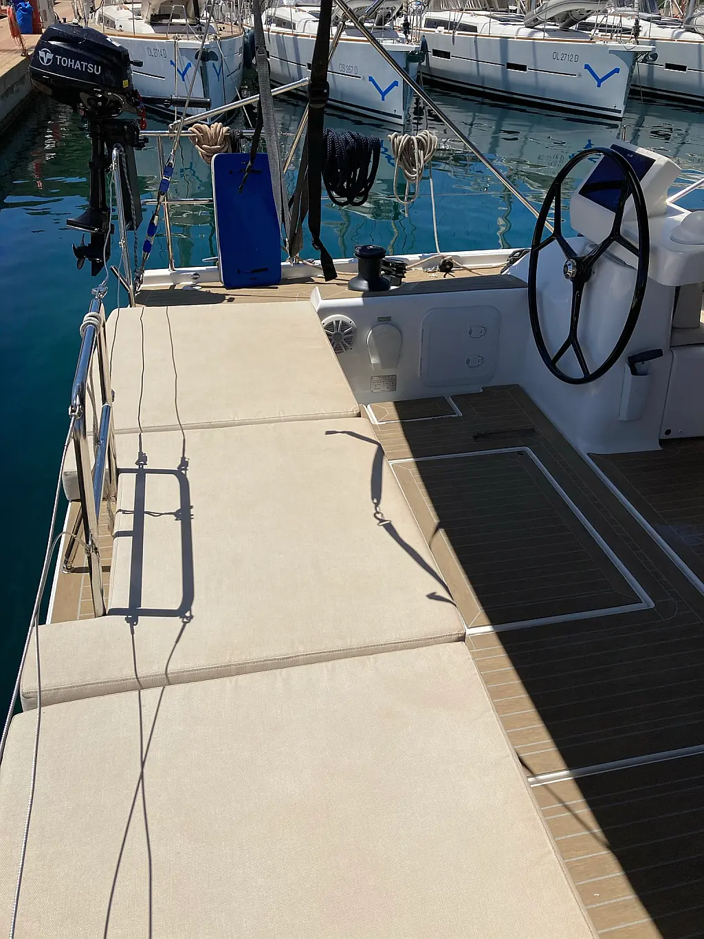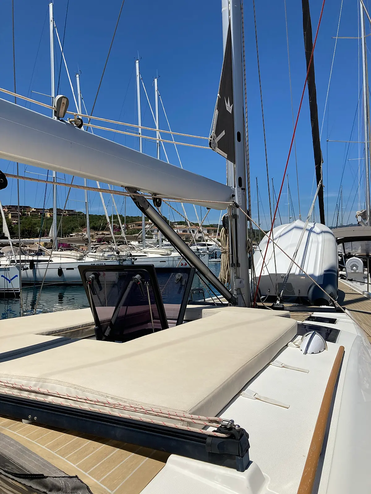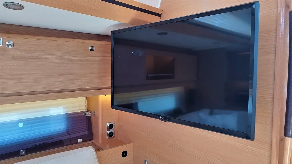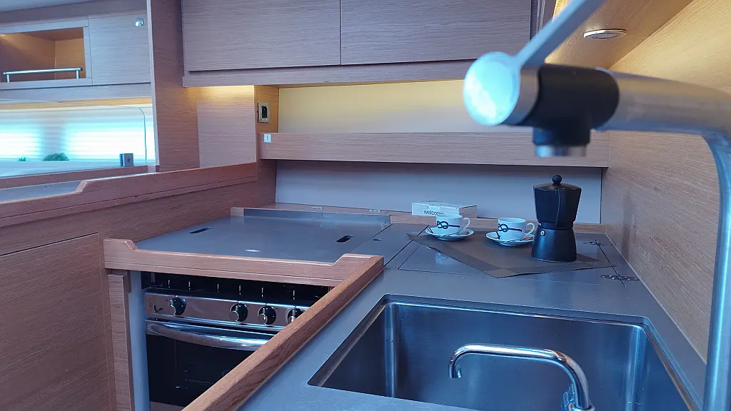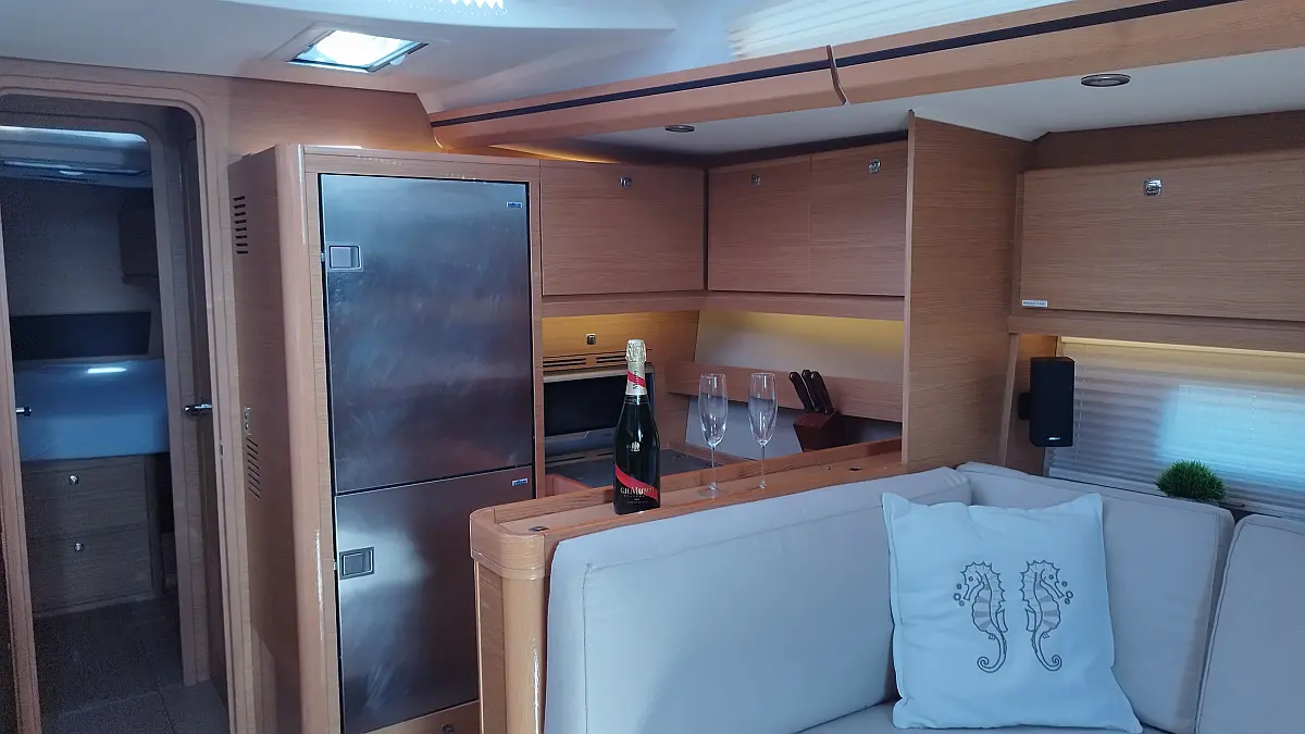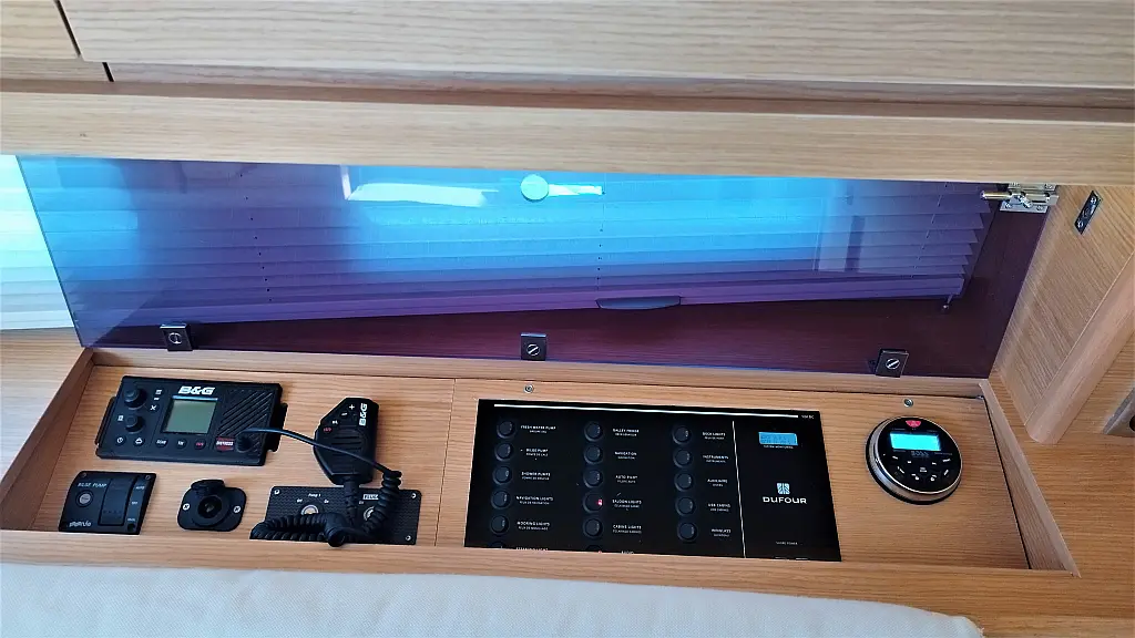 Cockpit-Kissen, Grill im Cockpit, Teakdeck, Elektrische Toilette, Kühlschrank, Badeplattform, Elektrische Winch (Segel), Hydraulische Gangway, Inverter