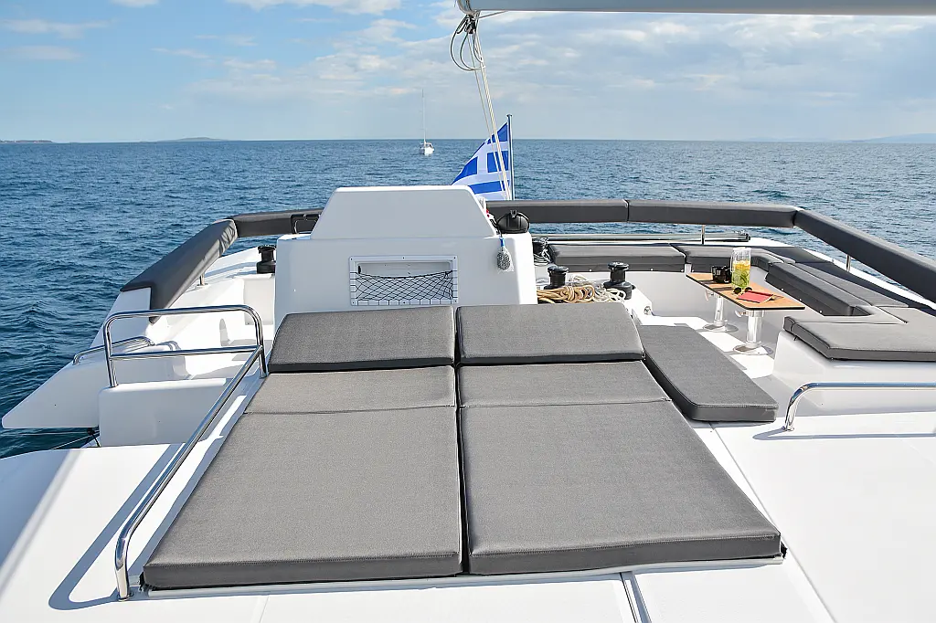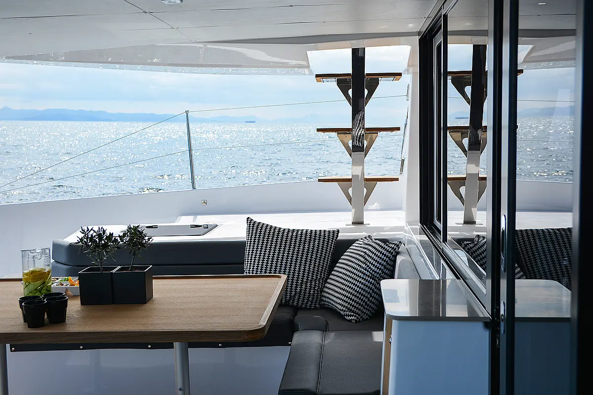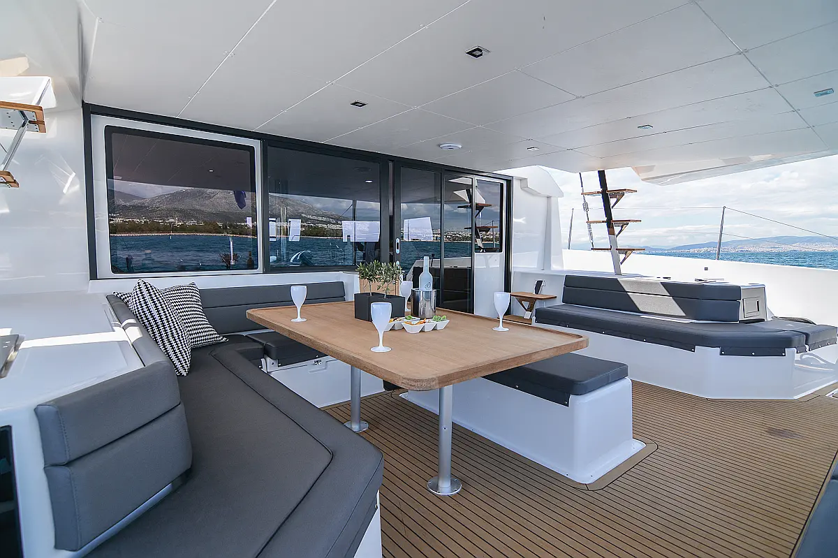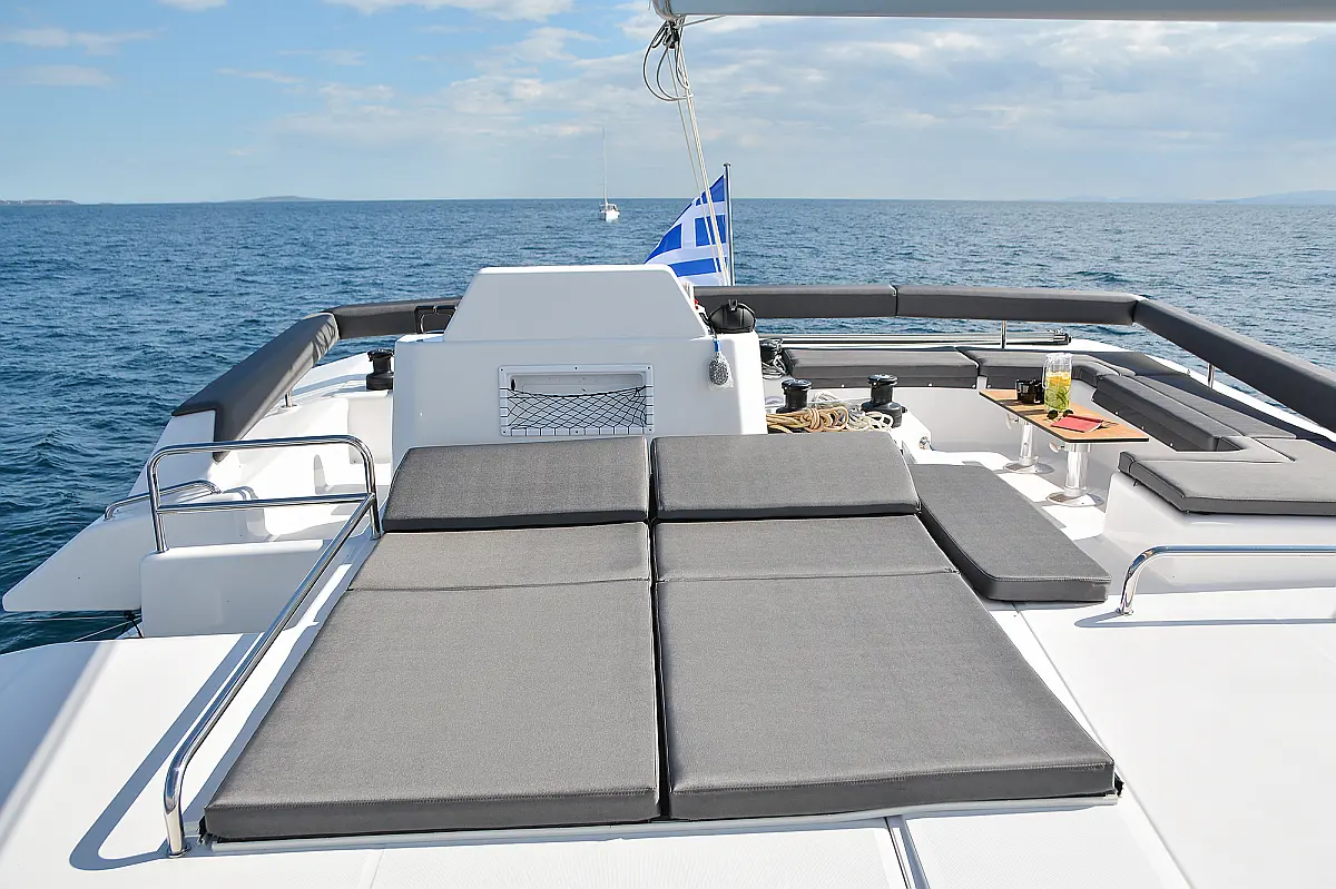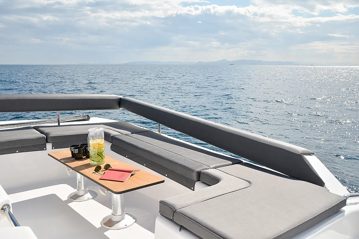 Flybridge, Grill im Cockpit, Kühlschrank, Kaffeemaschine, Generator, Wassermacher, Inverter, Bimini, Außenbordmotor, Beiboot, Klimaanlage, Cockpit-Kissen, Lautsprecher im Cockpit, Teak Cockpit, Wi-Fi und Internet