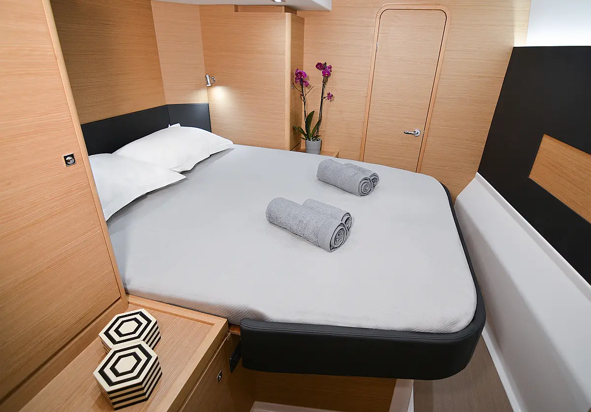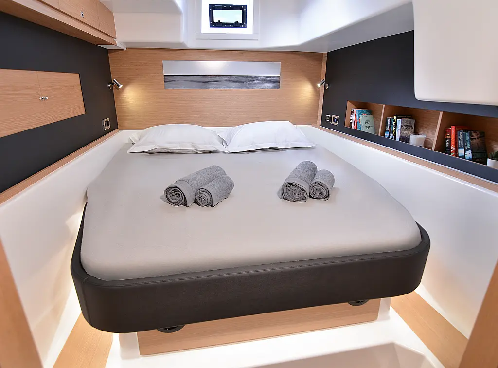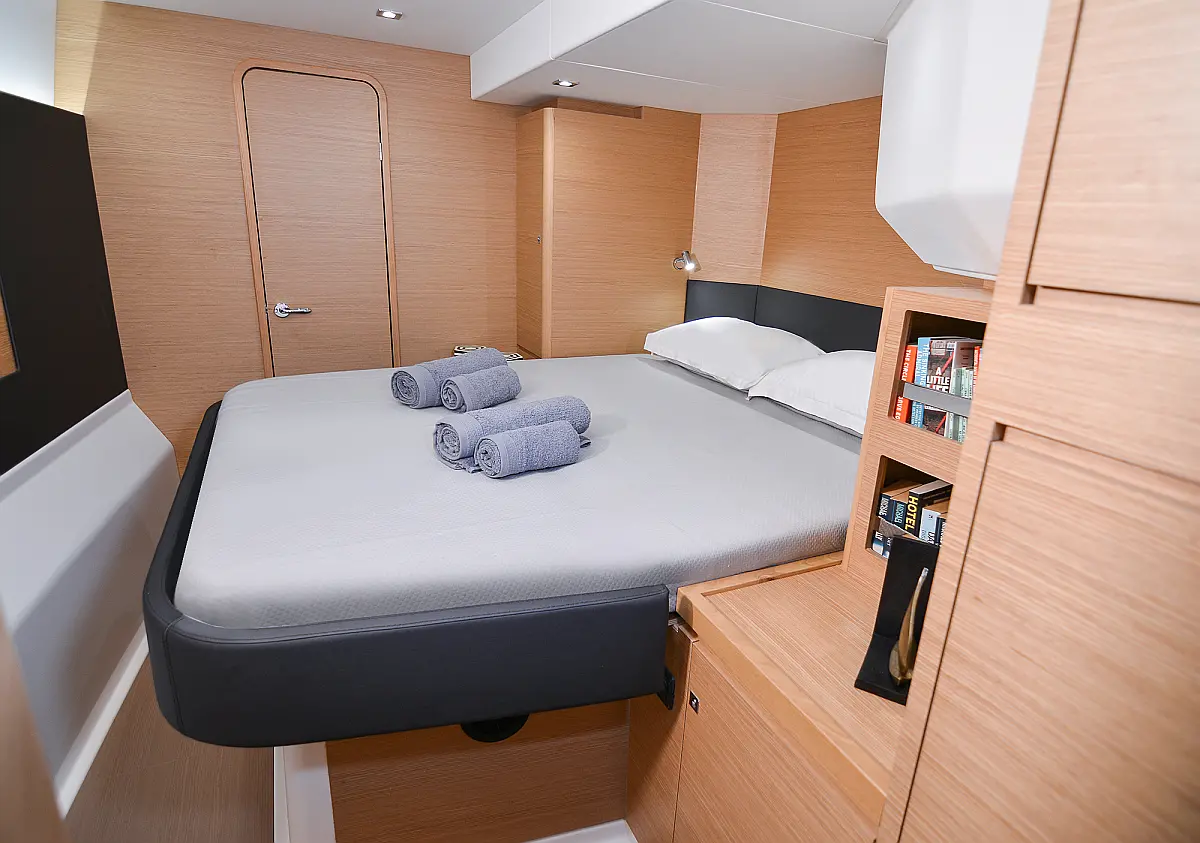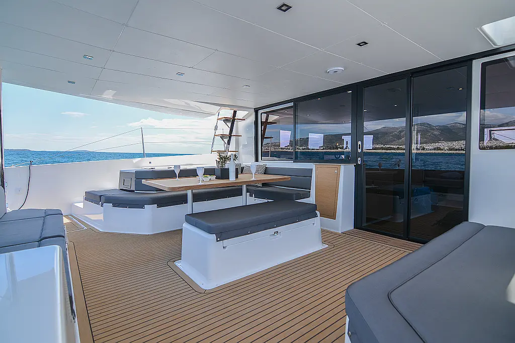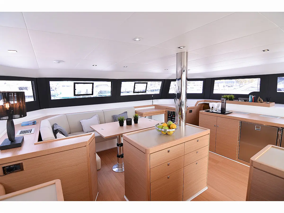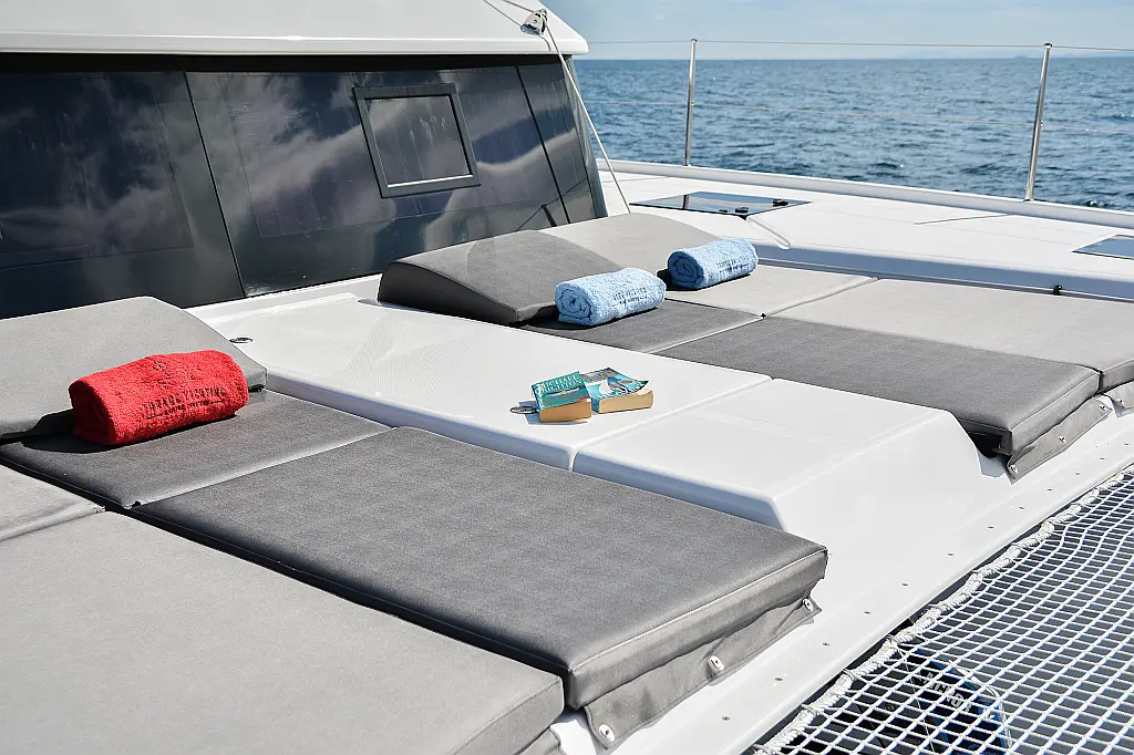 Flybridge, Grill im Cockpit, Kühlschrank, Kaffeemaschine, Generator, Wassermacher, Inverter, Bimini, Außenbordmotor, Beiboot, Klimaanlage, Cockpit-Kissen, Lautsprecher im Cockpit, Teak Cockpit, Wi-Fi und Internet