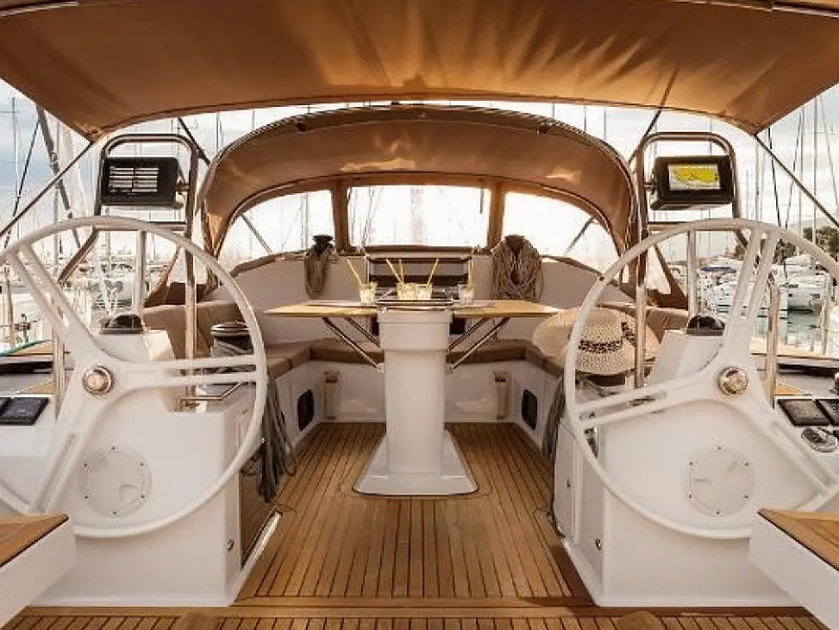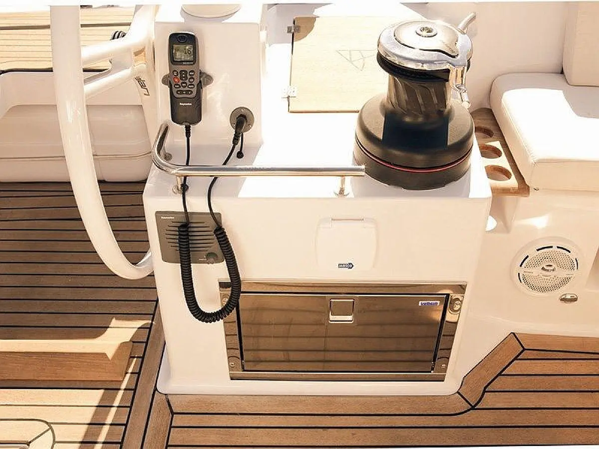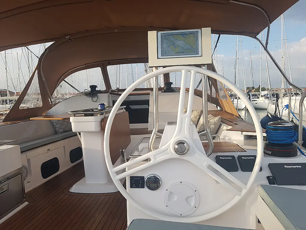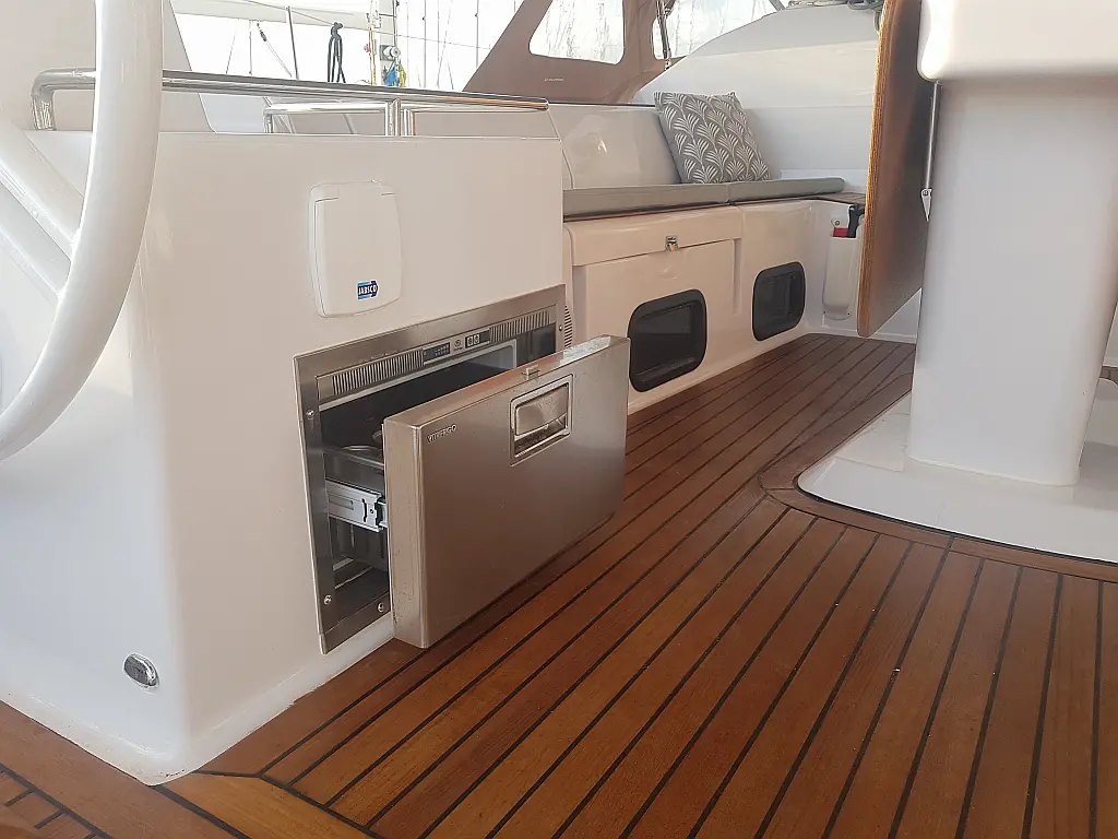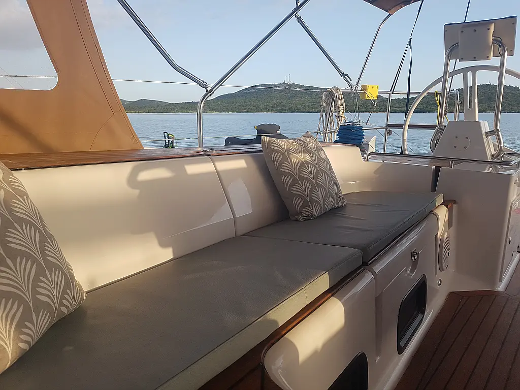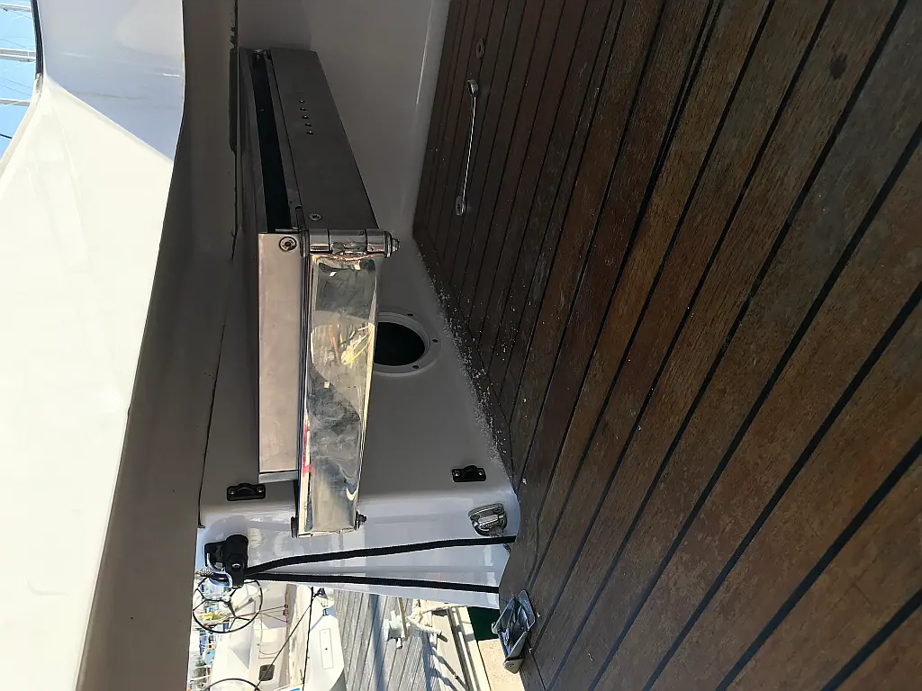 Bimini, Lautsprecher im Cockpit, Beiboot, Sprayhood, Teak Cockpit, Solar-Panele, Kühlschrank, Klimaanlage