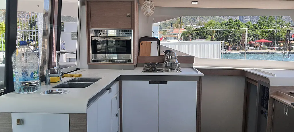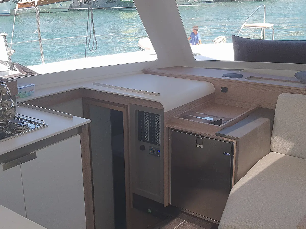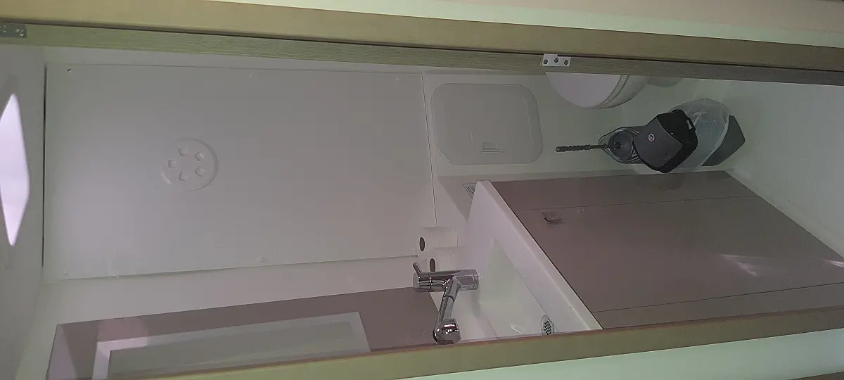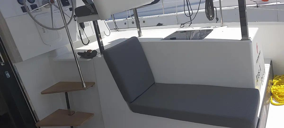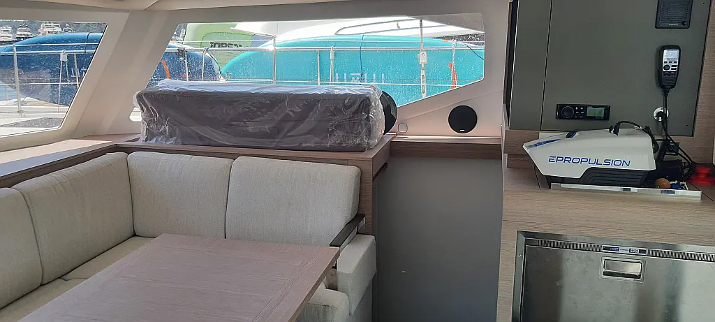 Solar-Panele, Außenbordmotor, Kühlschrank, Beiboot, Inverter, Elektrische Toilette, Heizung, Elektrische Winch (Segel), Bimini