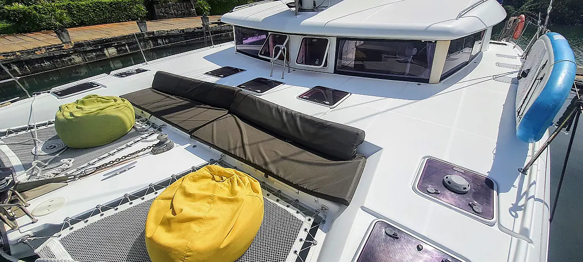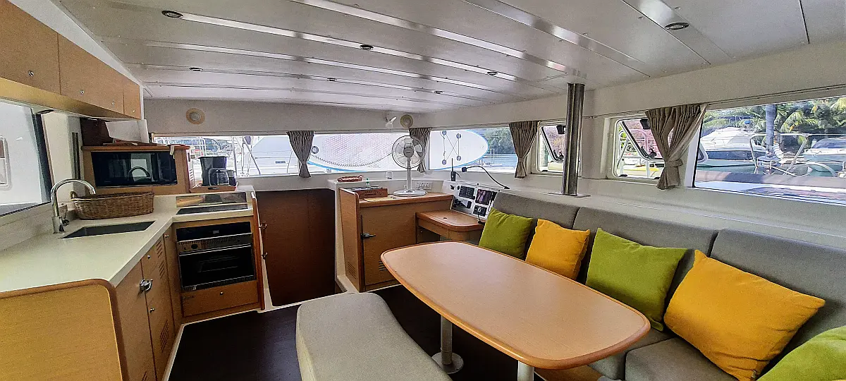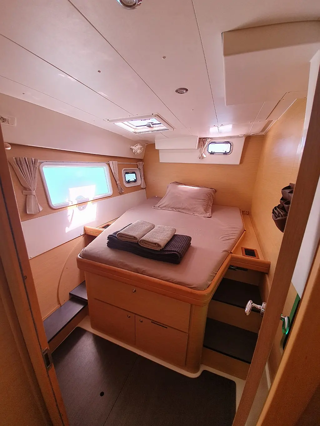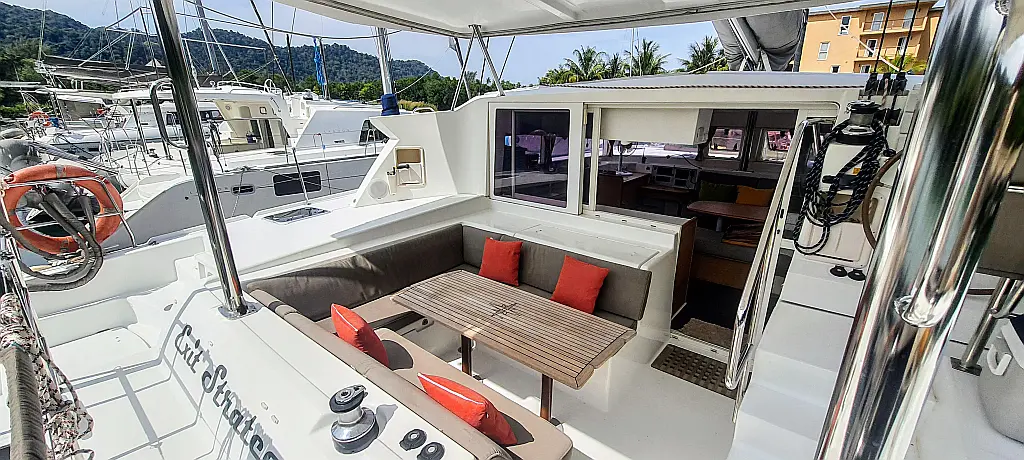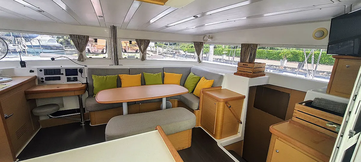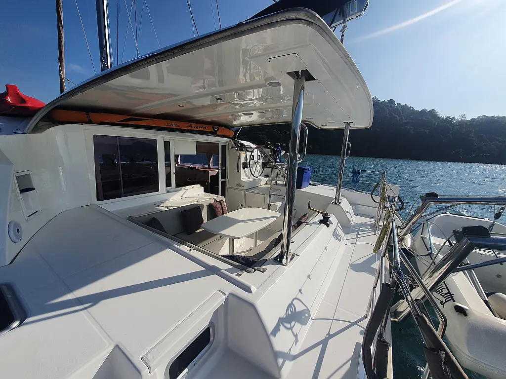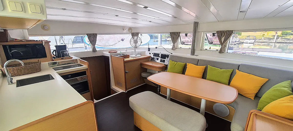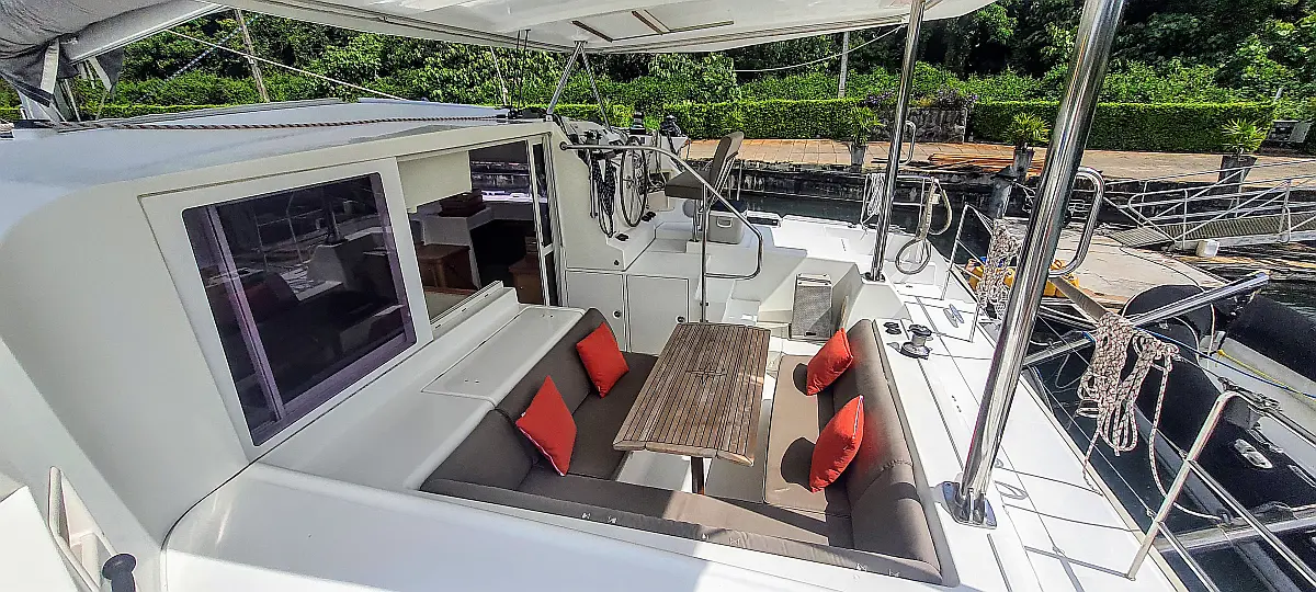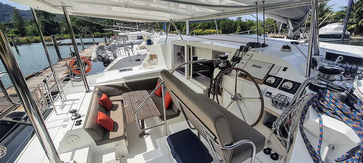 Lautsprecher im Cockpit, Wassermacher, Klimaanlage, Bimini, Kühlschrank, Generator, Solar-Panele, Außenbordmotor, Beiboot, Grill im Cockpit