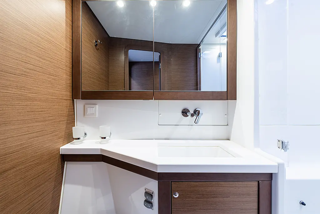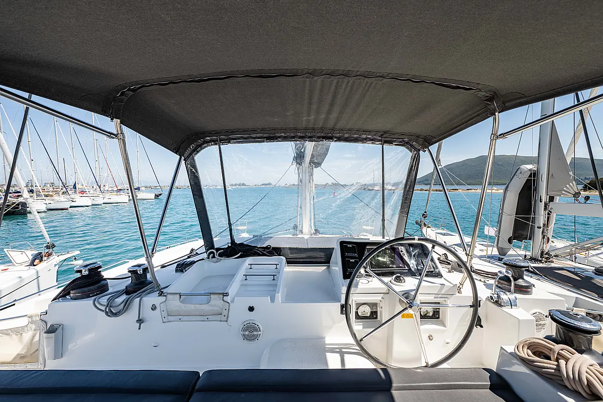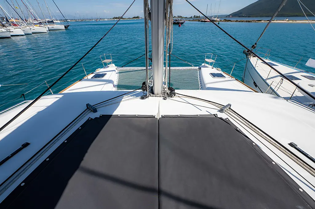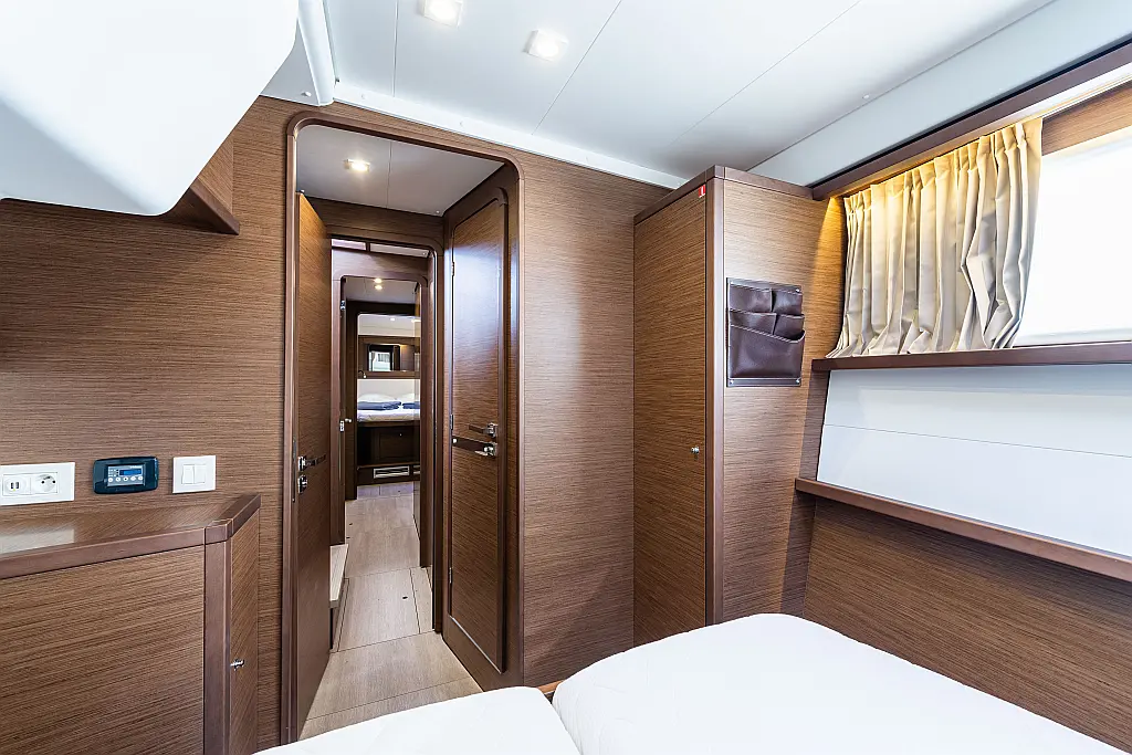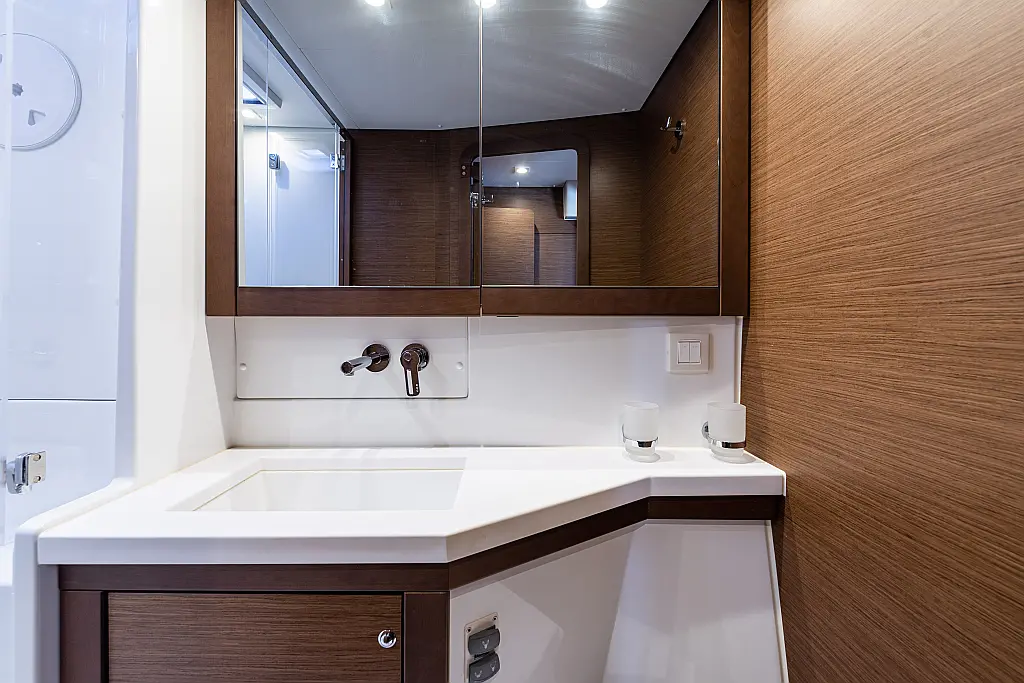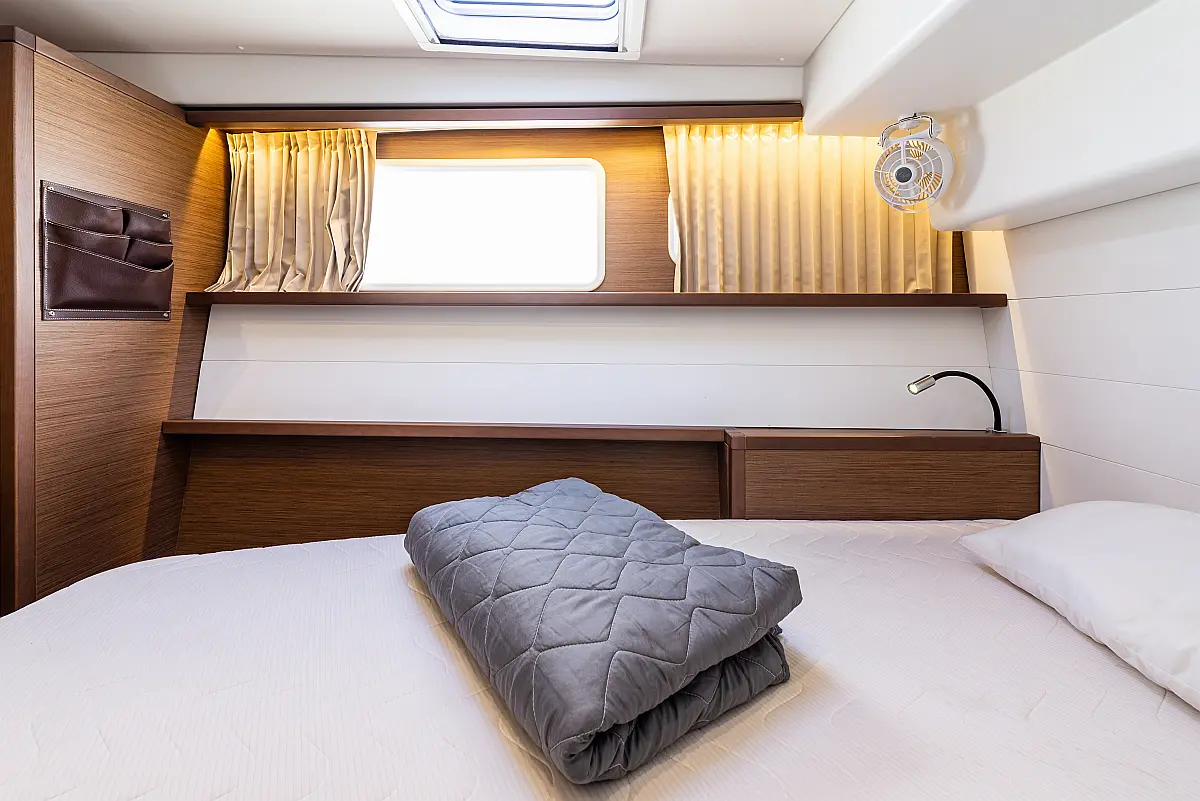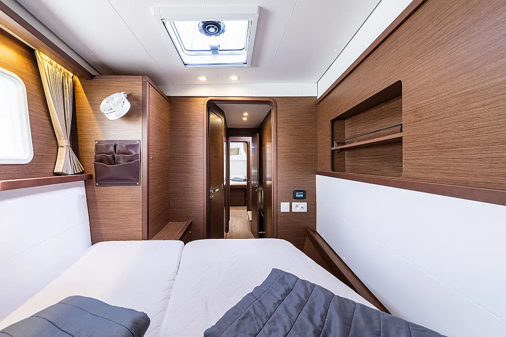 Fäkalientank, Beiboot, Lautsprecher im Cockpit, Elektrische Winch (Segel), Elektrische Toilette, Klimaanlage, Wassermacher, Generator, Cockpit-Kissen, Sprayhood, Badeplattform, Solar-Panele