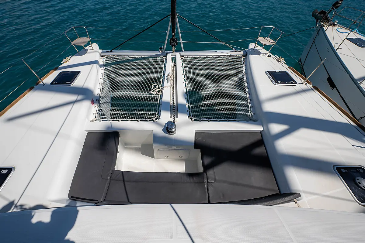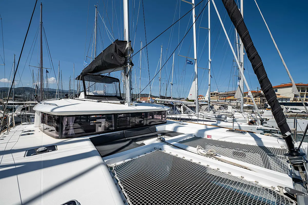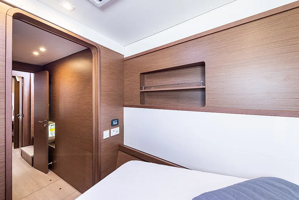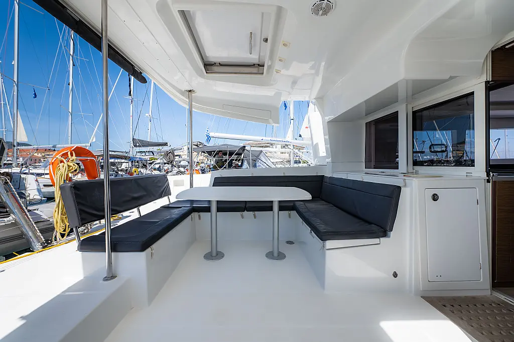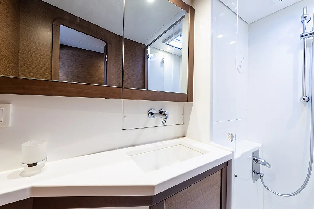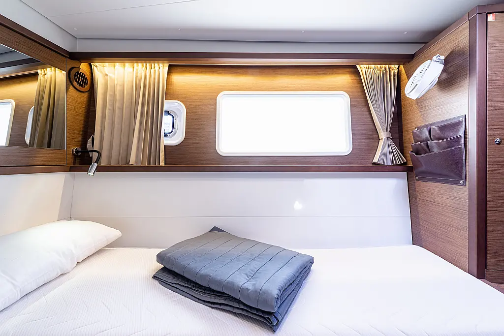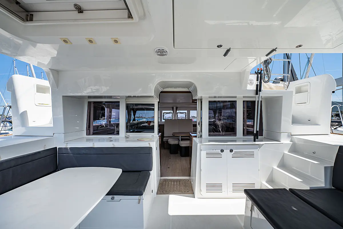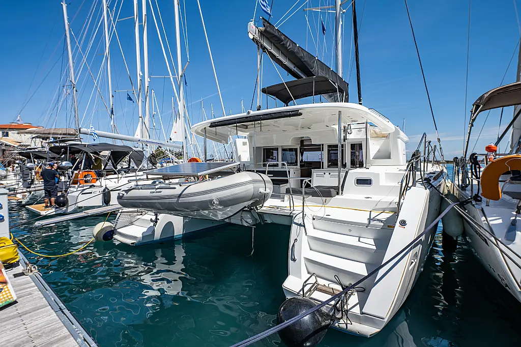Fäkalientank, Beiboot, Lautsprecher im Cockpit, Elektrische Winch (Segel), Elektrische Toilette, Klimaanlage, Wassermacher, Generator, Cockpit-Kissen, Sprayhood, Badeplattform, Solar-Panele