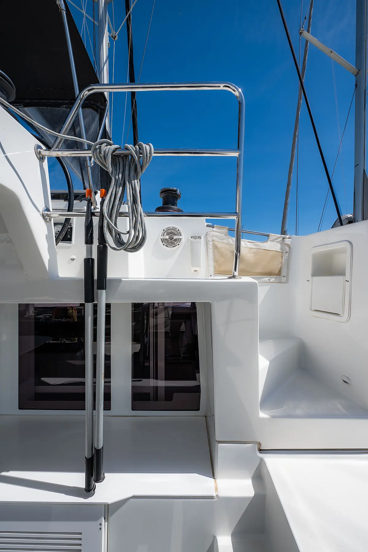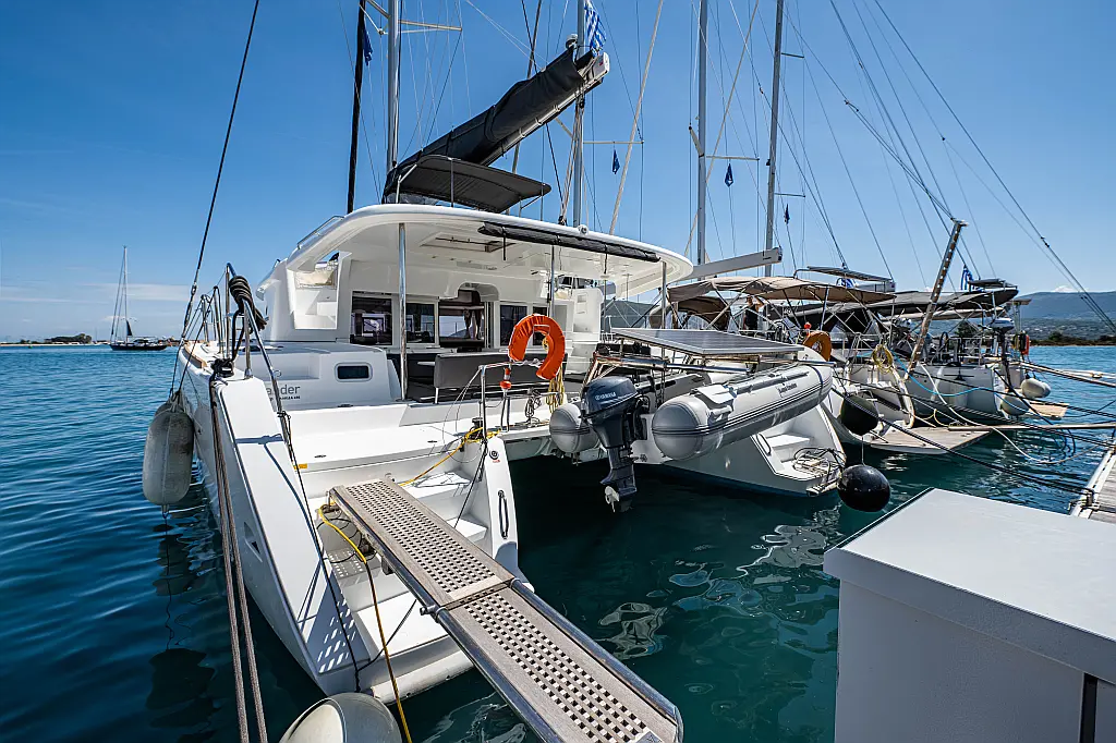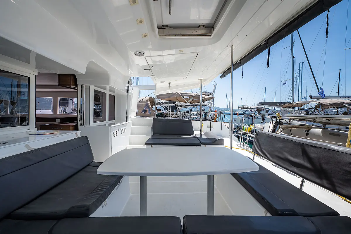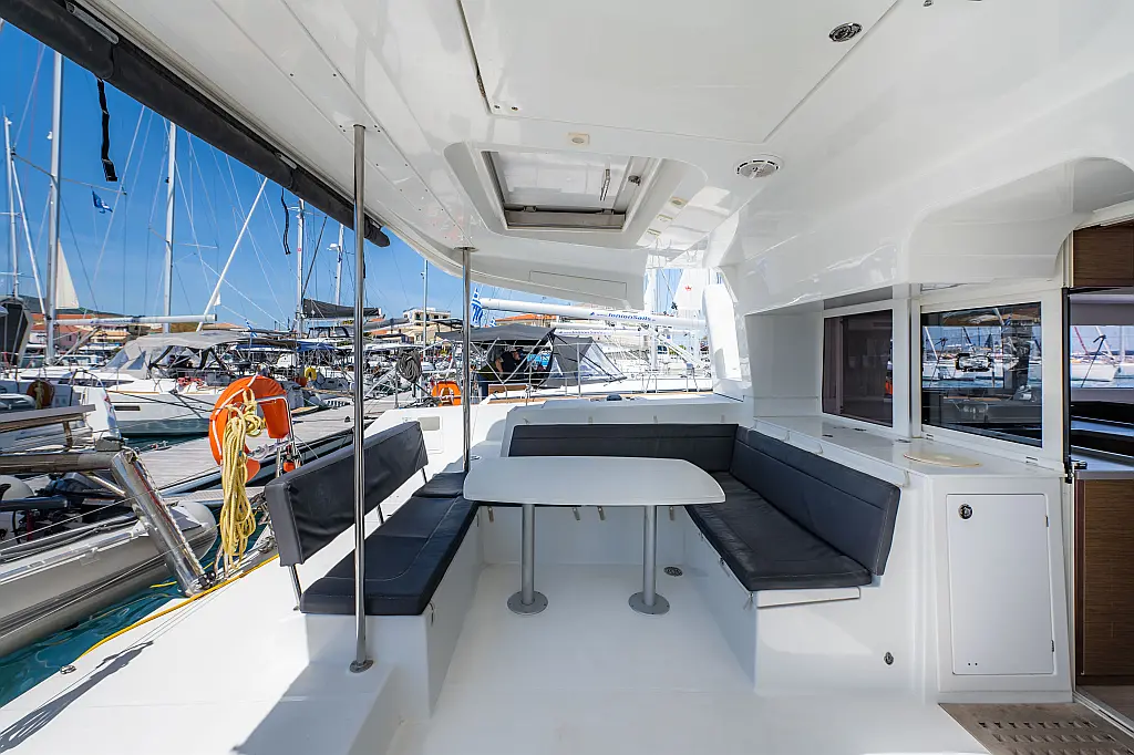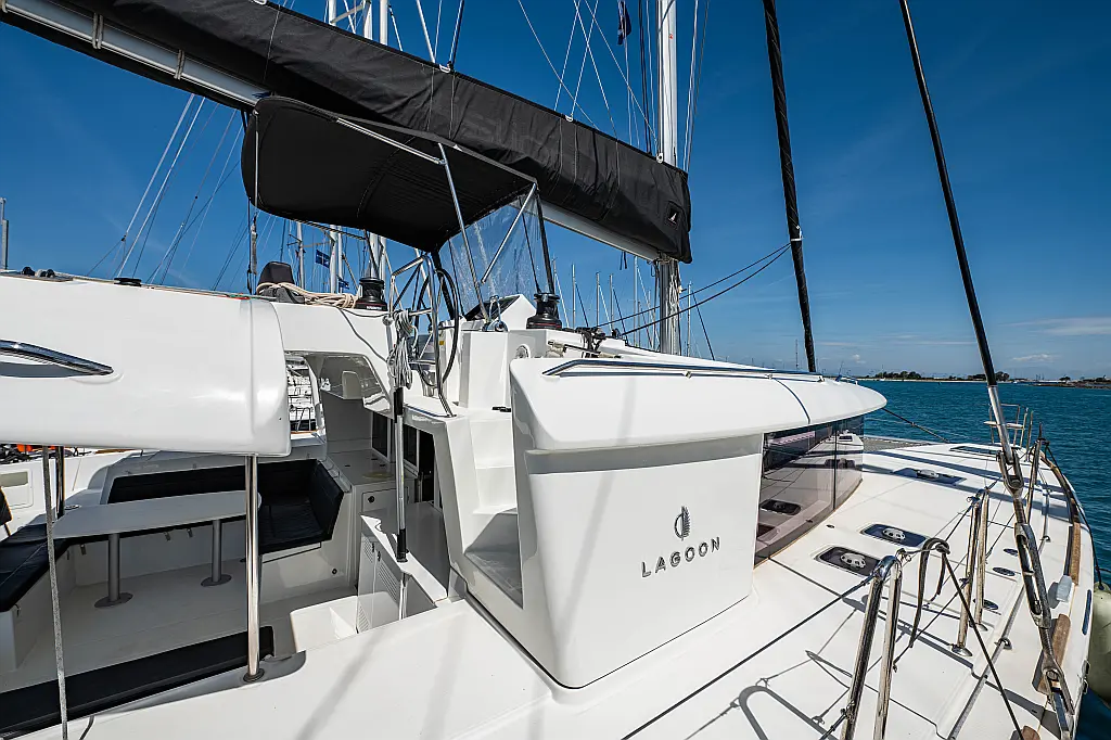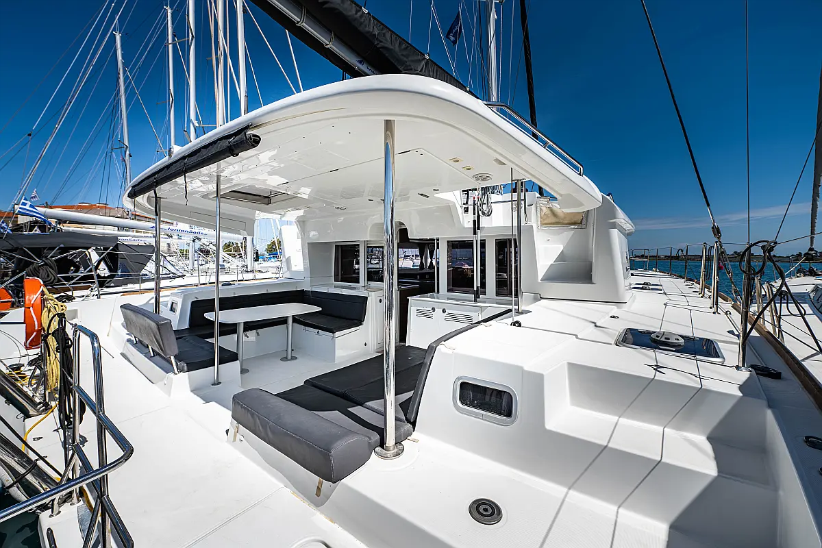 Fäkalientank, Beiboot, Lautsprecher im Cockpit, Elektrische Winch (Segel), Elektrische Toilette, Klimaanlage, Wassermacher, Generator, Cockpit-Kissen, Sprayhood, Badeplattform, Solar-Panele