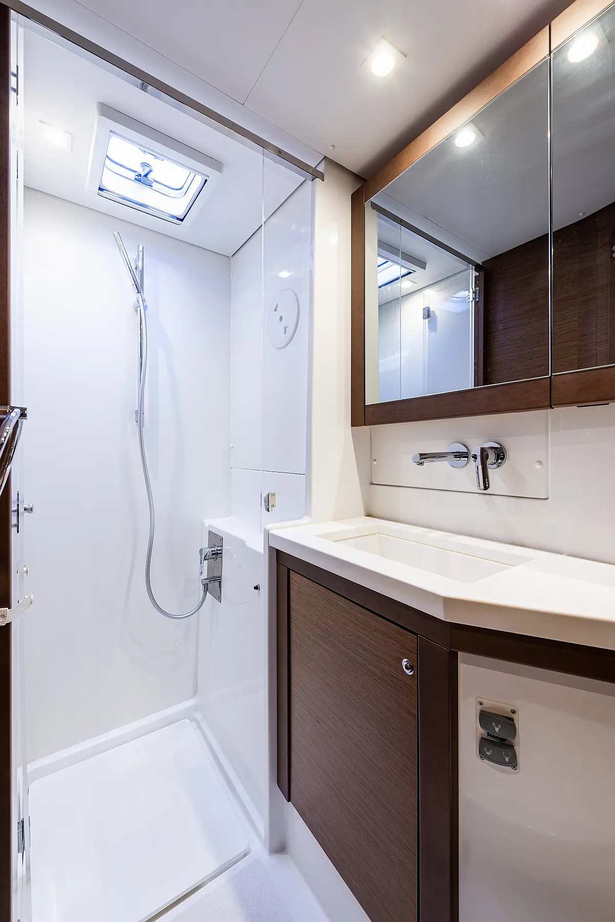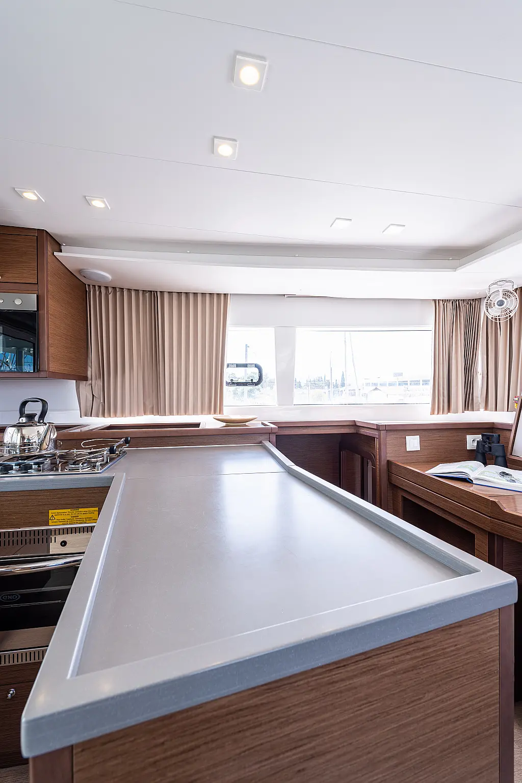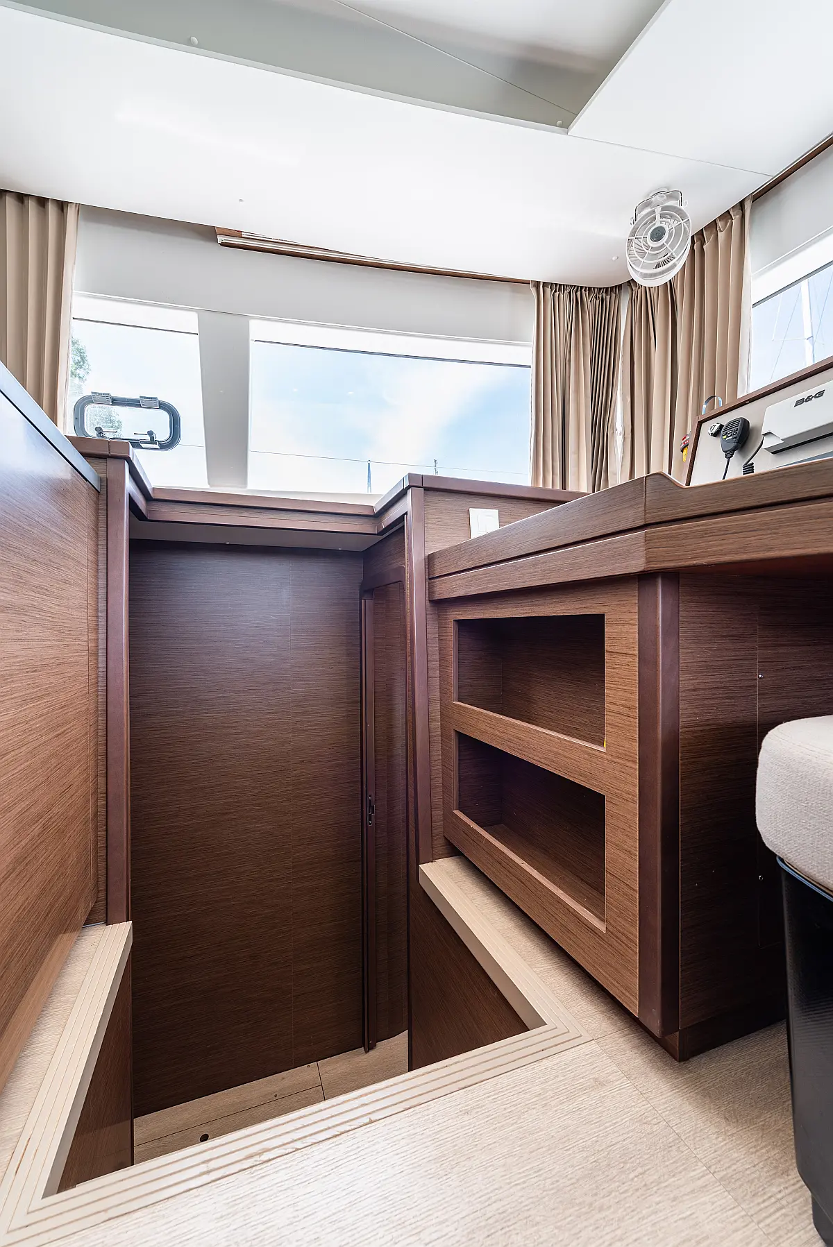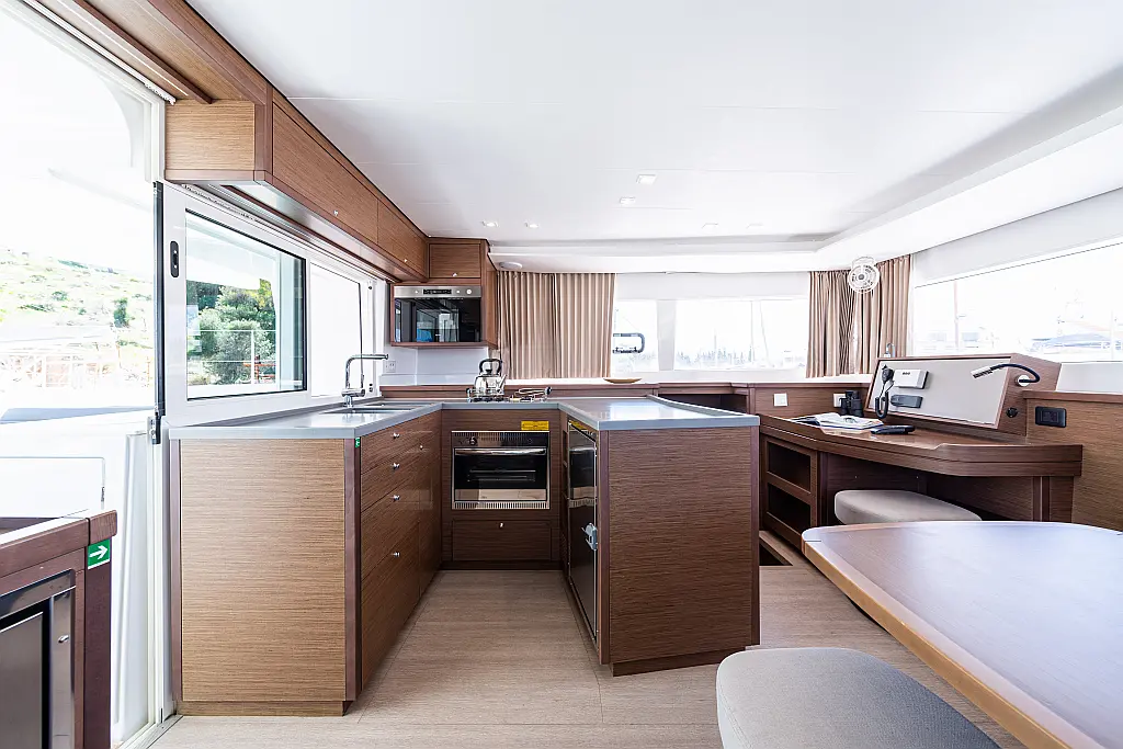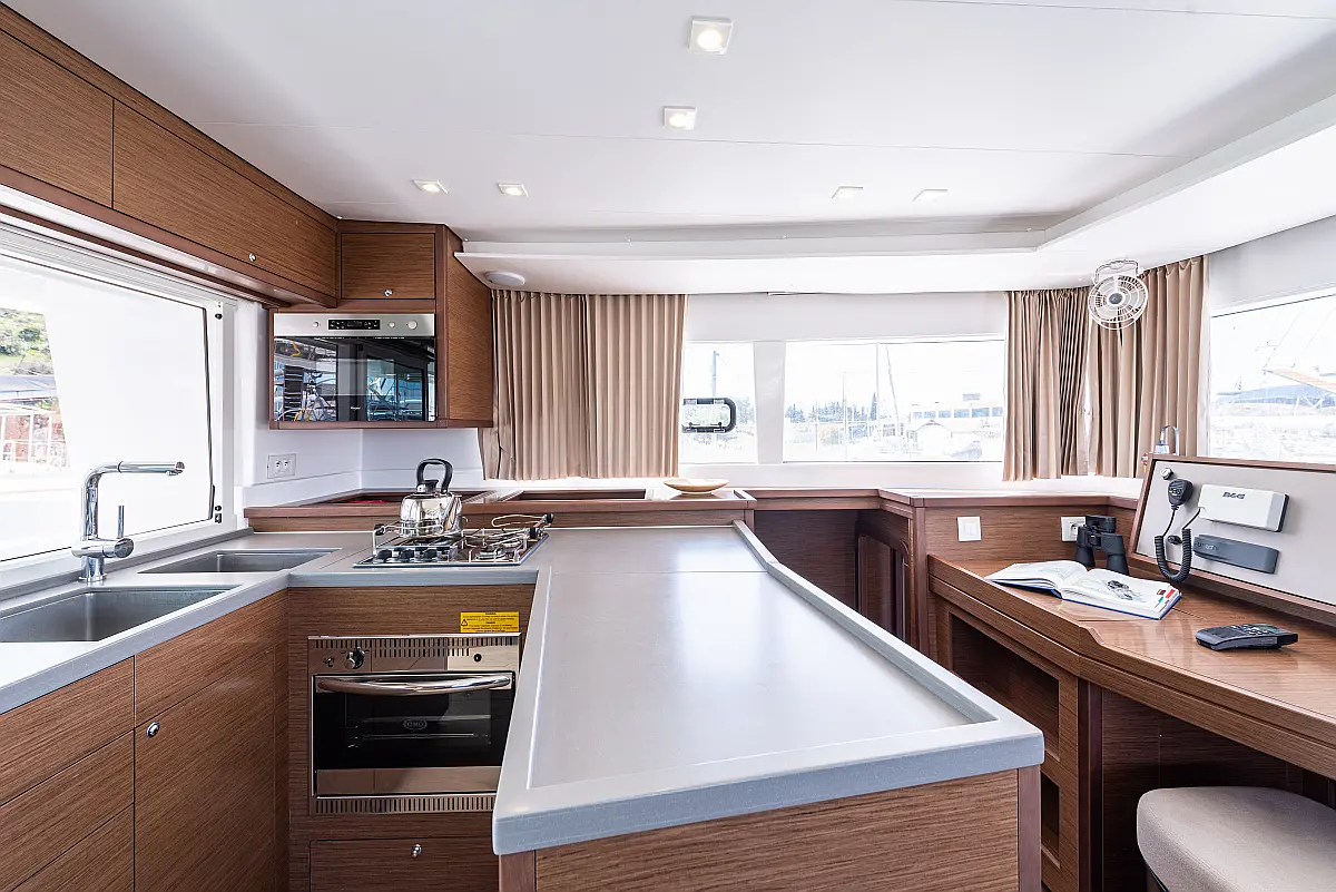 Fäkalientank, Beiboot, Lautsprecher im Cockpit, Elektrische Winch (Segel), Elektrische Toilette, Klimaanlage, Wassermacher, Generator, Cockpit-Kissen, Sprayhood, Badeplattform, Solar-Panele