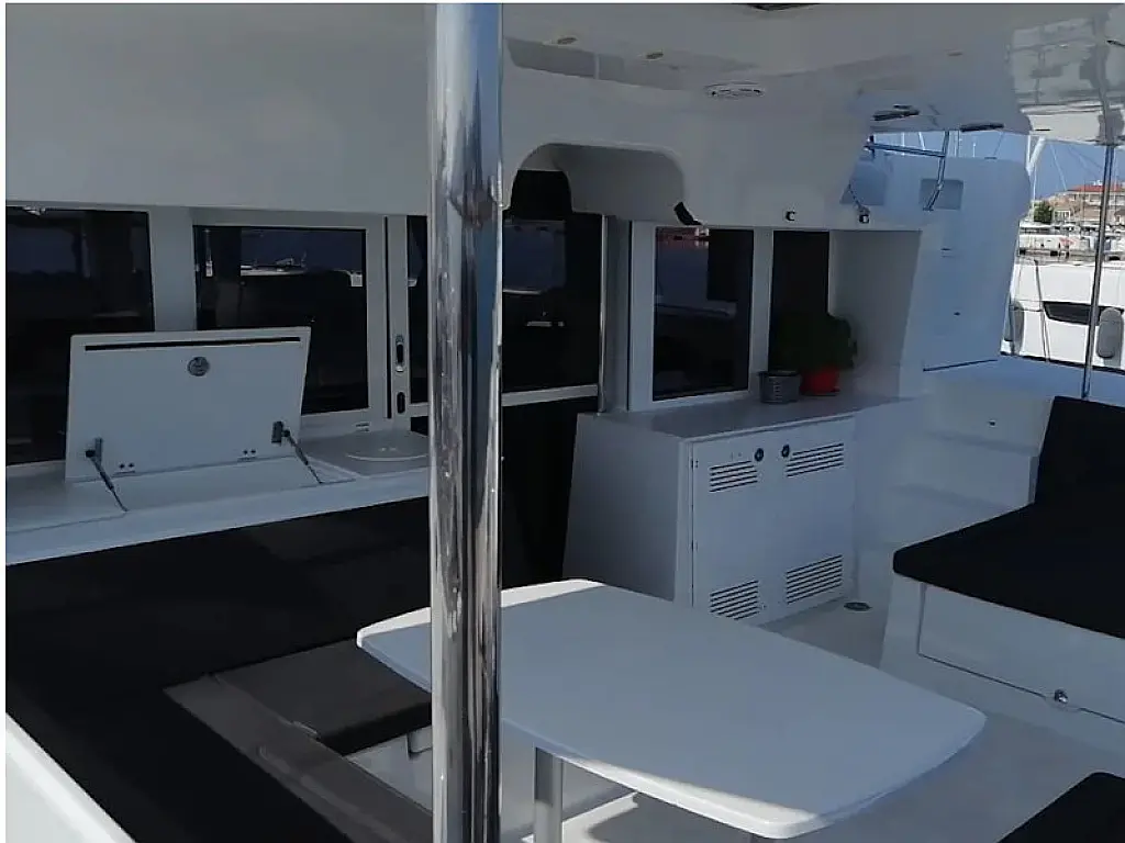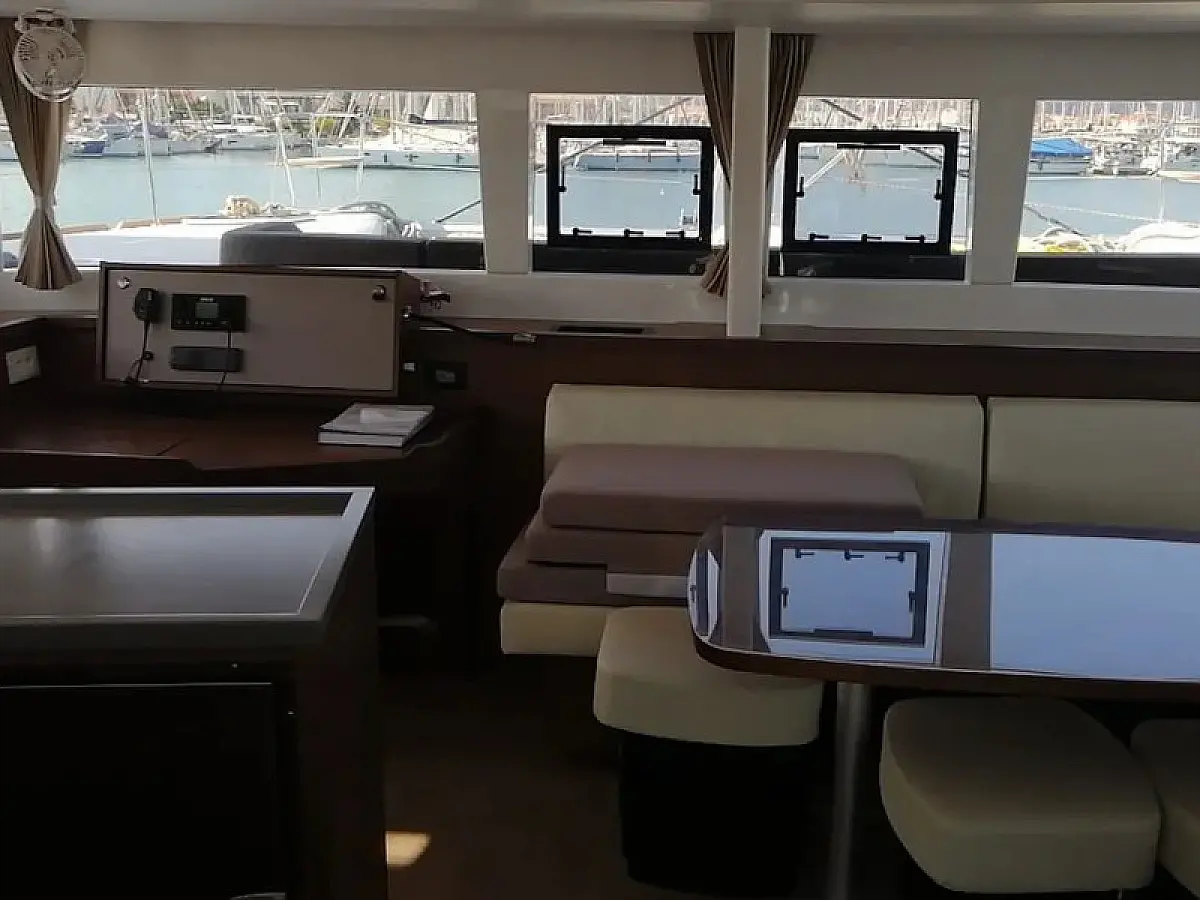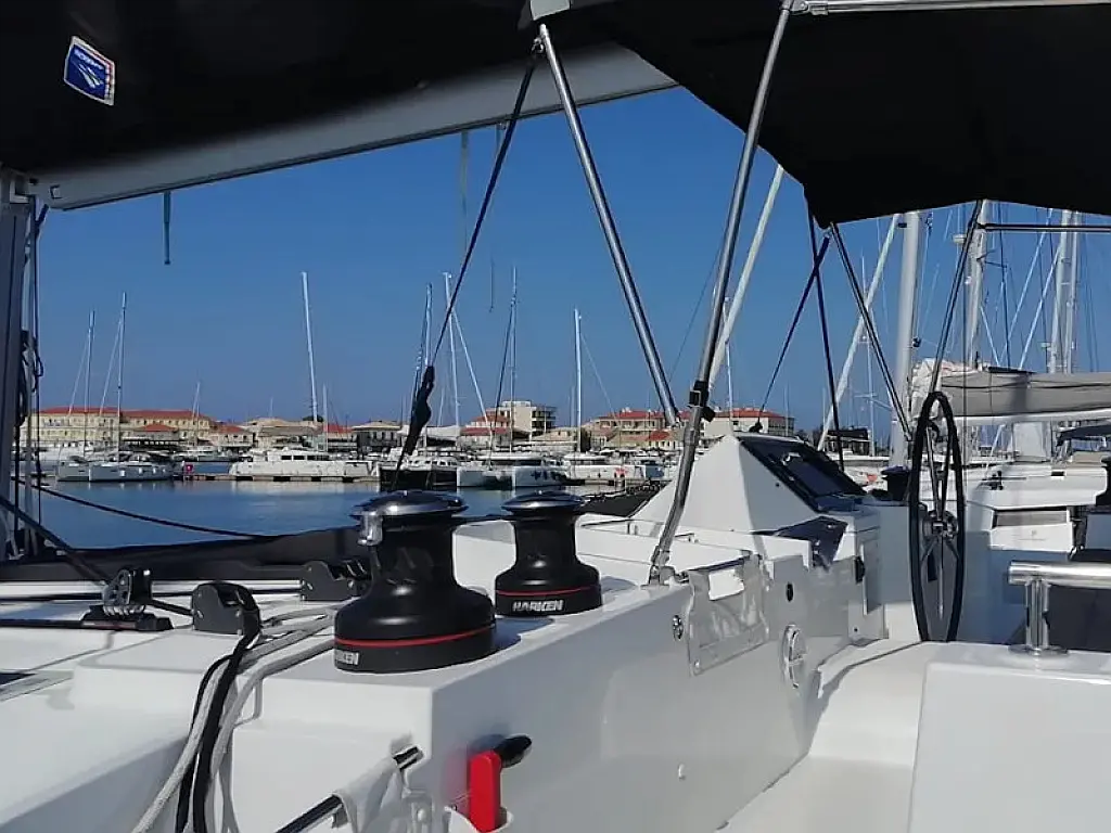 Klimaanlage, Generator, Bimini, Lautsprecher im Cockpit, Kaffeemaschine, Beiboot, Elektrische Toilette, Eismaschine, Außenbordmotor, Kühlschrank, Solar-Panele, Sprayhood, Wassermacher, Wi-Fi und Internet