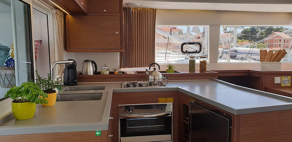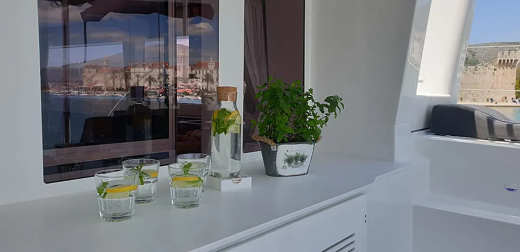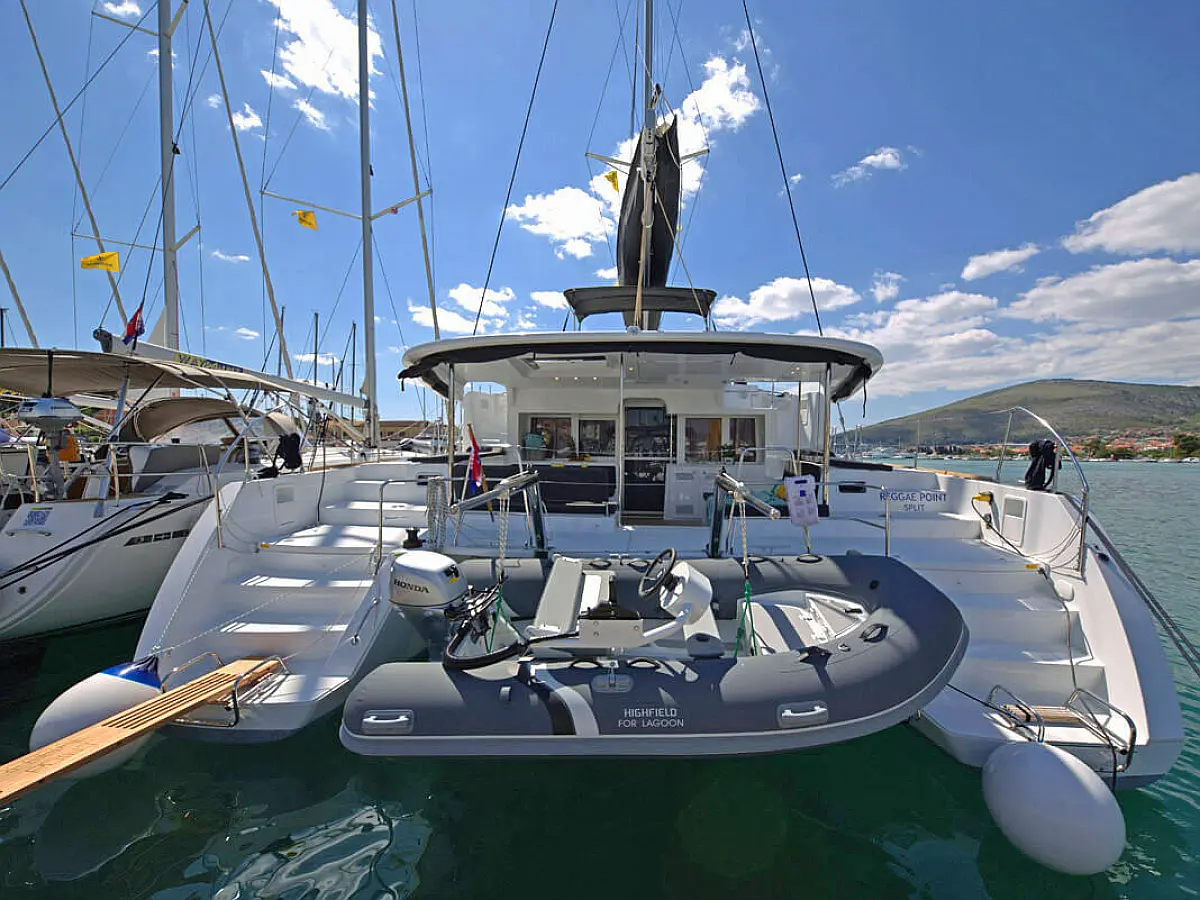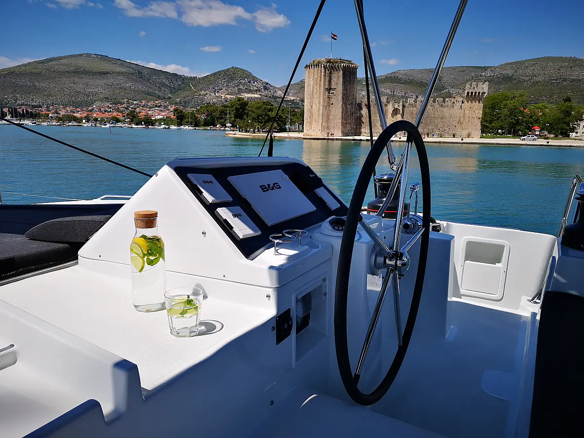 Bimini, Sprayhood, Außenbordmotor, Kaffeemaschine, Kühlschrank, Klimaanlage, Generator, Eismaschine, Teakdeck, Cockpit-Kissen, Elektrische Winch (Segel), Heizung, Elektrische Toilette