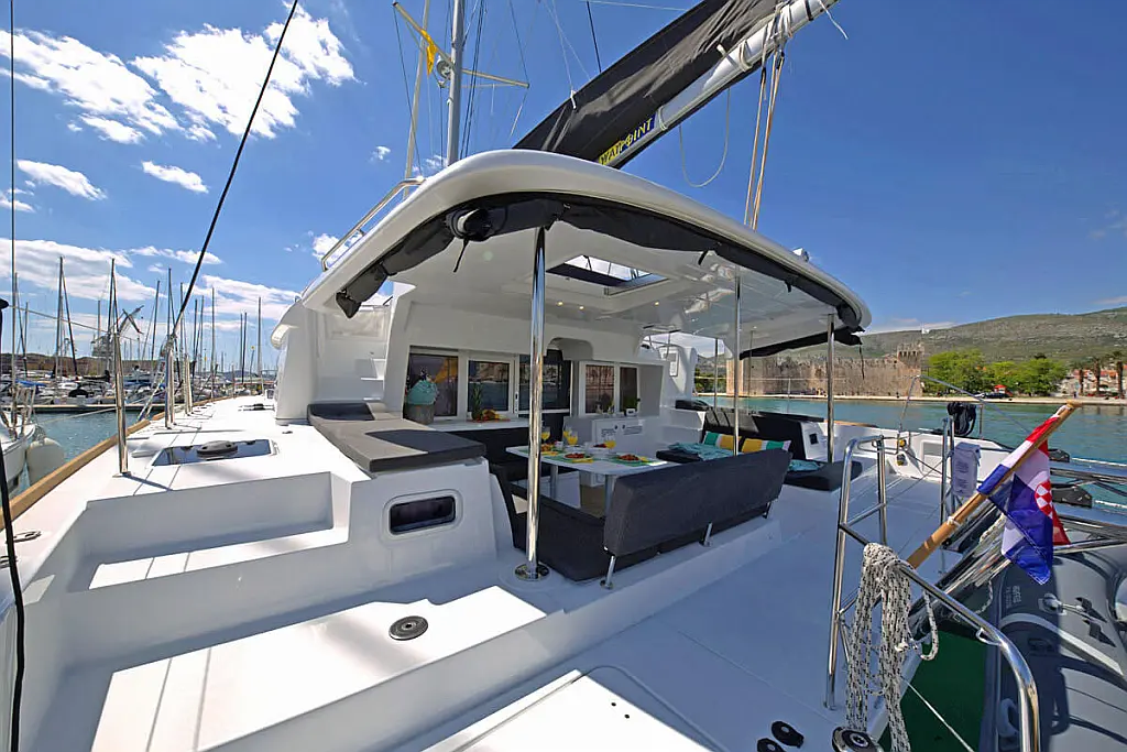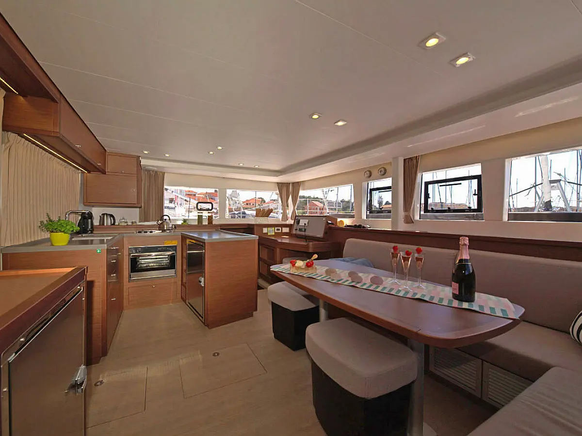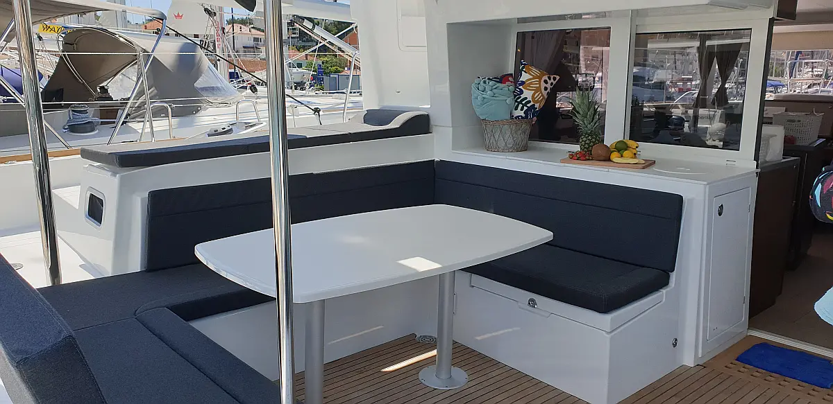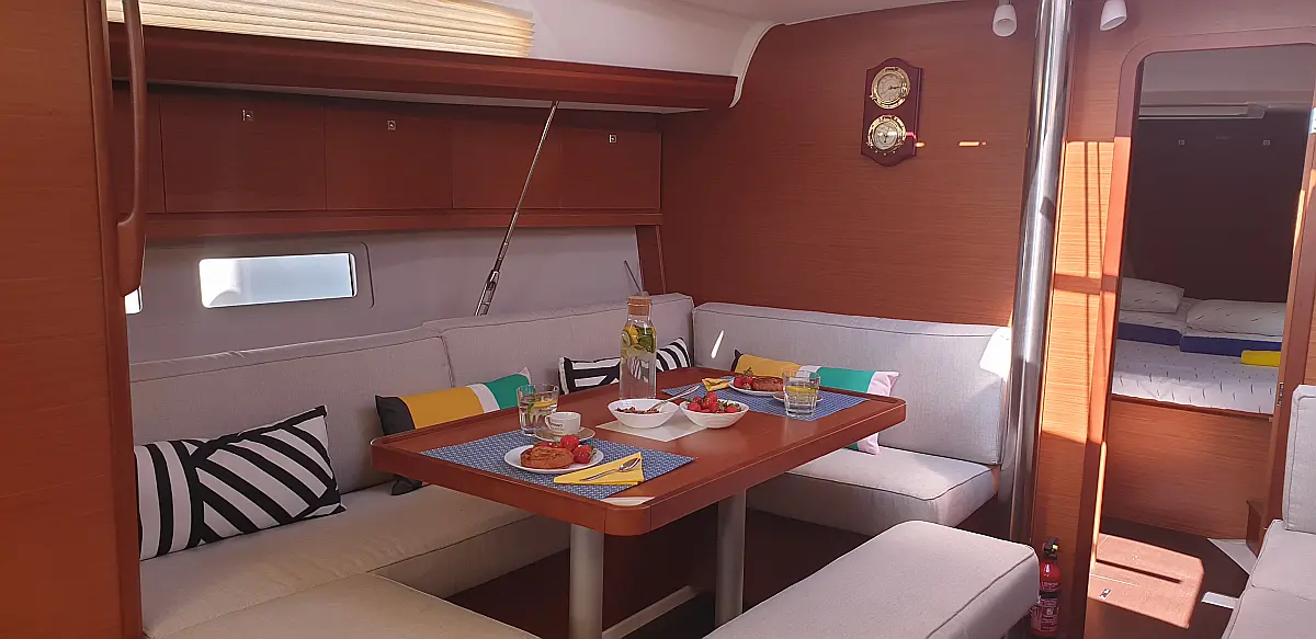 Bimini, Sprayhood, Außenbordmotor, Kaffeemaschine, Kühlschrank, Klimaanlage, Generator, Eismaschine, Teakdeck, Cockpit-Kissen, Elektrische Winch (Segel), Heizung, Elektrische Toilette