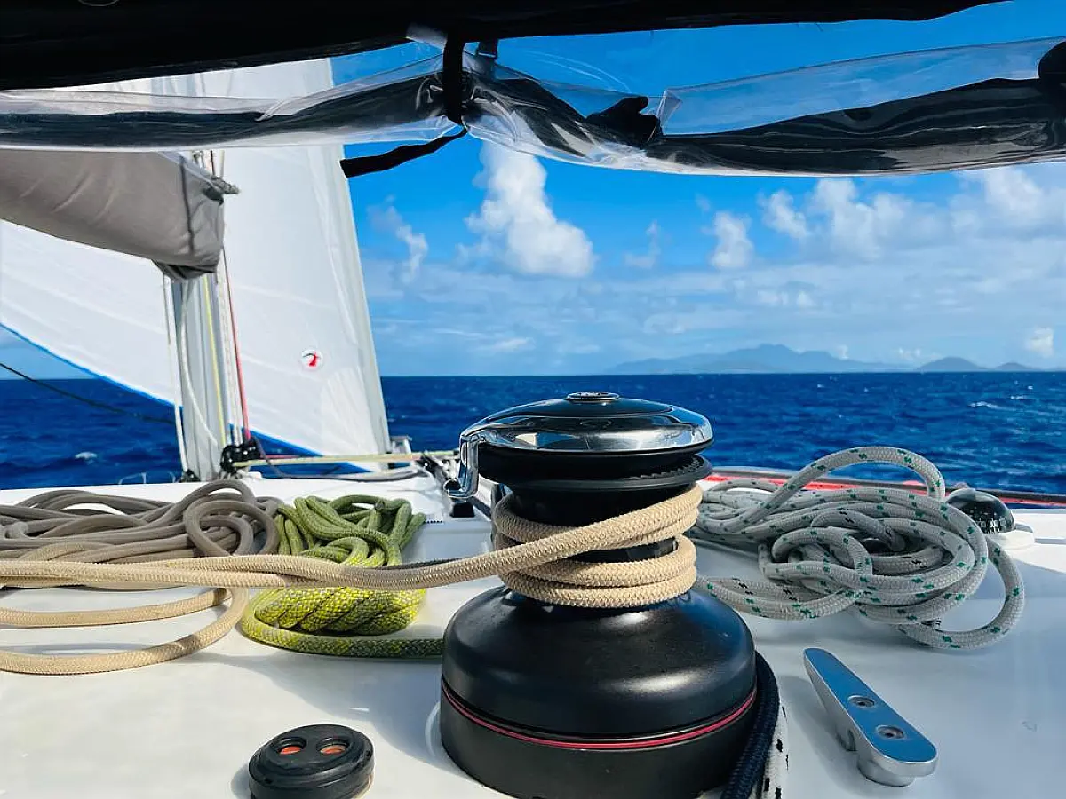 Elektrische Winch (Segel), Beiboot, Inverter, Solar-Panele, Wassermacher, Lautsprecher im Cockpit, Cockpit-Kissen, Bimini