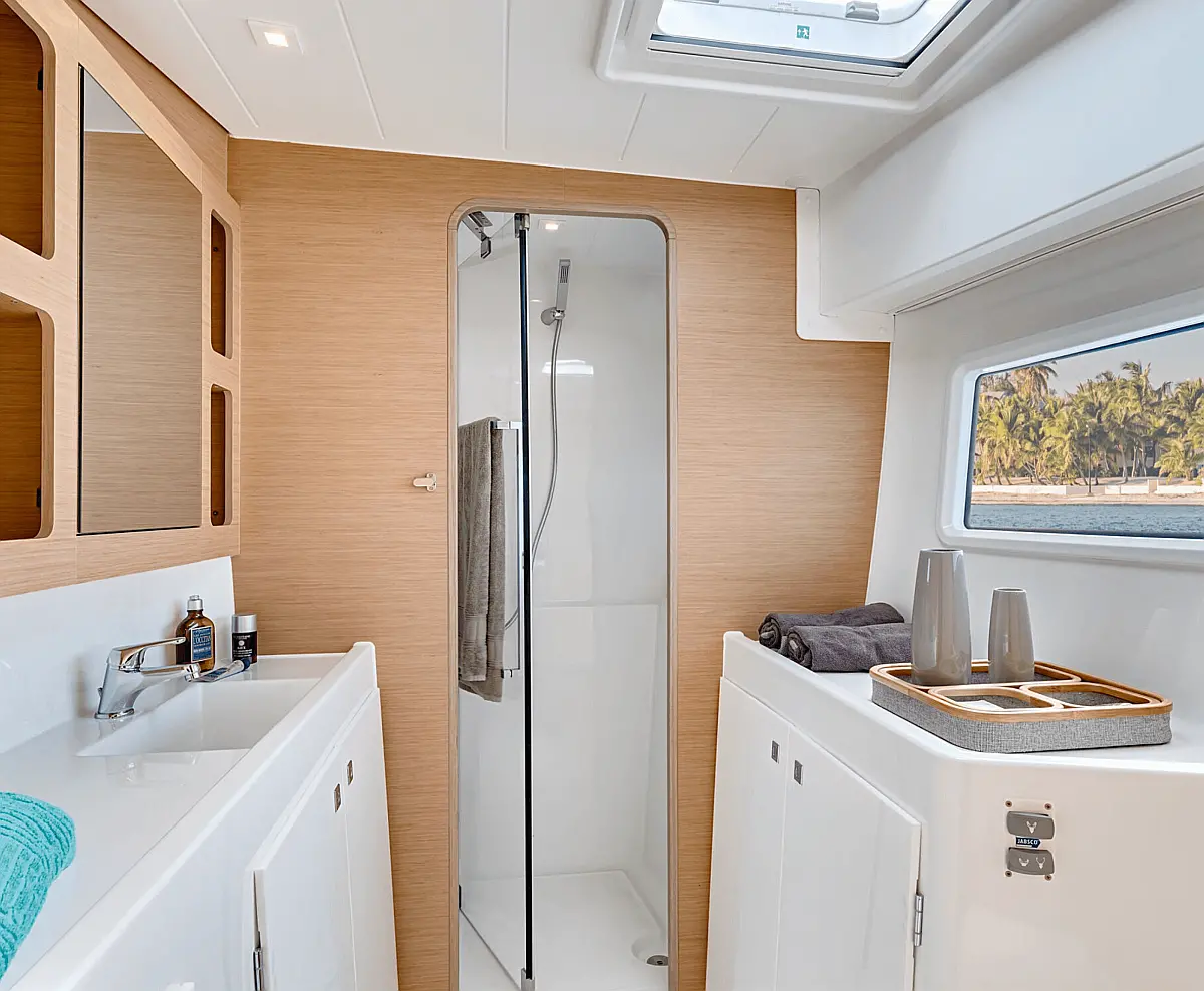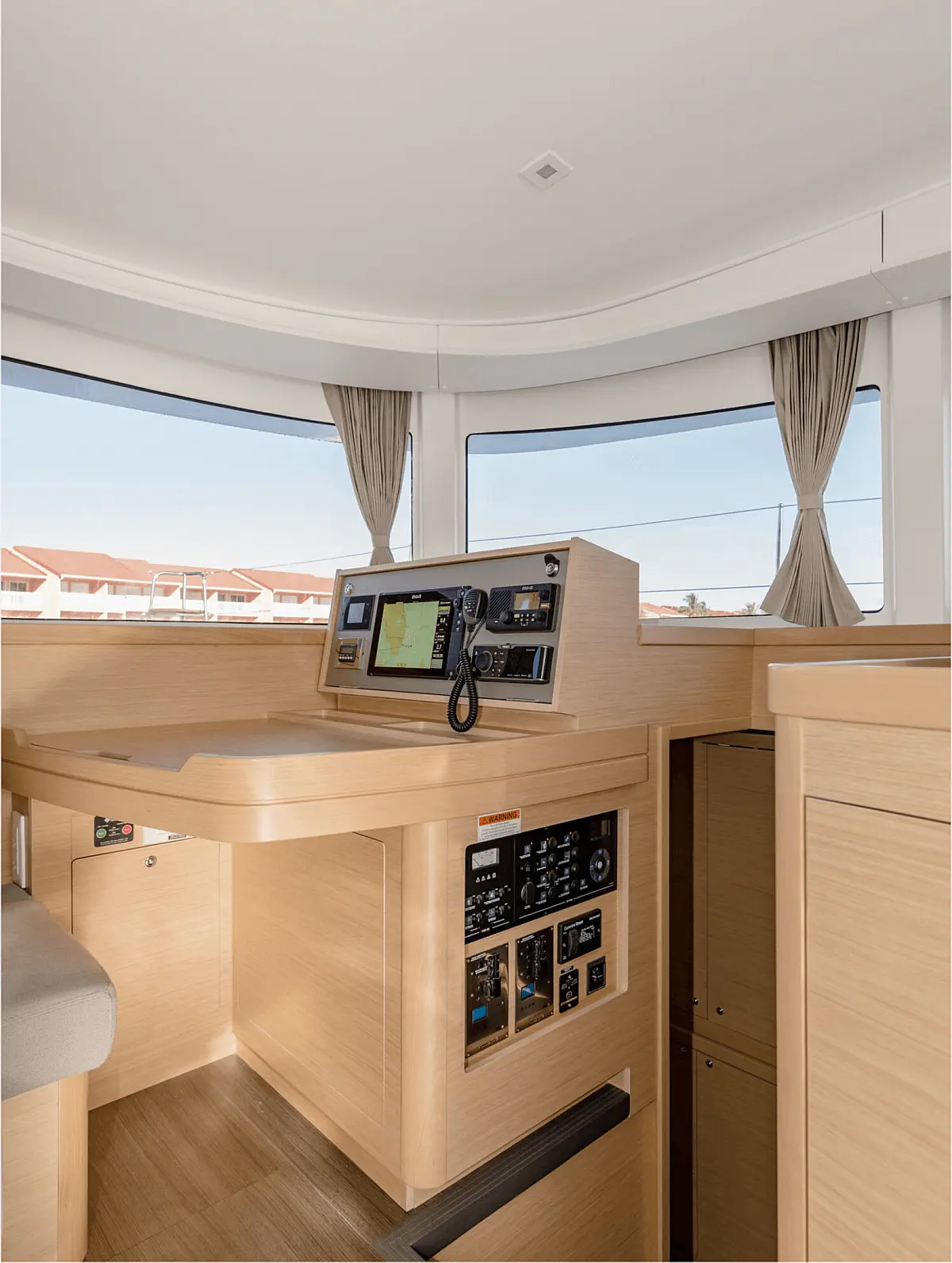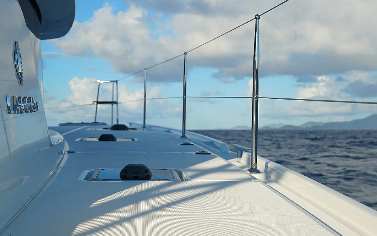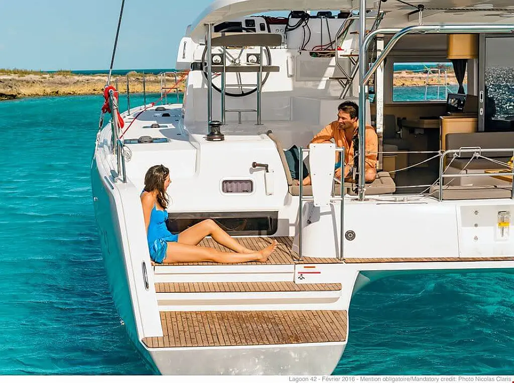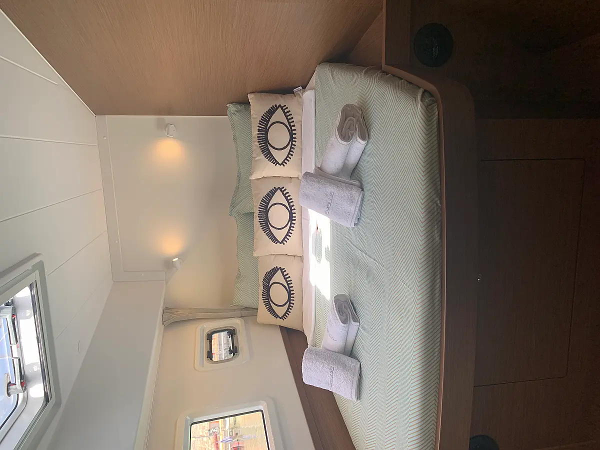 Bimini, Sprayhood, Cockpit-Kissen, Lautsprecher im Cockpit, Klimaanlage, Elektrische Winch (Segel), Außenbordmotor, Generator, Elektrische Toilette, Beiboot, Solar-Panele, Inverter, Kühlschrank, Wassermacher, Teakdeck, Kaffeemaschine