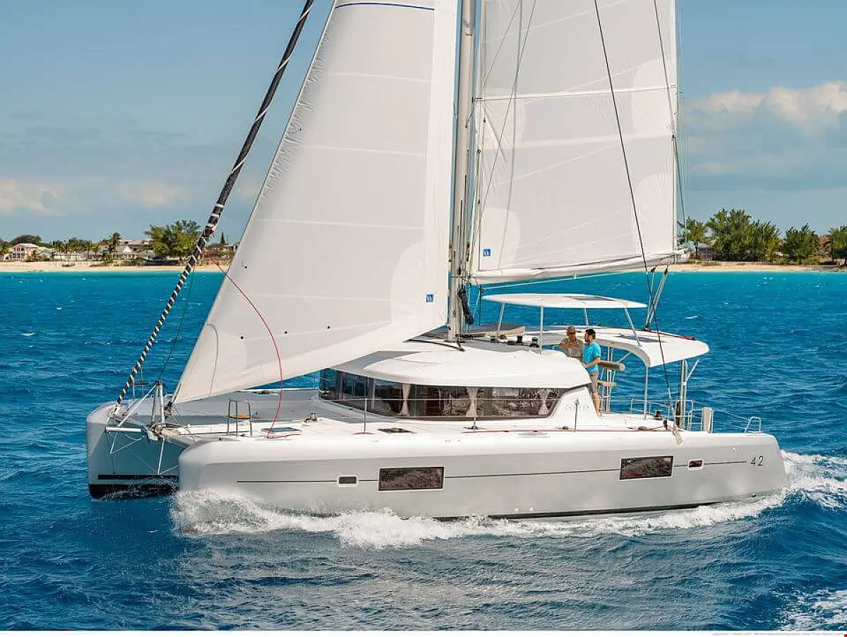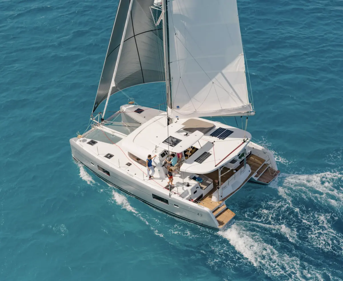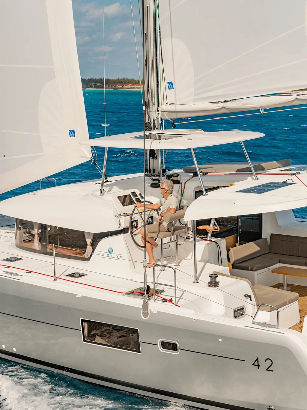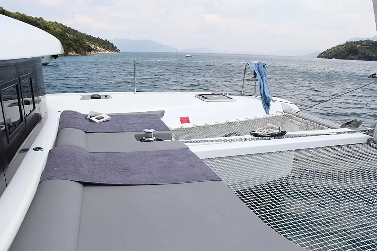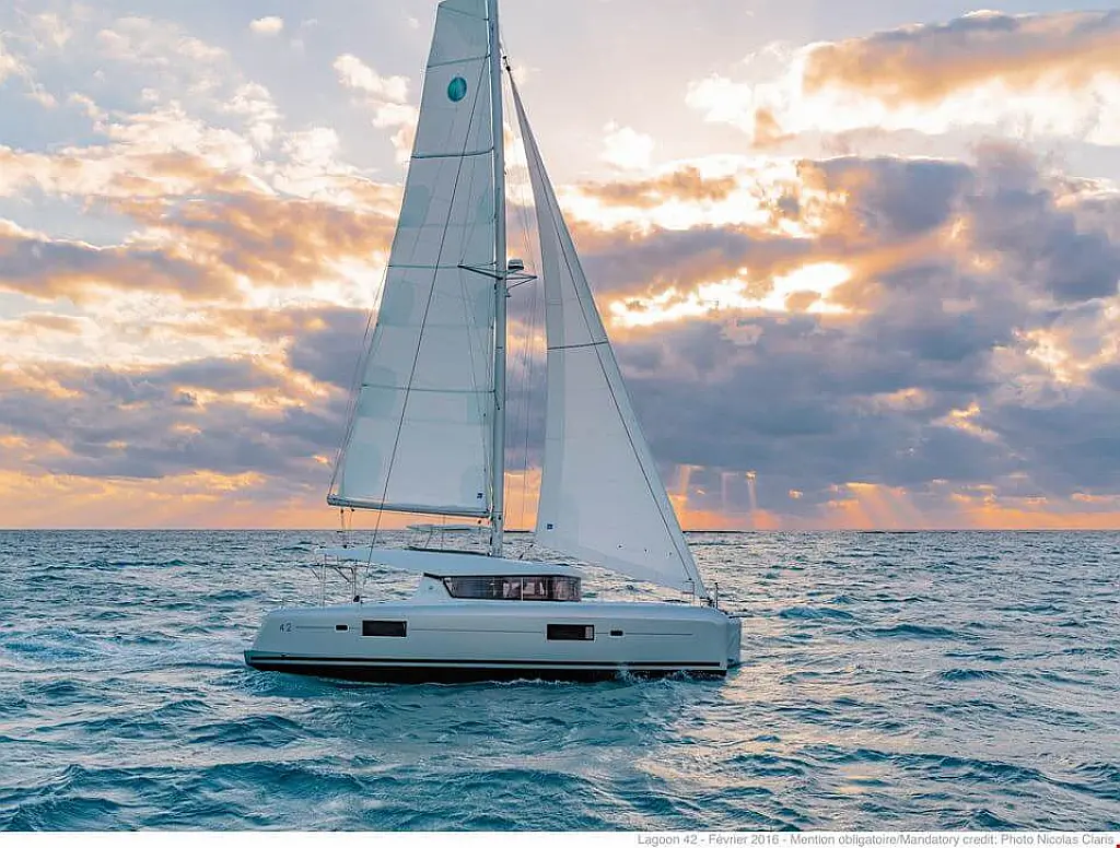 Bimini, Sprayhood, Cockpit-Kissen, Lautsprecher im Cockpit, Klimaanlage, Elektrische Winch (Segel), Außenbordmotor, Generator, Elektrische Toilette, Beiboot, Solar-Panele, Inverter, Kühlschrank, Wassermacher, Teakdeck, Kaffeemaschine