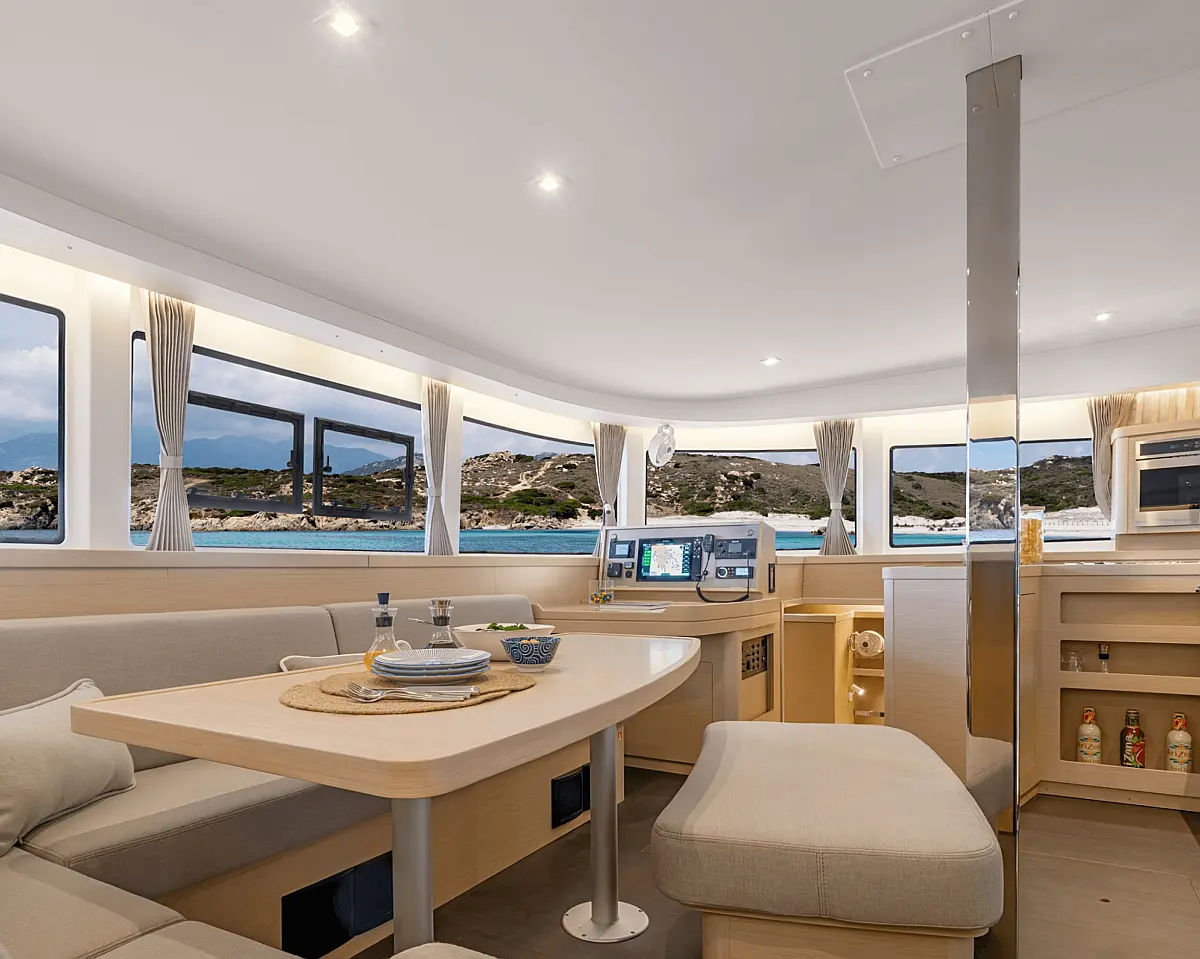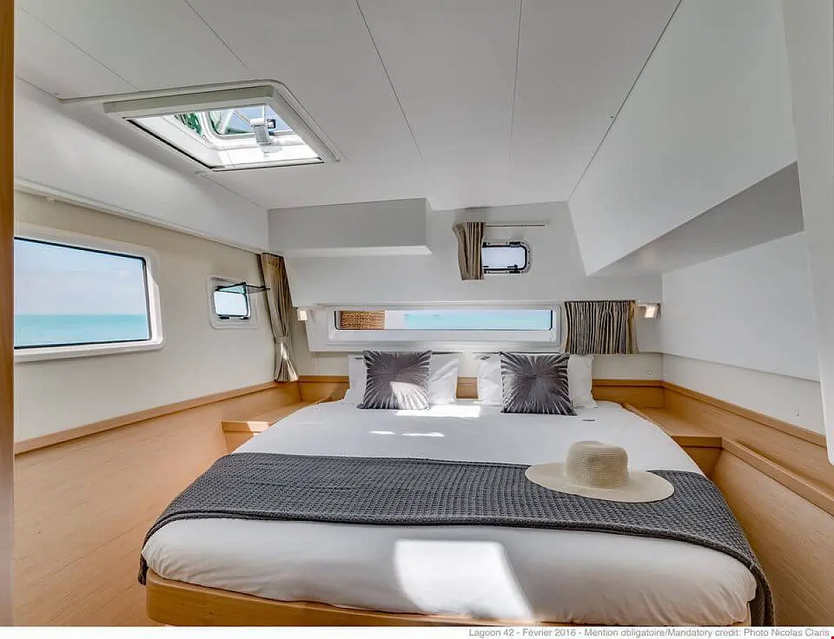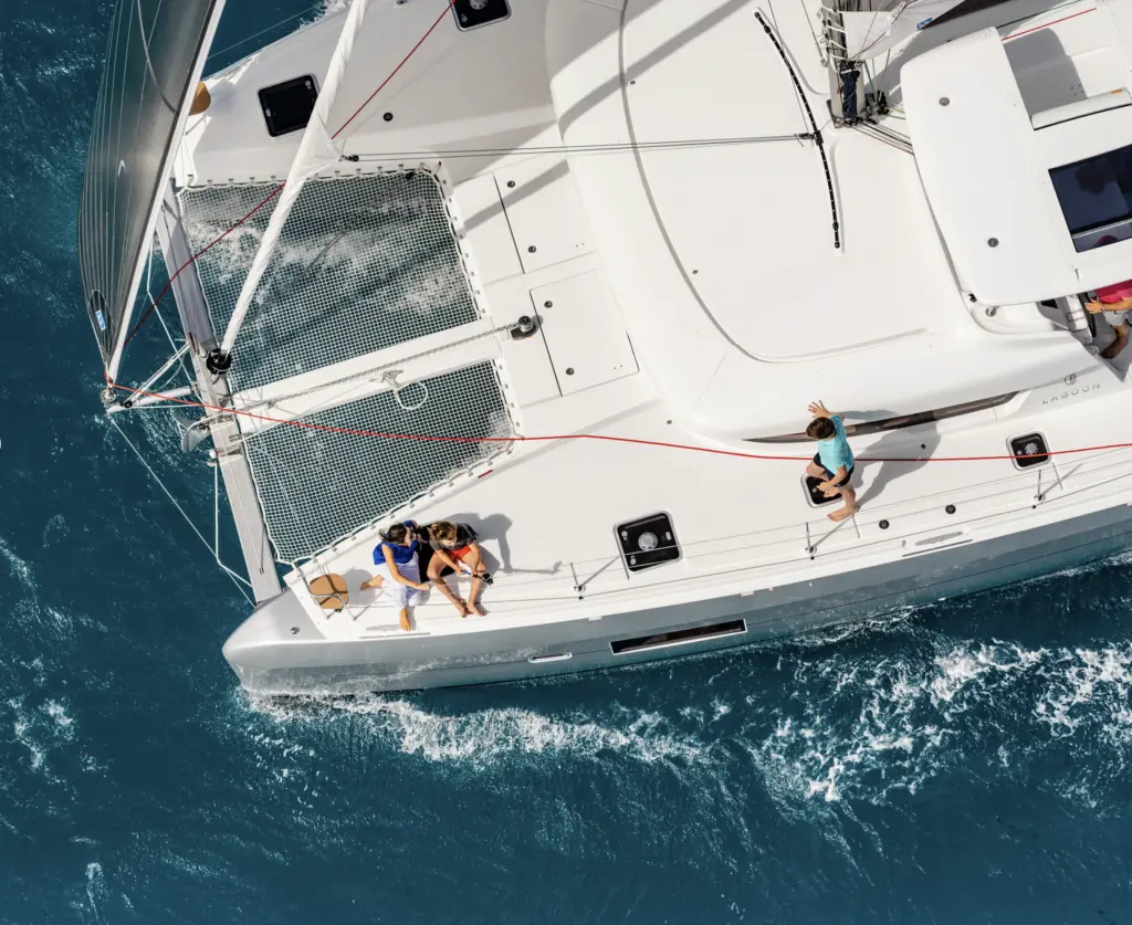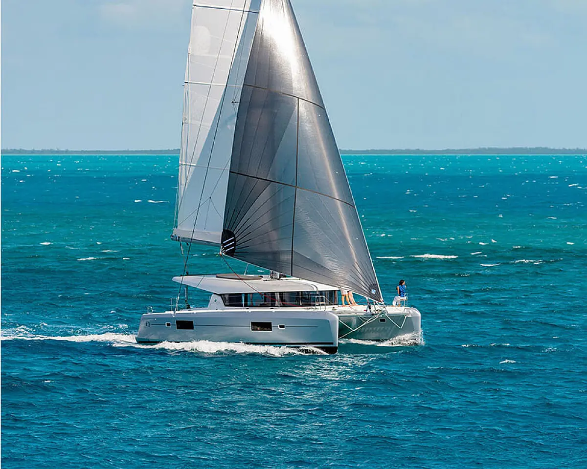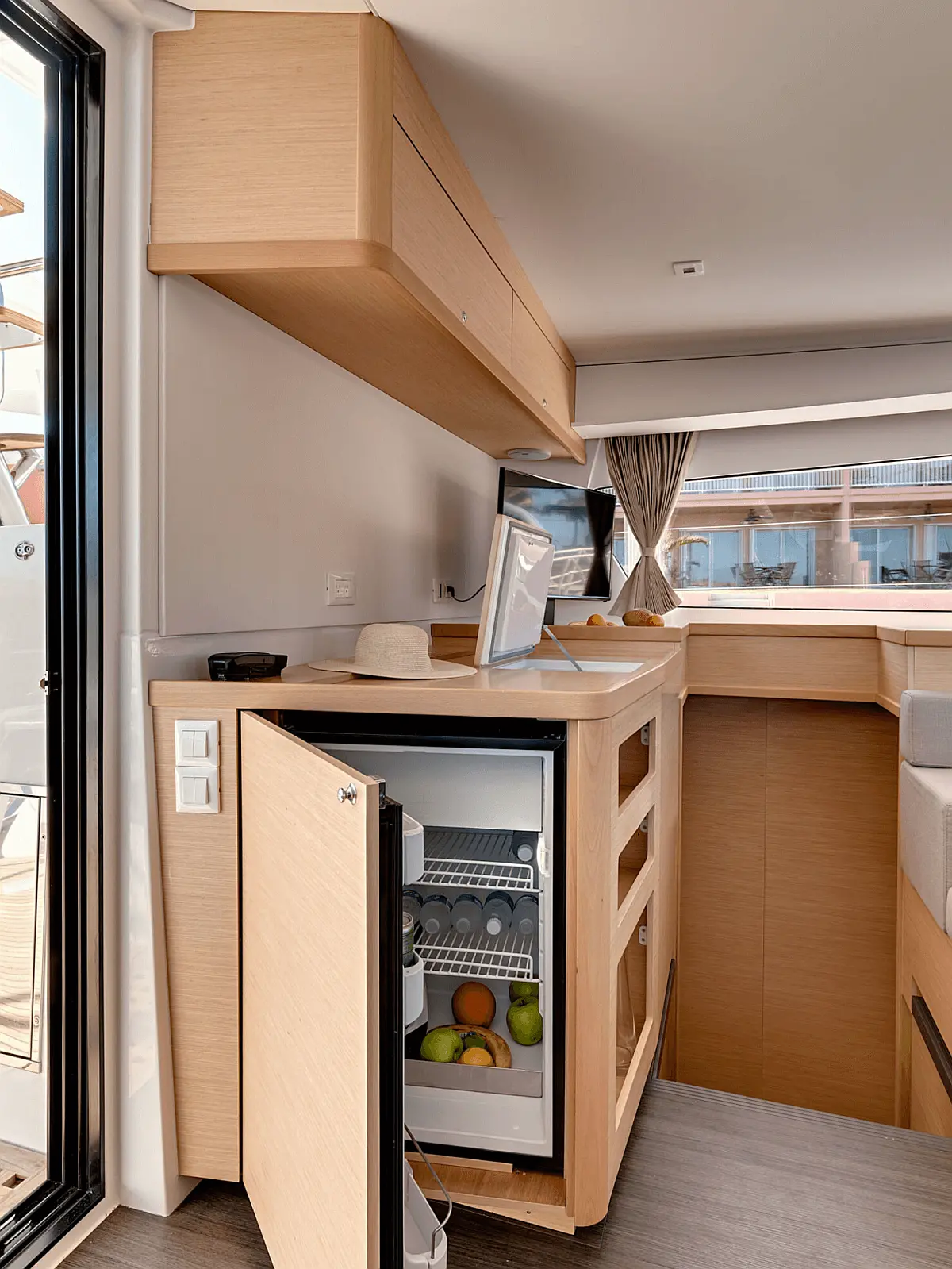 Bimini, Sprayhood, Cockpit-Kissen, Lautsprecher im Cockpit, Klimaanlage, Elektrische Winch (Segel), Außenbordmotor, Generator, Elektrische Toilette, Beiboot, Solar-Panele, Inverter, Kühlschrank, Wassermacher, Teakdeck, Kaffeemaschine