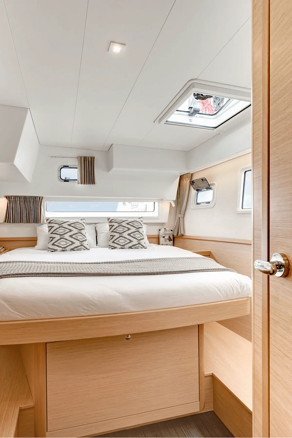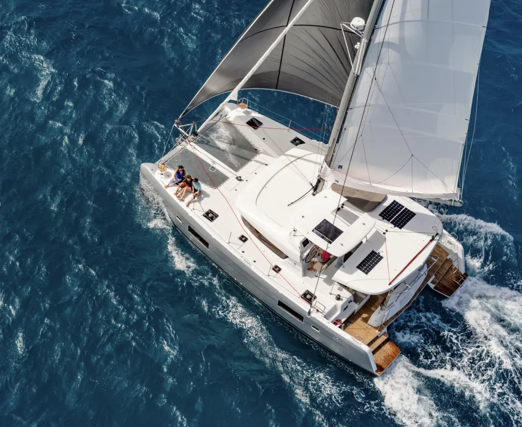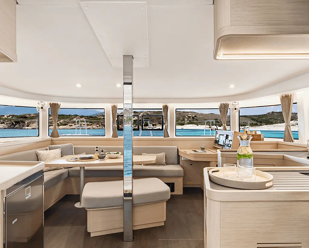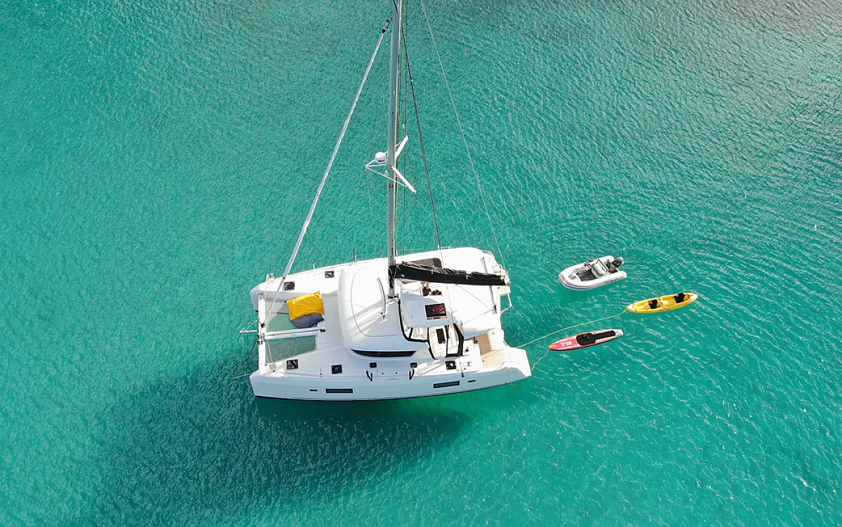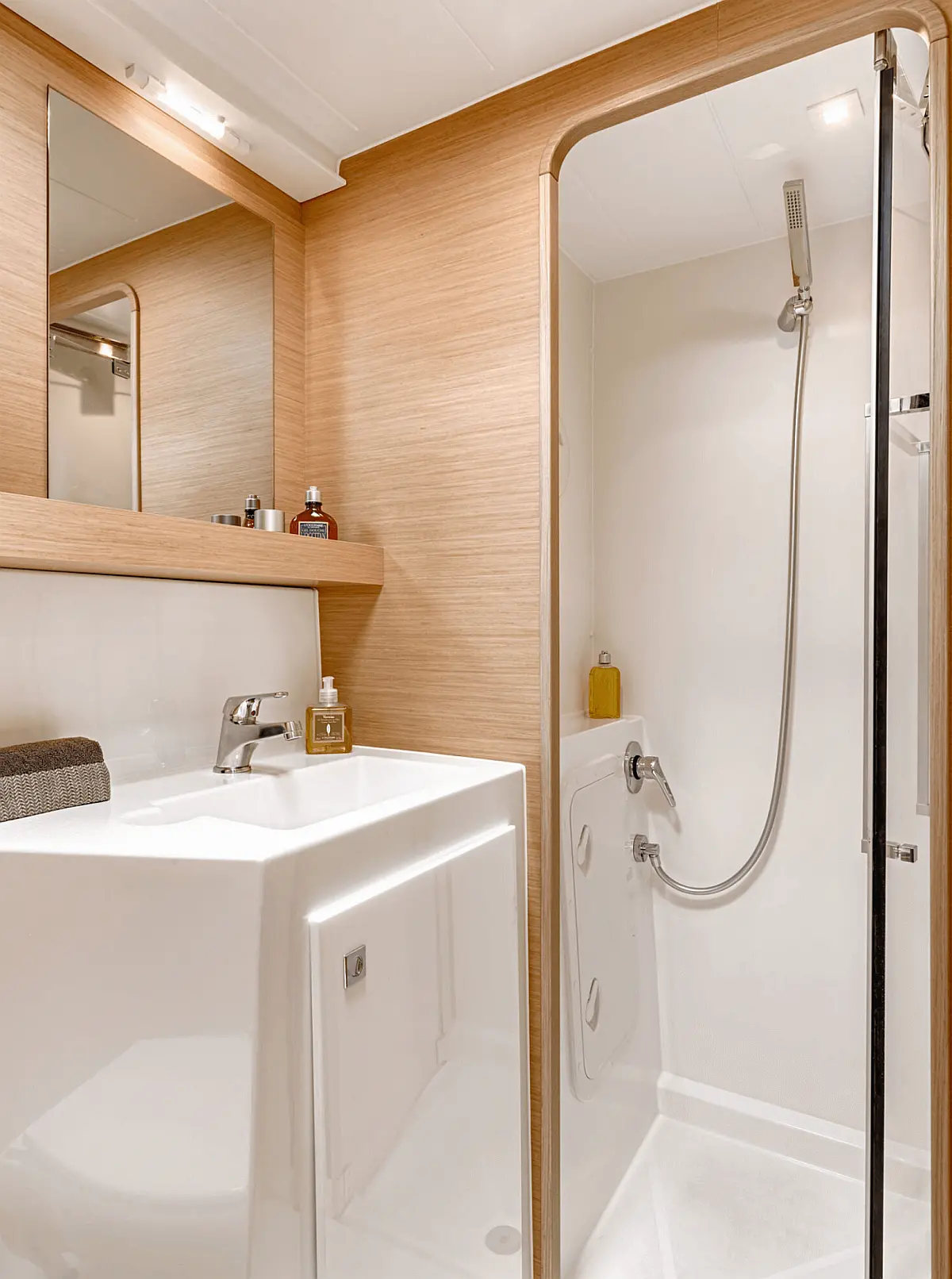 Bimini, Sprayhood, Cockpit-Kissen, Lautsprecher im Cockpit, Klimaanlage, Elektrische Winch (Segel), Außenbordmotor, Generator, Elektrische Toilette, Beiboot, Solar-Panele, Inverter, Kühlschrank, Wassermacher, Teakdeck, Kaffeemaschine