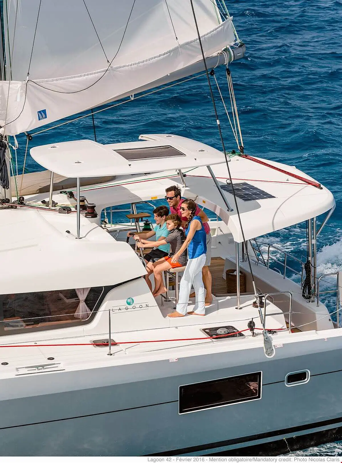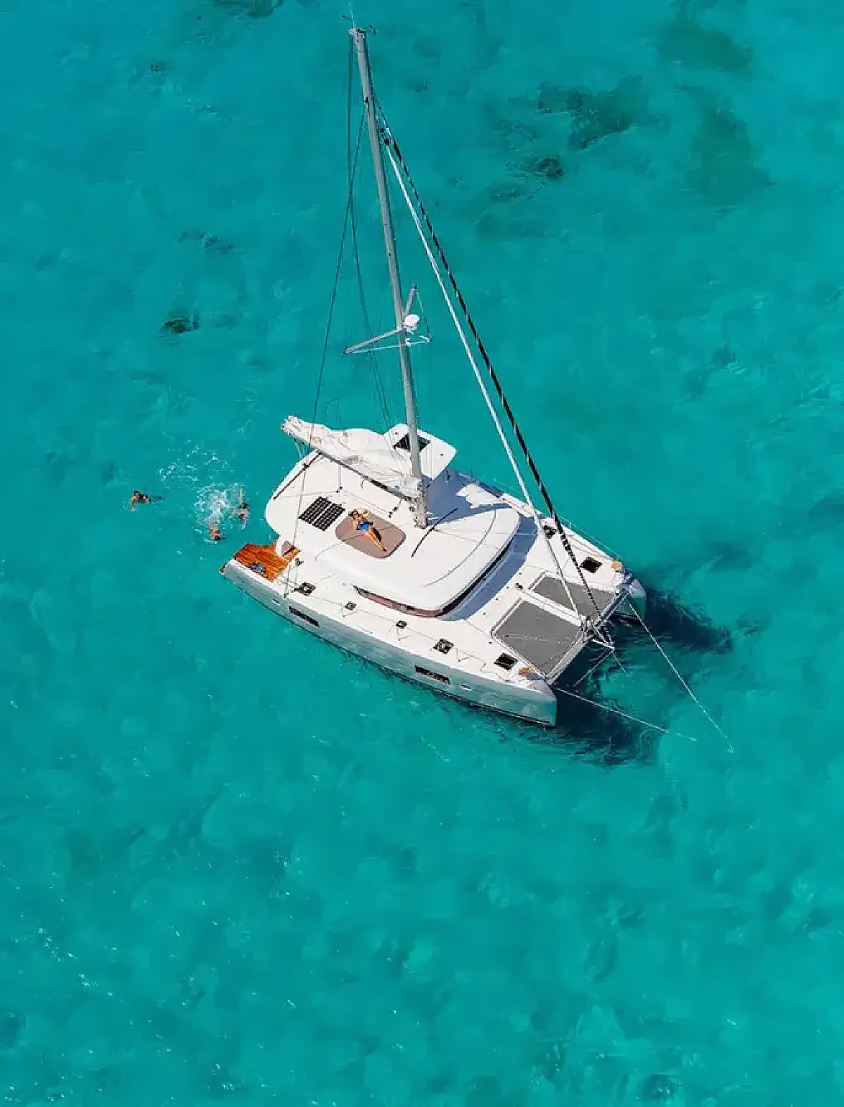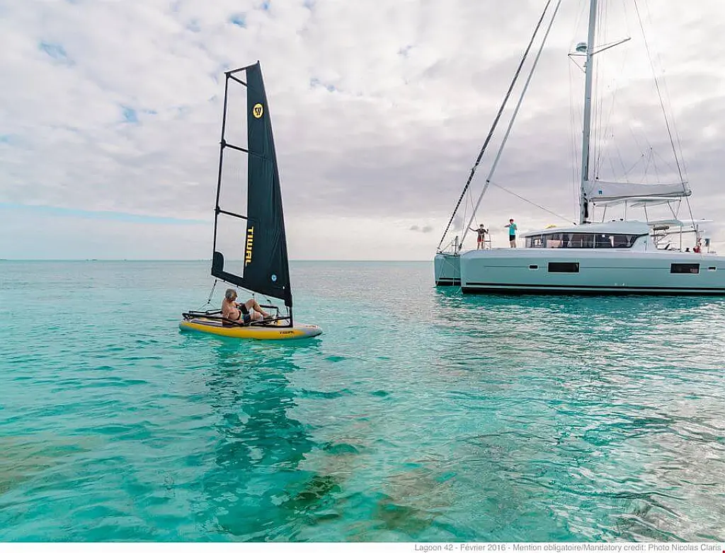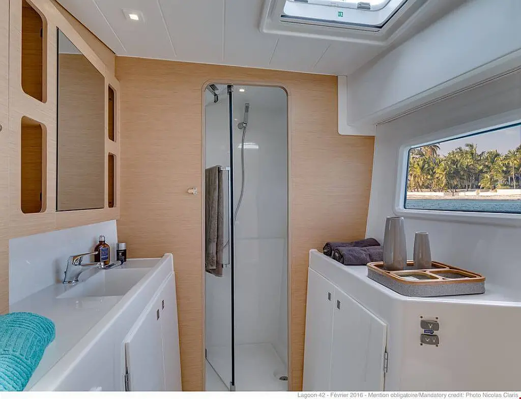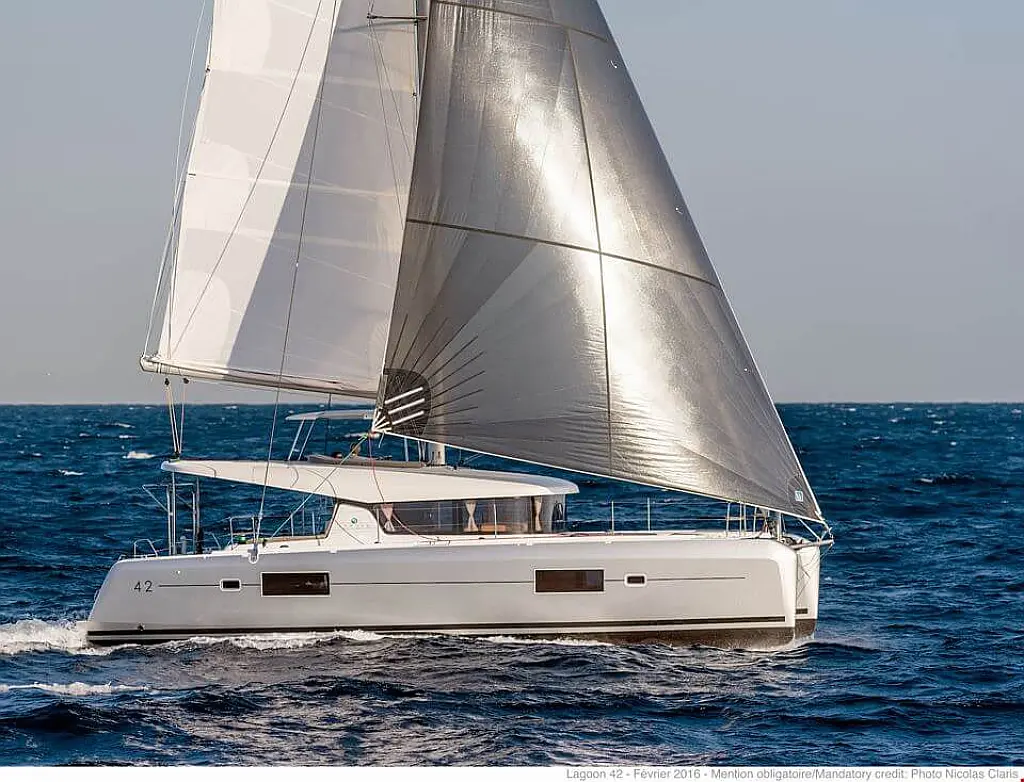 Bimini, Sprayhood, Cockpit-Kissen, Lautsprecher im Cockpit, Klimaanlage, Elektrische Winch (Segel), Außenbordmotor, Generator, Elektrische Toilette, Beiboot, Solar-Panele, Inverter, Kühlschrank, Wassermacher, Teakdeck, Kaffeemaschine